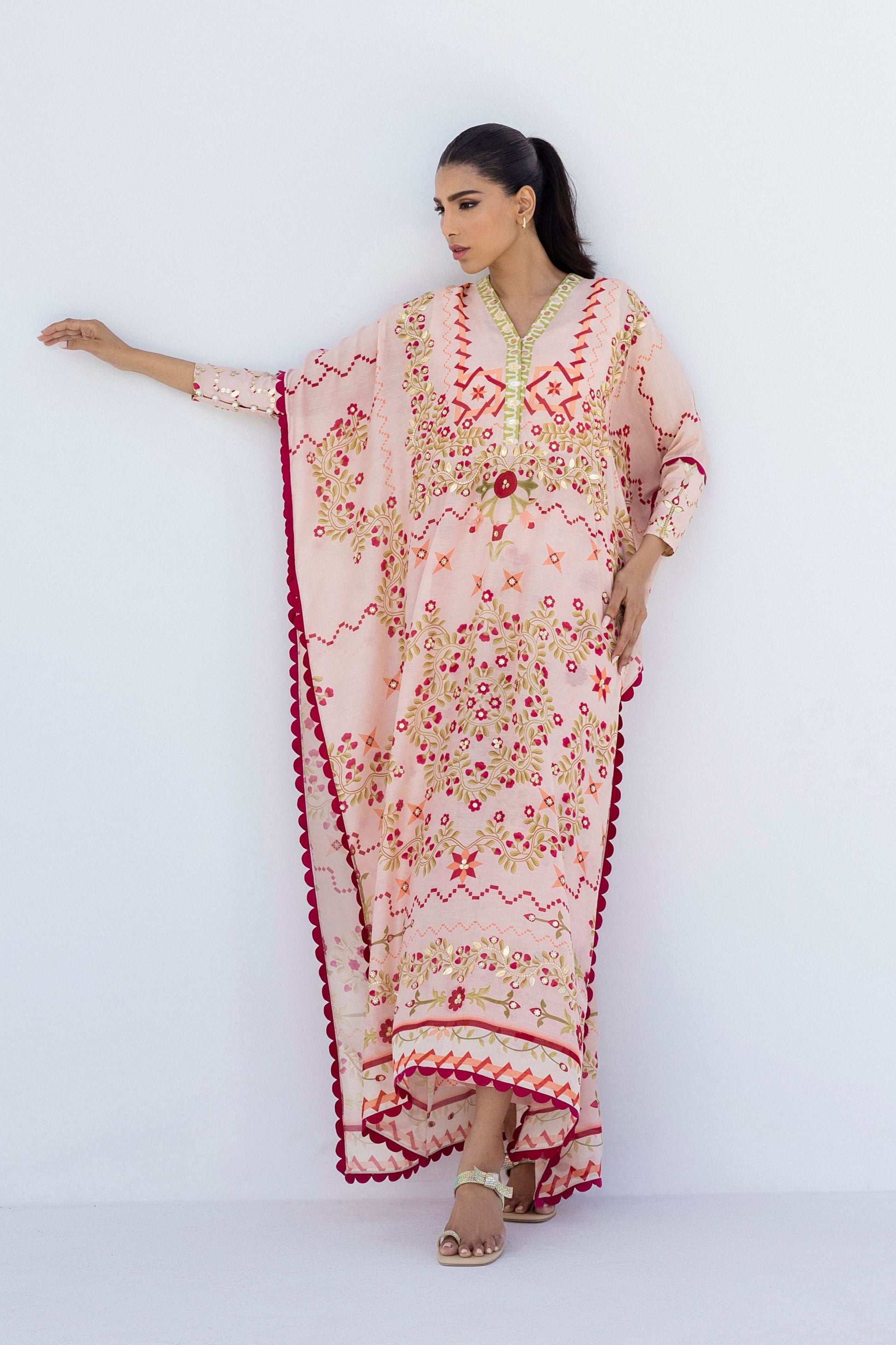 Crafted from khaddi silk, this blush quartz kaftan is intricately adorned with gota accents, elevating the filigree floral print in crimson and muted olive hue. The flowing silhouette features scalloped hemlines and sides, while the applique neckline is embellished with sequin and gota embroidery. Complete the look with matching pure rawsilk trousers, striking a harmonious blend of whimsy and understated elegance.