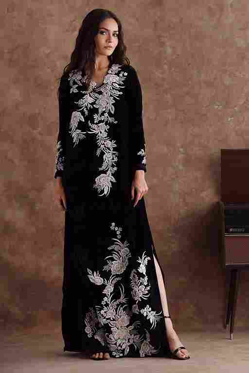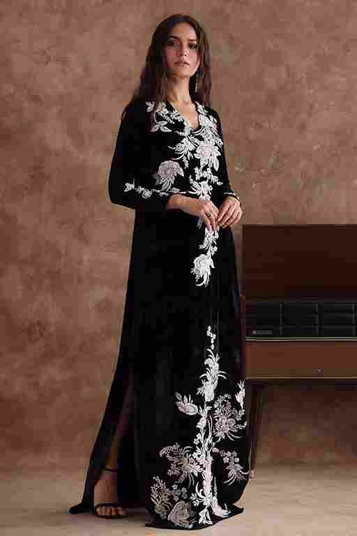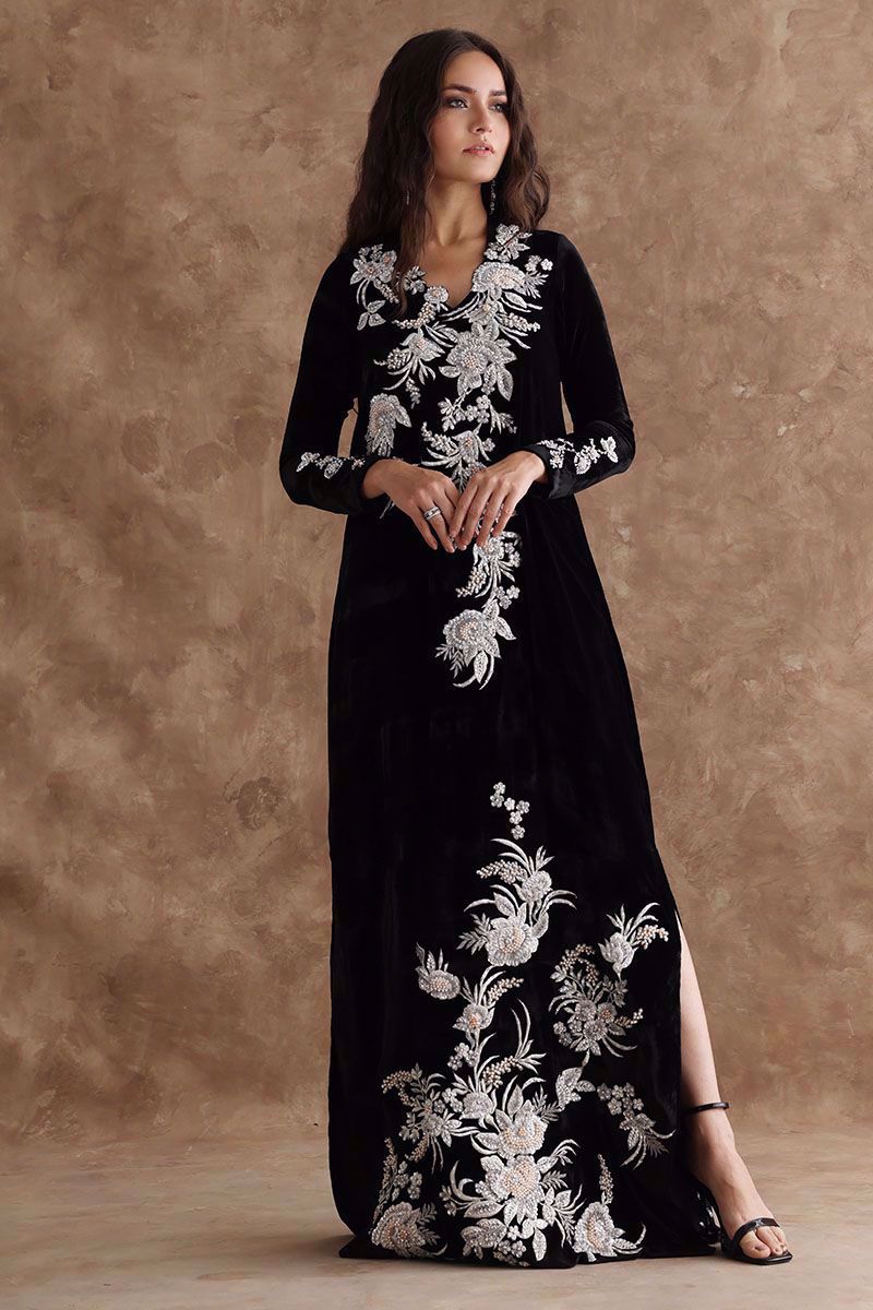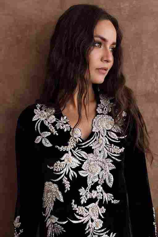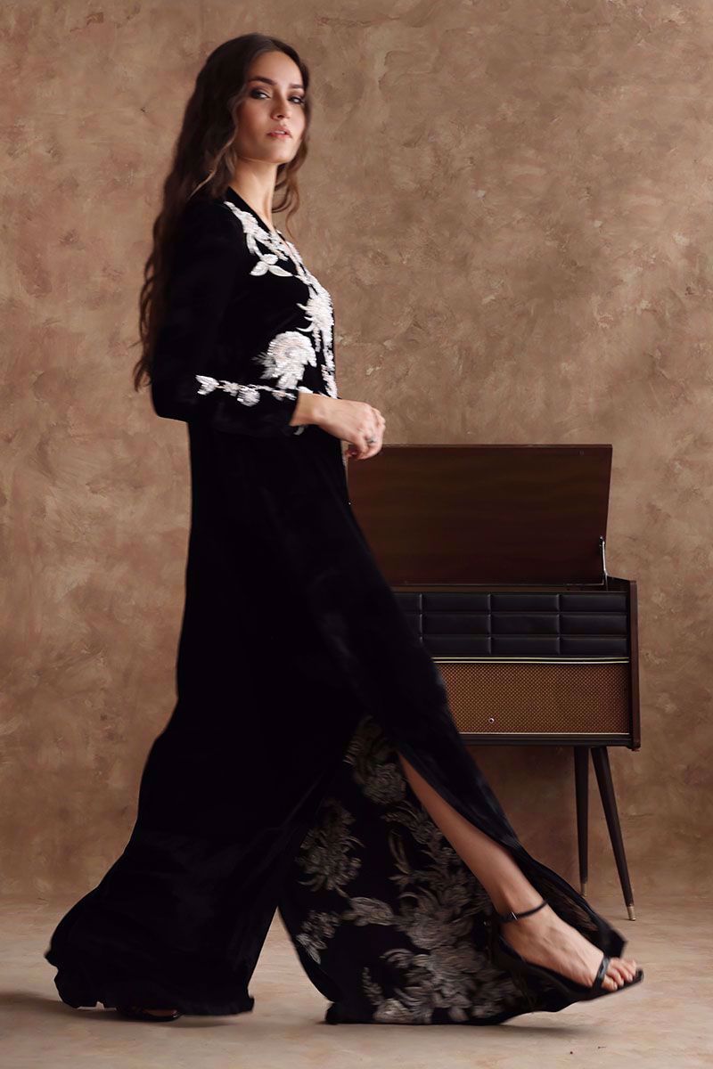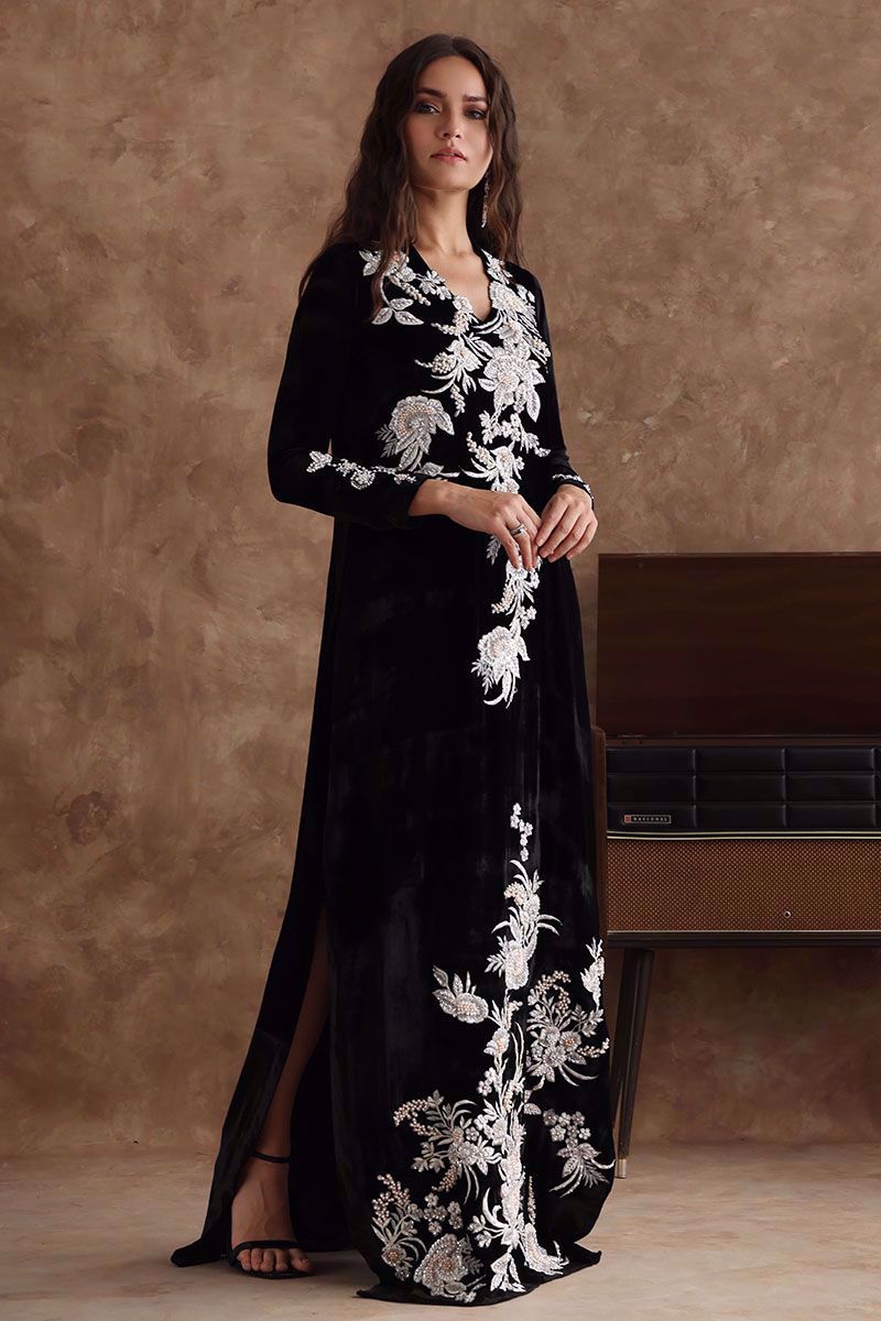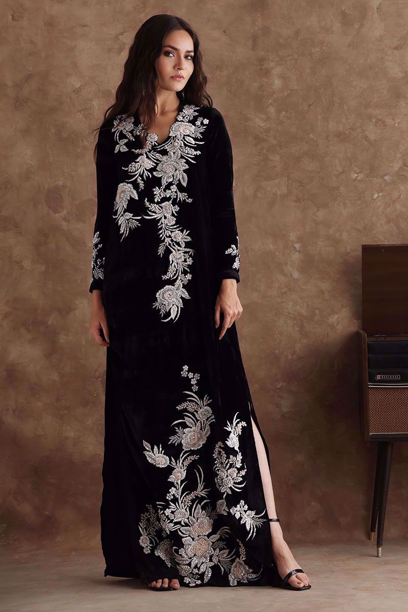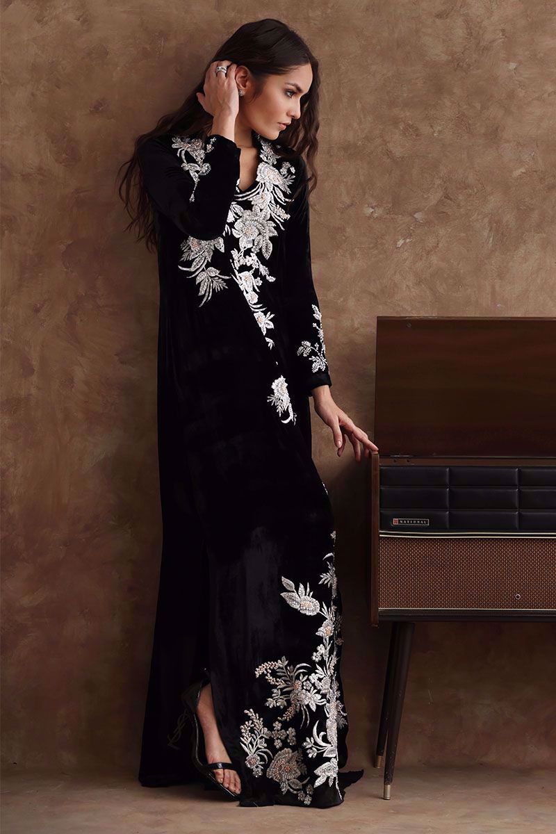 Black majestic kaftan in pure velvet is a perfect attire for winter evenings. The kaftan is aesthetically embroidered with resham, cut dana, sequins, and bead work, to create a subdue look. *The length of the shirt is 58 inches. Outfit can be Customized in silk fabric.