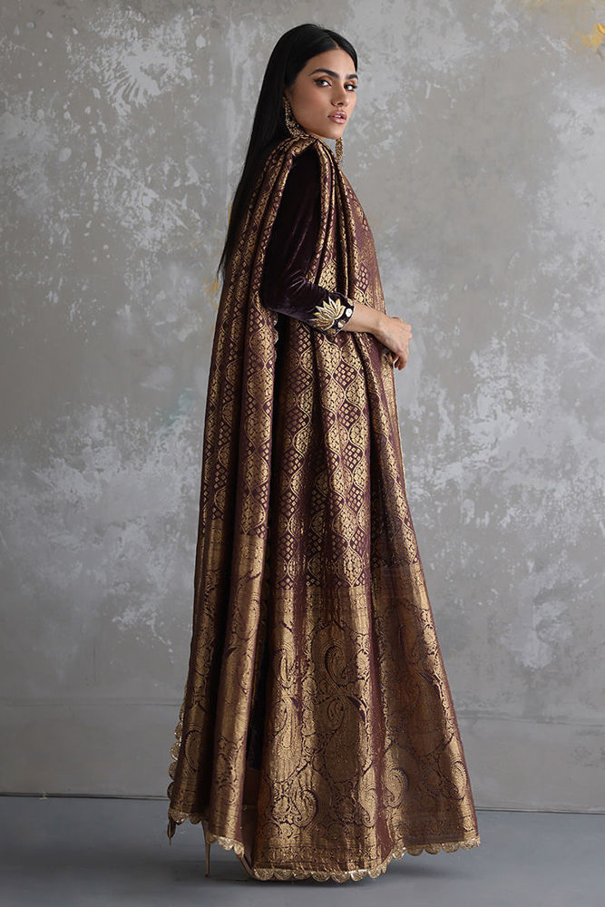 This Taupe velvet long shirt is a must have for winters wardrobe with beautiful neckline and sleeves of zari, gota, sequins, stones and zardozi work. Matching color pure banarsi chiffon chadar and same color pure raw silk pants are paired on additional cost to give a regal look to the attire.