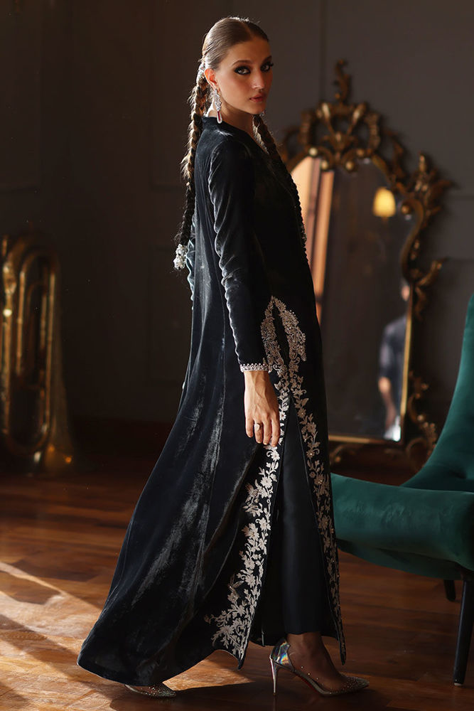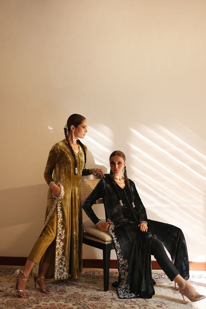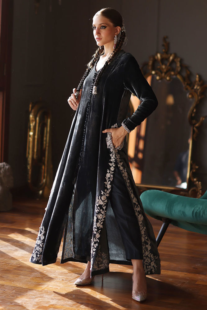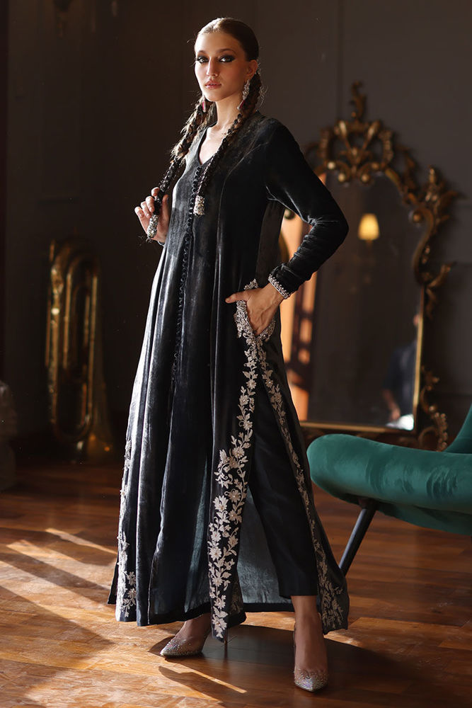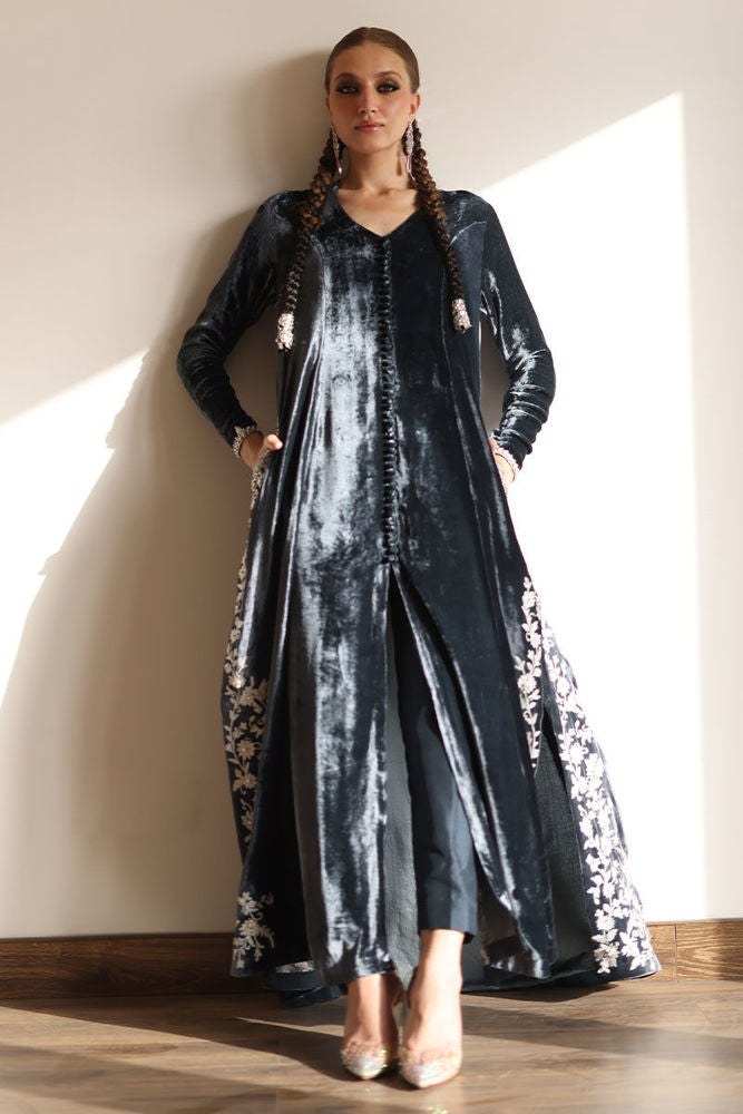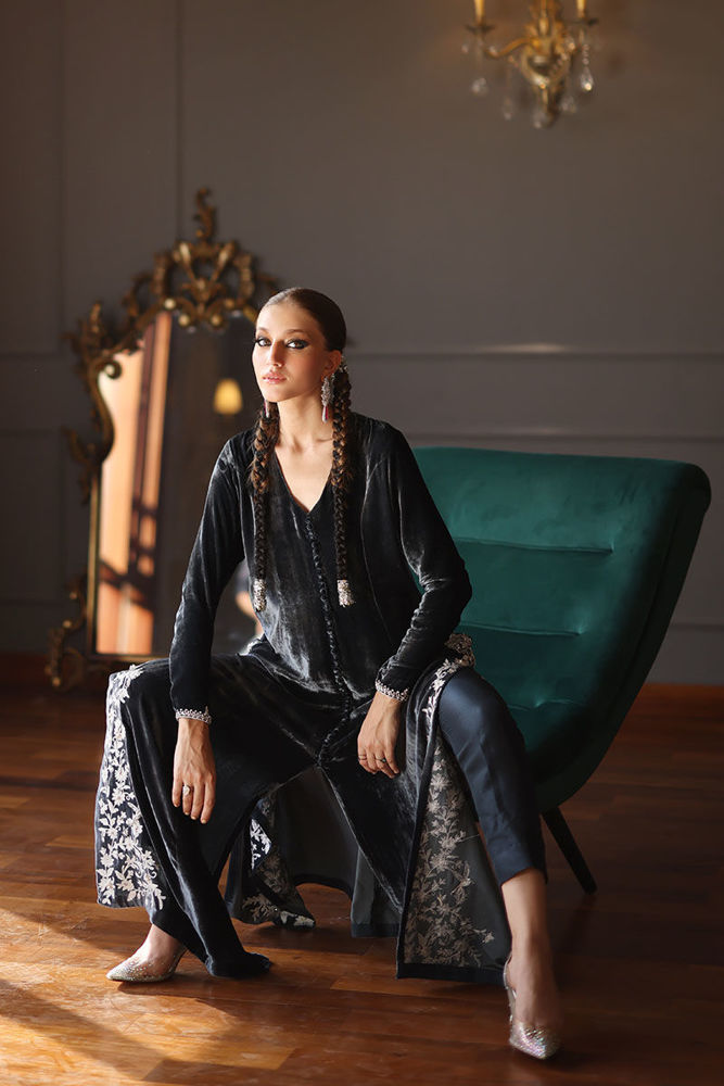 Step into elegance with our steeple grey velvet prince panel shirt ensemble. The steeple grey hue exudes sophistication, and the exquisite ivory resham ari work, hand-touched on all four side slits, adds an artisanal touch. To complete the ensemble, the shirt features pure zardozi handwork of dabka and naqshi on the pockets. To complete your look pure raw silk pants, offer the ideal balance of comfort and style. It includes Shirt and Pants. length 52/53
