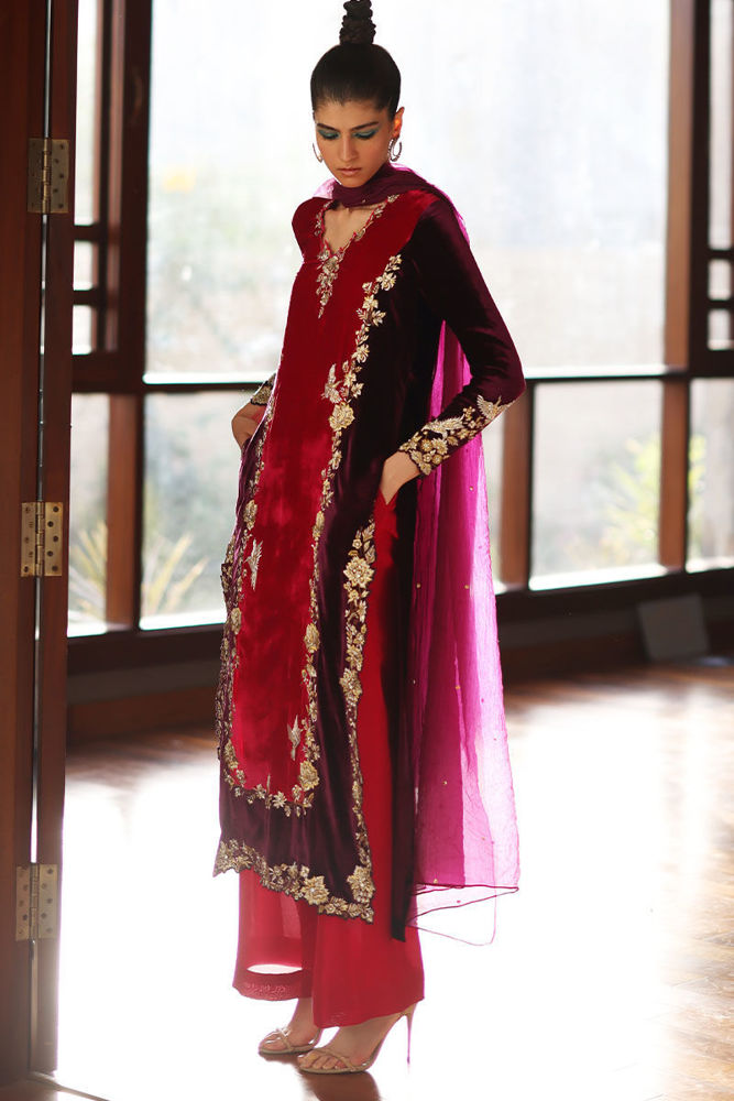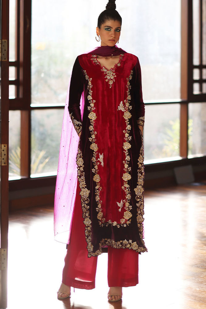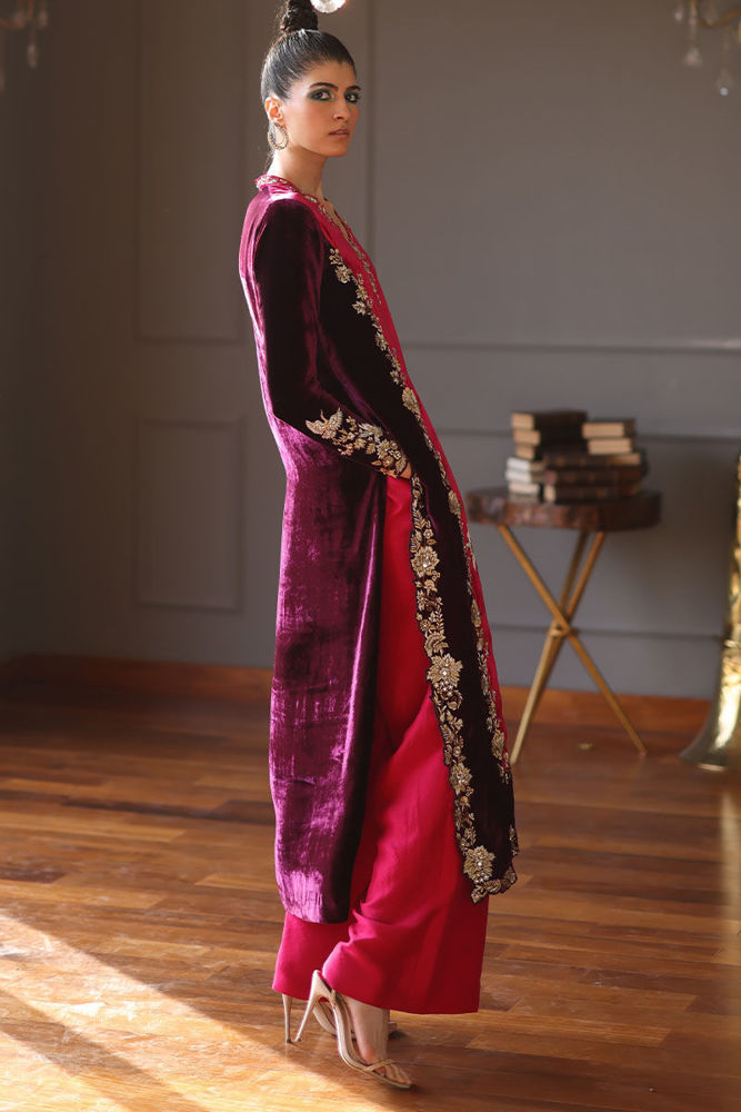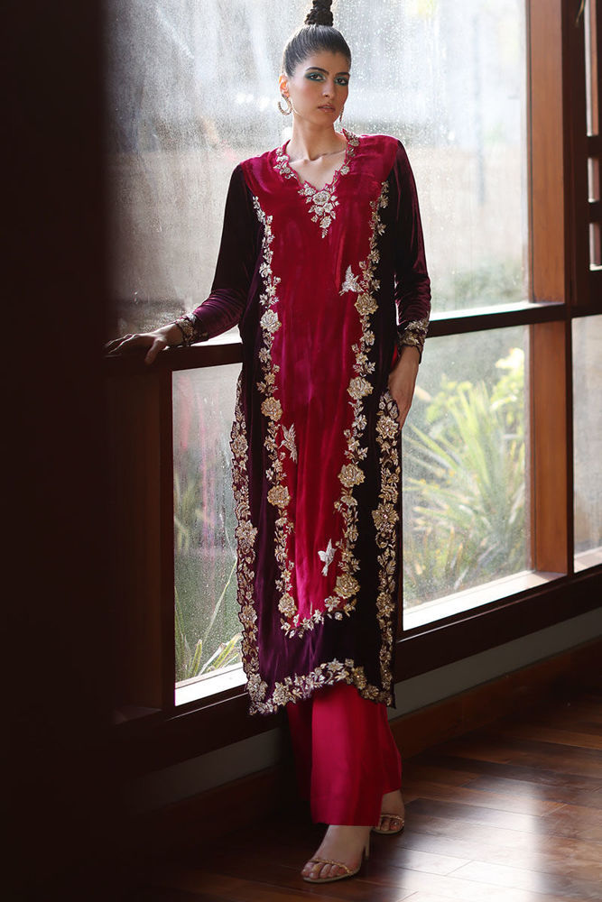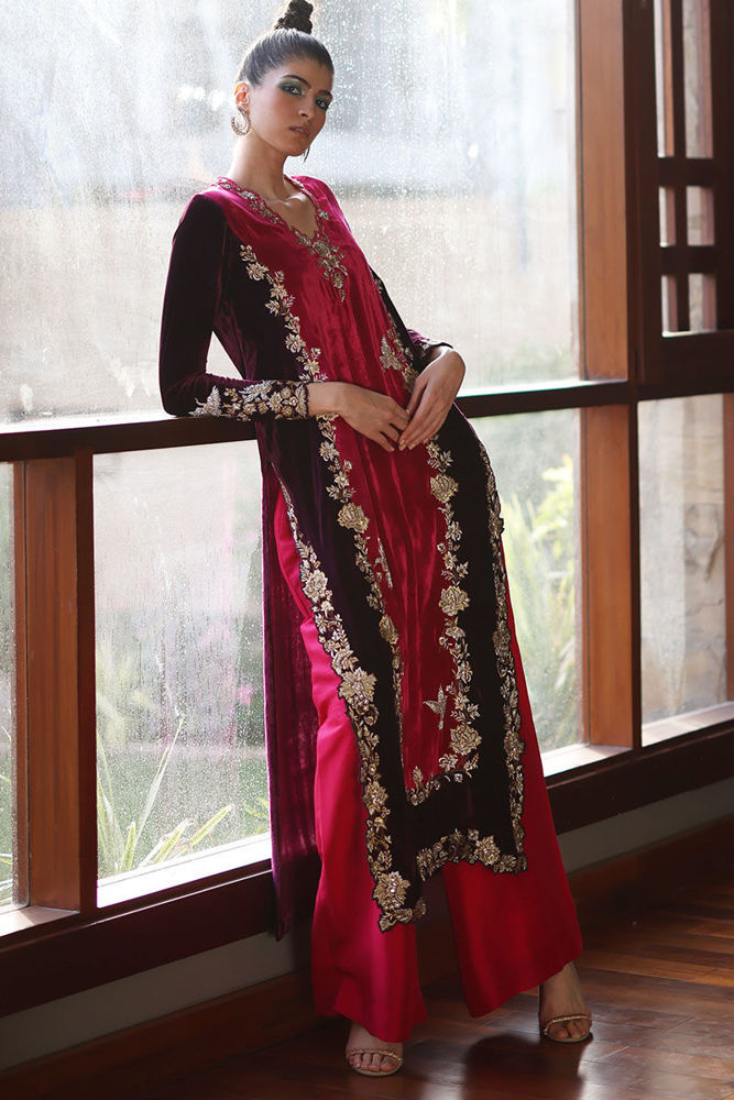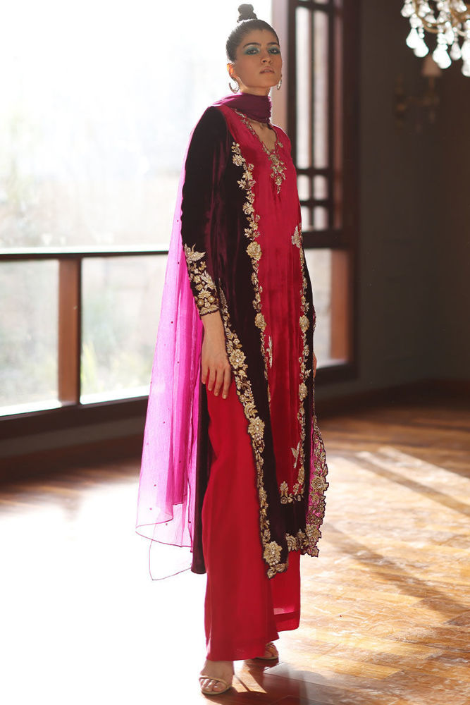 Drape yourself in sophistication with our shadow plum velvet ensemble. The pure silk velvet shirt, in a captivating shadow plum color block, features intricate zari, kora, dabka, naqshi, tiki stone, and sequence work on sleeves and neckline. Paired with pure rawsilk cullottes and a diamond organza silk dupatta with Sequence Chan detailing, this ensemble is the epitome of elegance. Make a statement of refined style at any event with this exquisite ensemble.
