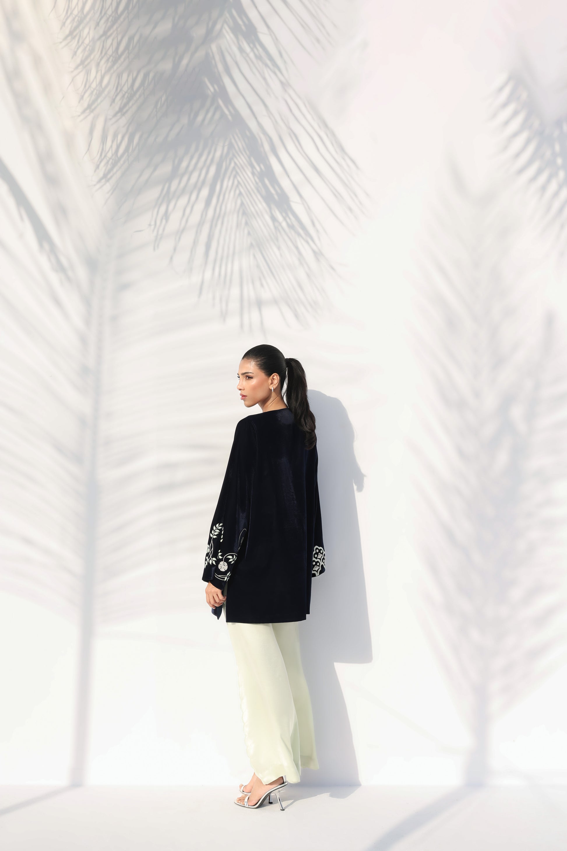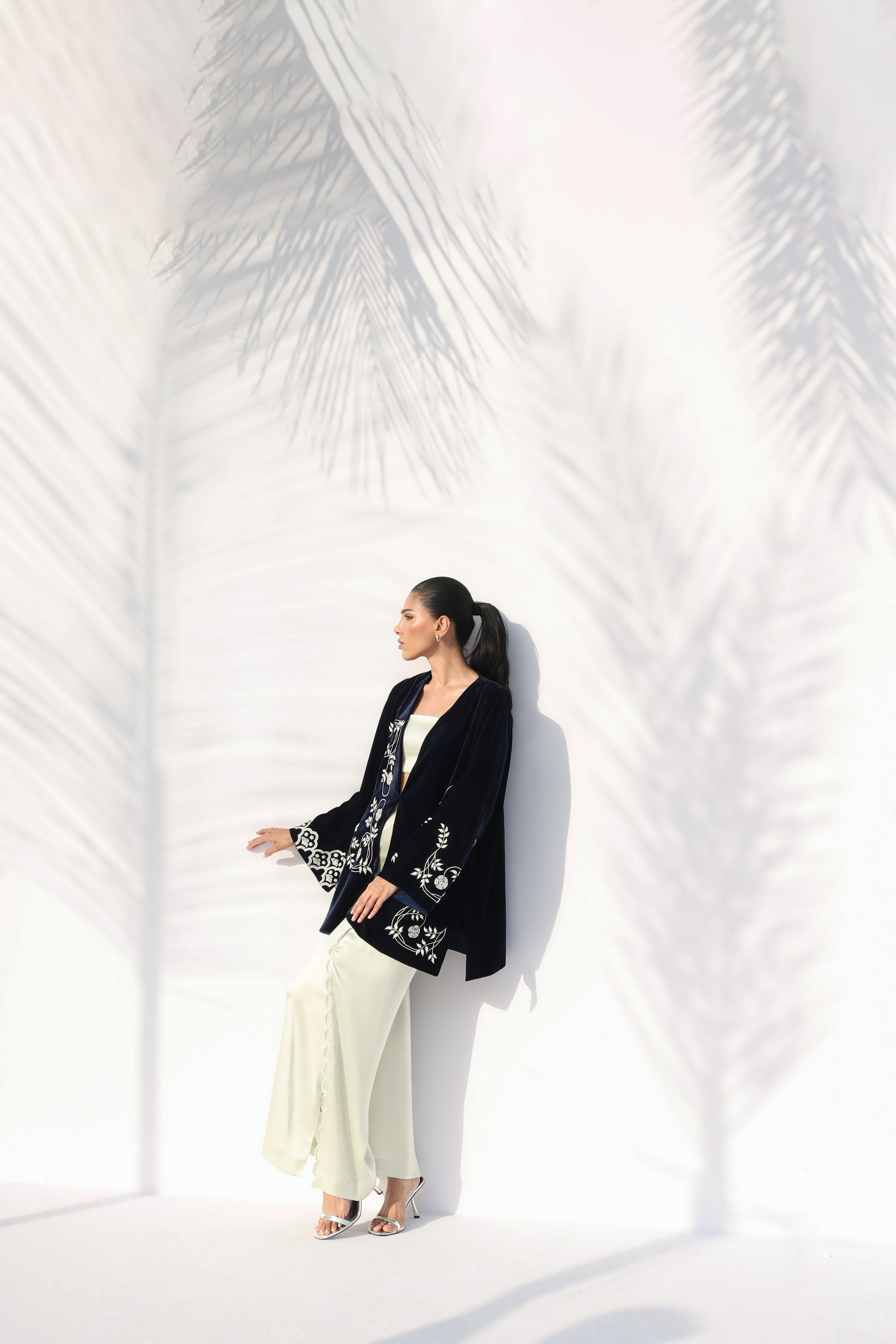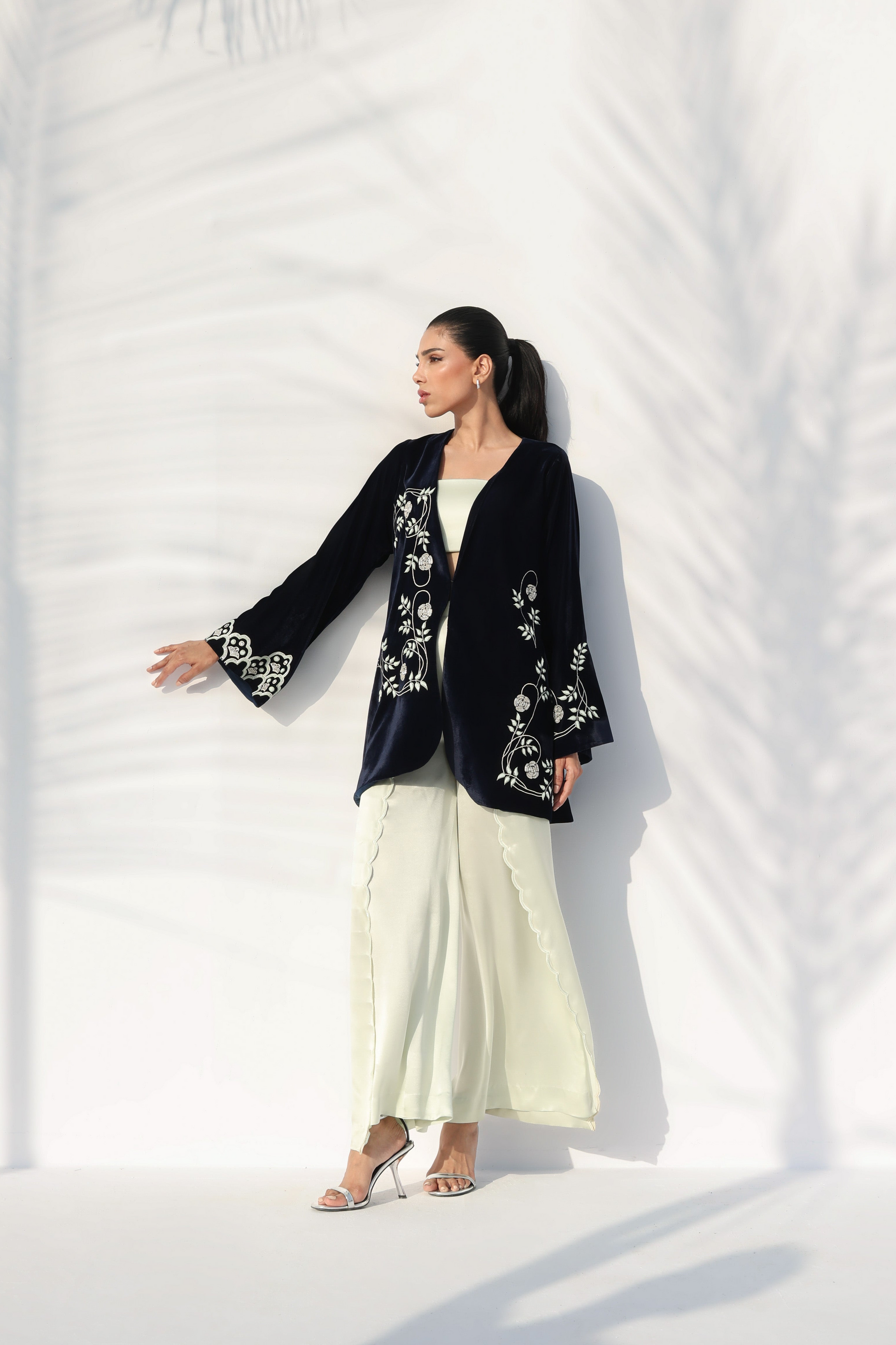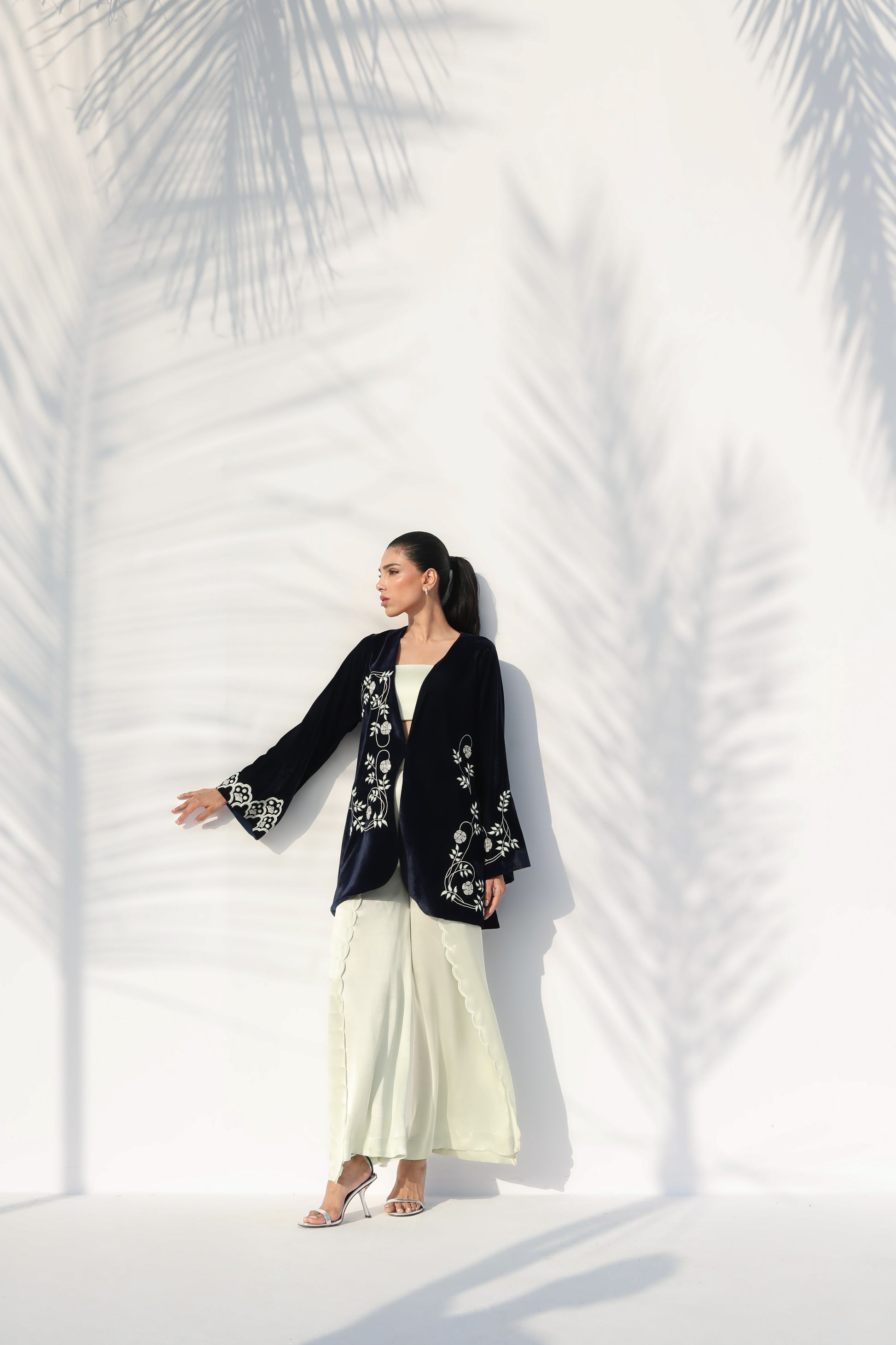 Bathed in midnight blue, this velvet jacket exudes refined grandeur through its fluid silhouette and exquisite threadwork with embellishment. Intricate botanical embroidery and flared sleeves bring a touch of quiet drama. Paired with an ivory tube top and scallop-detailed wide leg overlap pants in charmeuse, the look embodies modern sophistication.