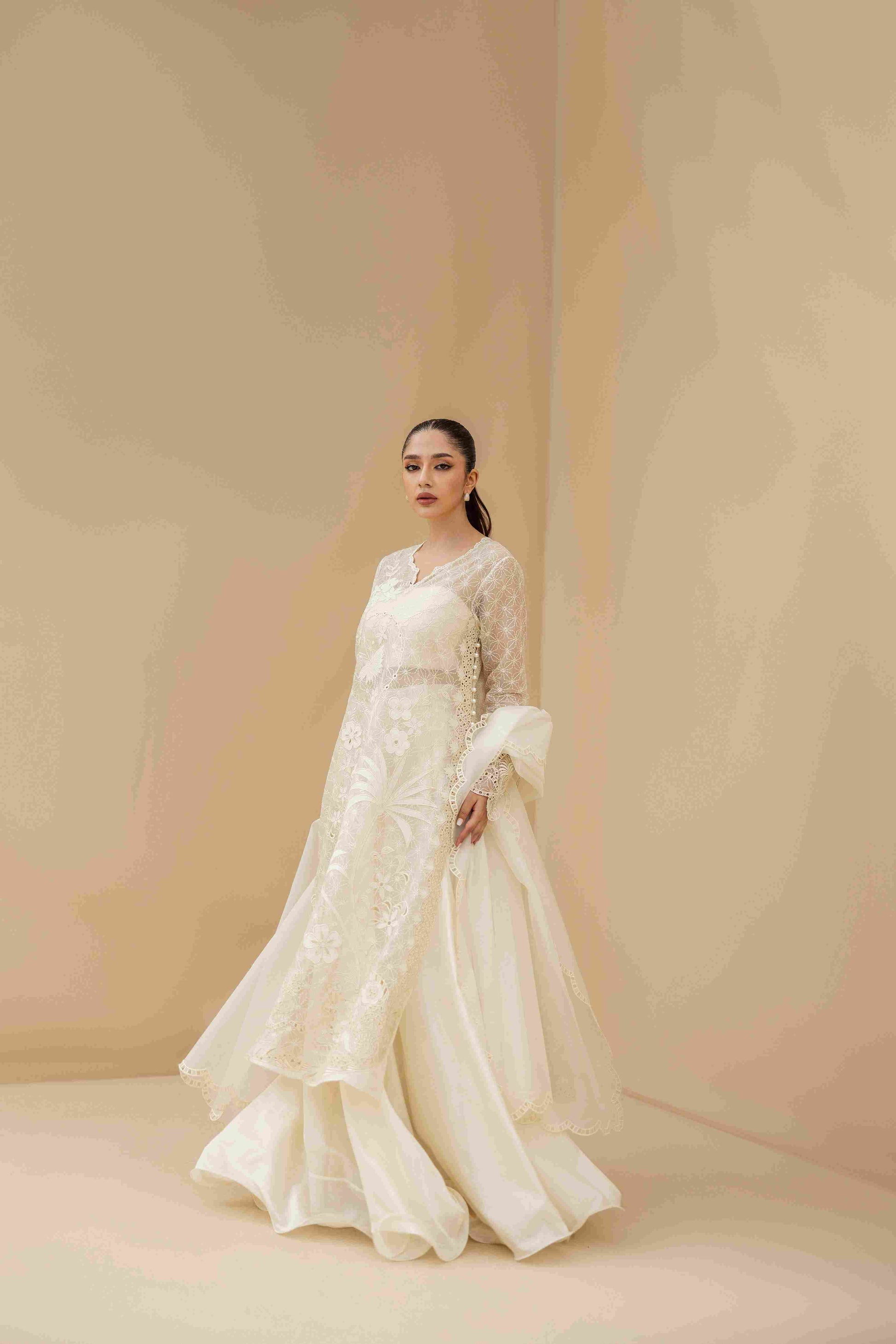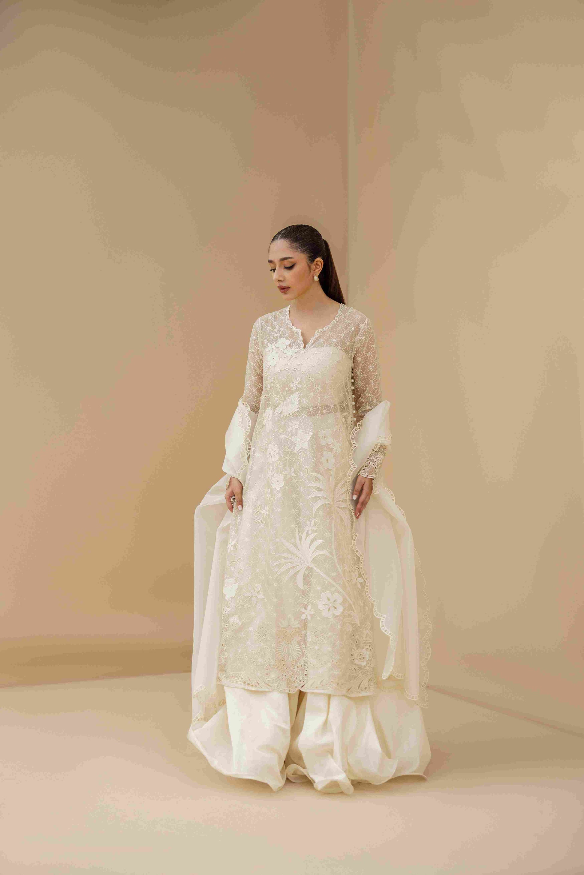 An ode to ivory serenity, this ensemble unfolds in sheer organza embroidered with tonal florals, lattice vines and delicate appliqué and eyelet details, shimmering softly with sequins. The long fluid shirt features a scalloped neckline and diaphanous sleeves. It is paired with voluminous khaddi silk dhaka pajama and completed with a matching organza dupatta edged in scalloped eyelet embroidery, capturing the essence of timeless elegance.