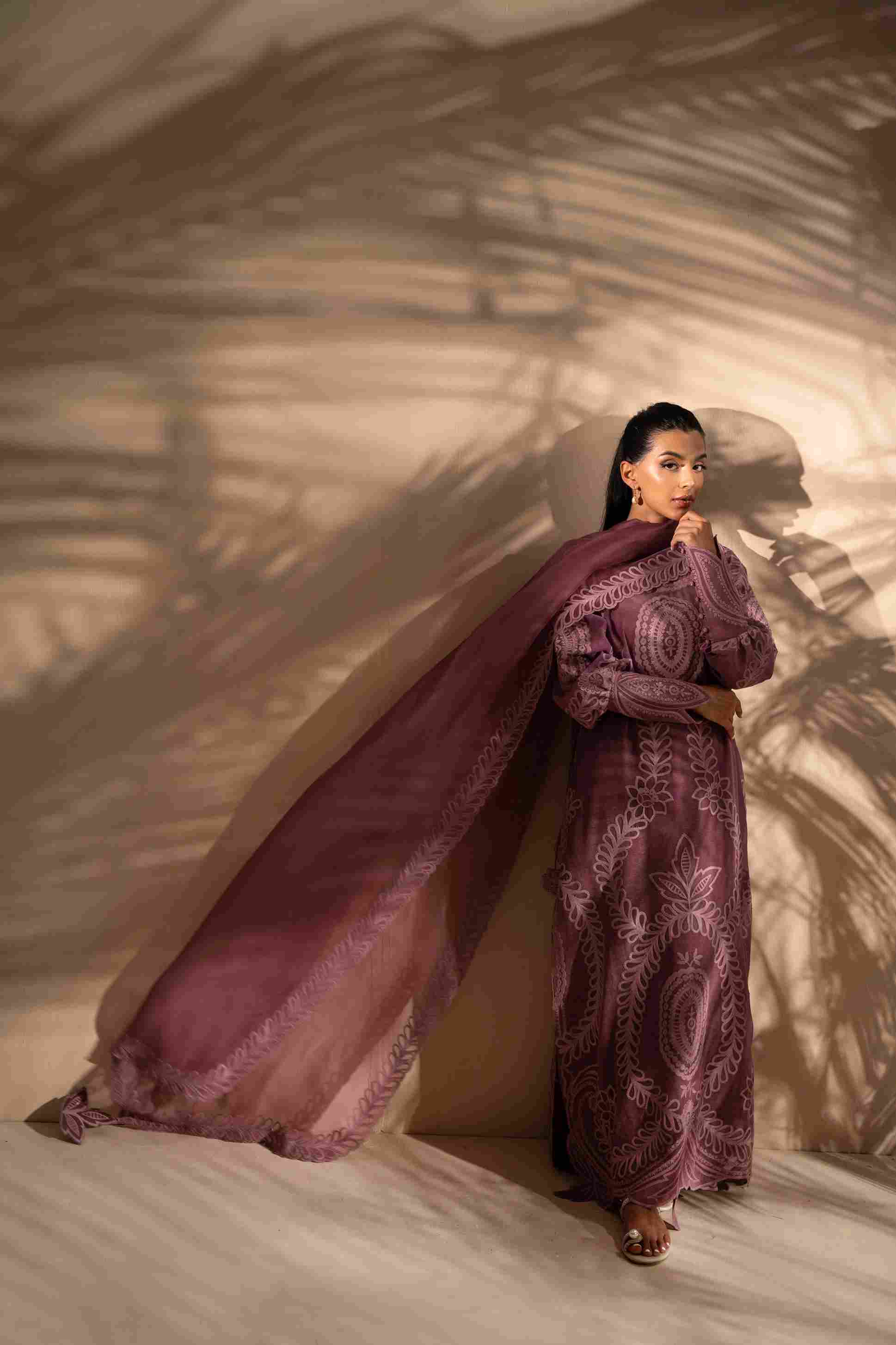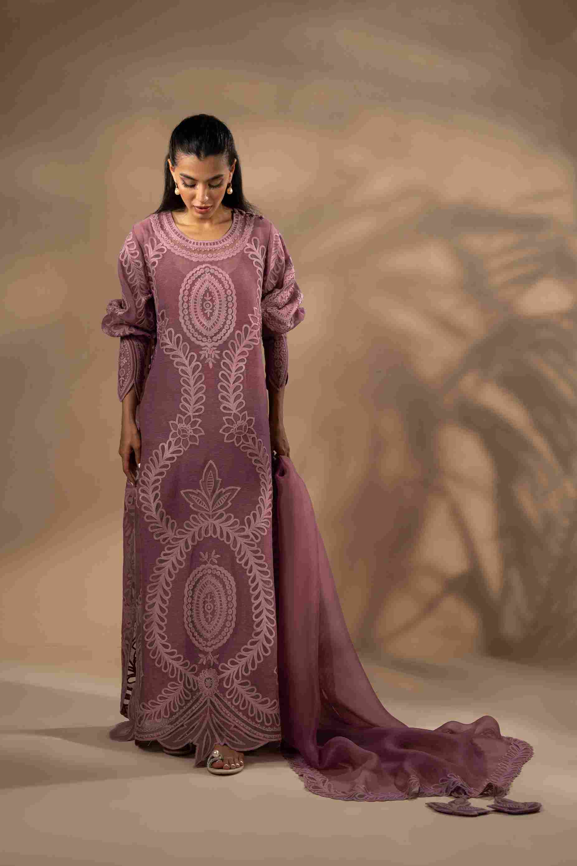 A sublime creation in a plum tone, this khaddi corduroy kaftan is adorned with ornate aari embroidery. Accented with dramatic scalloped cuffs, it pairs flawlessly with tailored trousers edged in intricately scalloped hems with organza eyelet inserts. A flowing organza dupatta in a matching hue completes the look, making a statement with delicate 3D tassels.