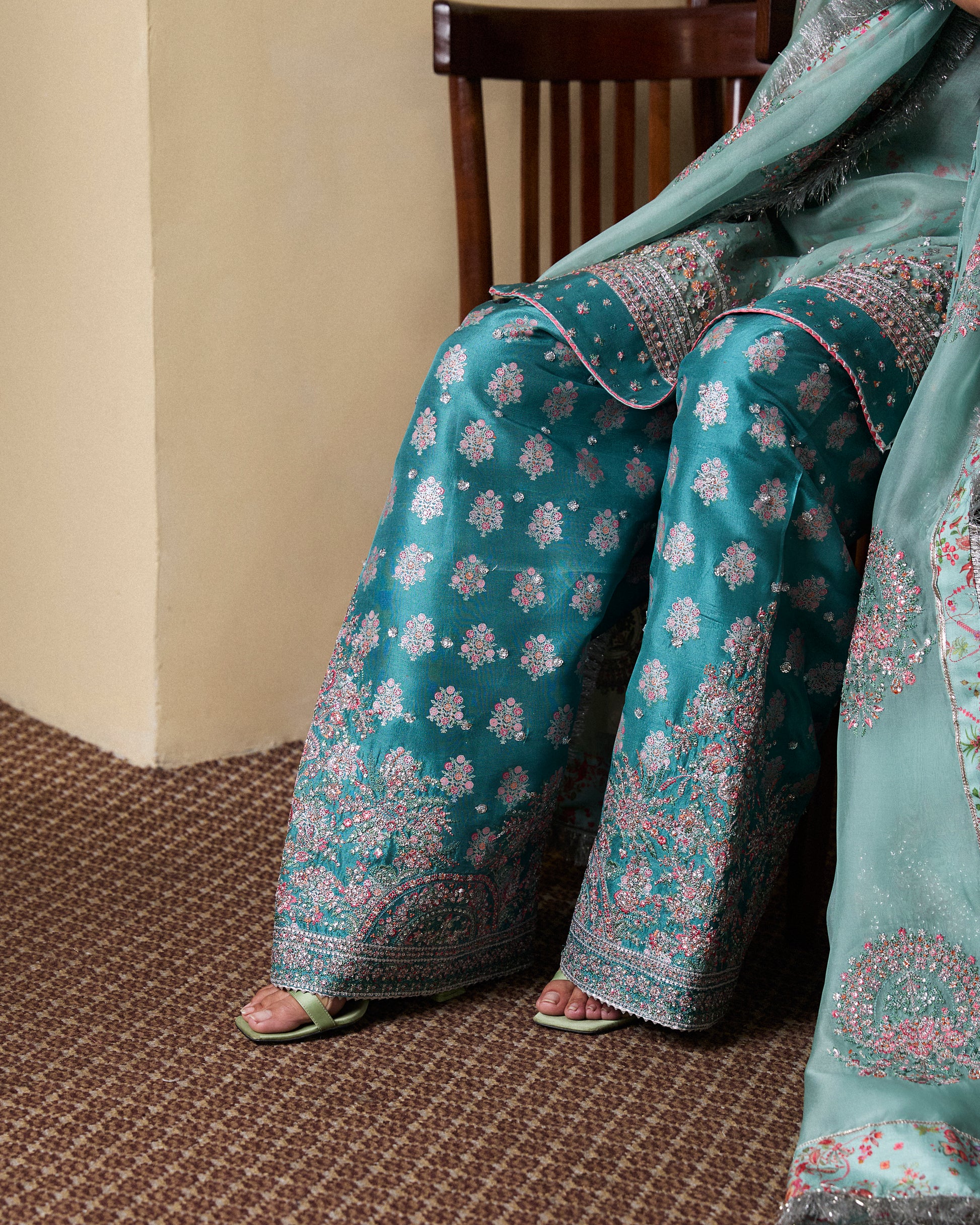 Turn heads and captivate with the rich elegance of this teal blue shalwar, crafted from pure raw silk for a luxurious look. Paired with an ice blue organza shirt, hand-embellished with intricate details and puff sleeves, this ensemble exudes elegance and sophistication. The unique fusion of opulence and modern design makes this outfit a showstopper. Stand out in any crowd with this timeless masterpiece – a perfect blend of class and charm.