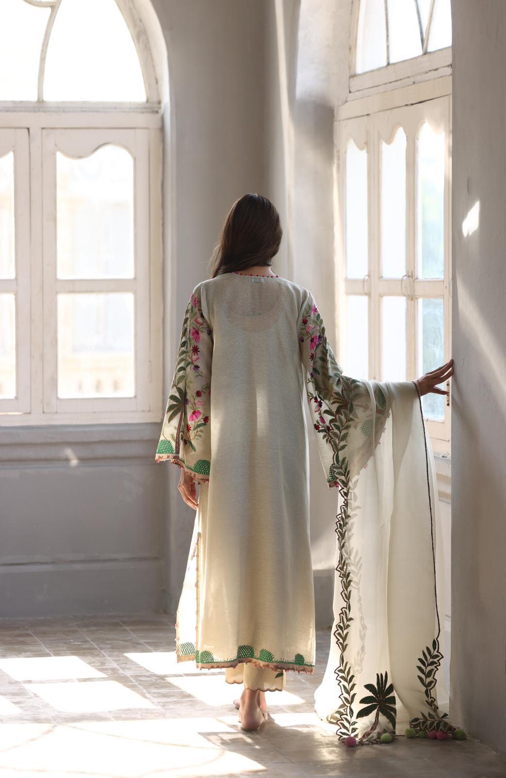Description: The epitome of effortless grace, a khaddi corduroy shirt in the lightest hue of celadon is intricately embroidered with vibrant botanical and palm motifs. The relaxed silhouette is complemented with matching pure rawsilk scalloped trousers. Paired with a cascading organza dupatta featuring botanical sprigs embroidered on the scalloped borders and playful pompom accents.