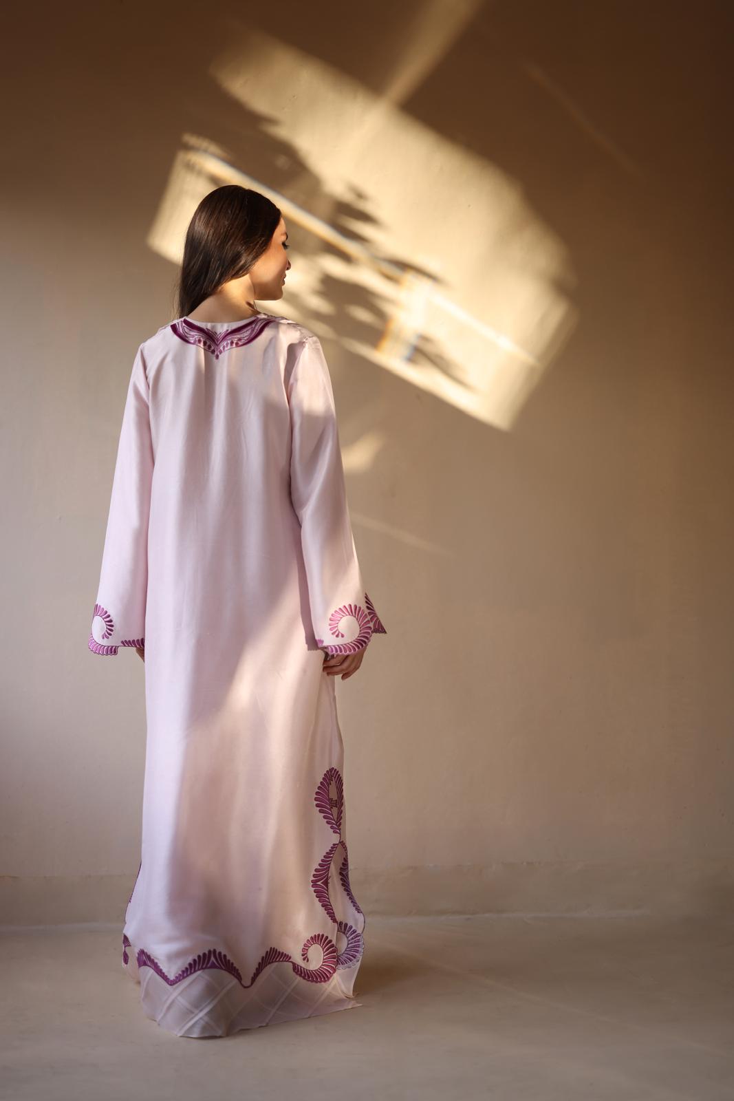 Enveloped in a misty rose hue, this statement kaftan captivates with its intricate violet embroidery, evoking a sense of regal opulence. The fluid silhouette is adorned with delicate botanical embroidery while scalloped edges and fabric manipulation on the hemline lend an artisanal touch. Paired with pure rawsilk matching trousers.