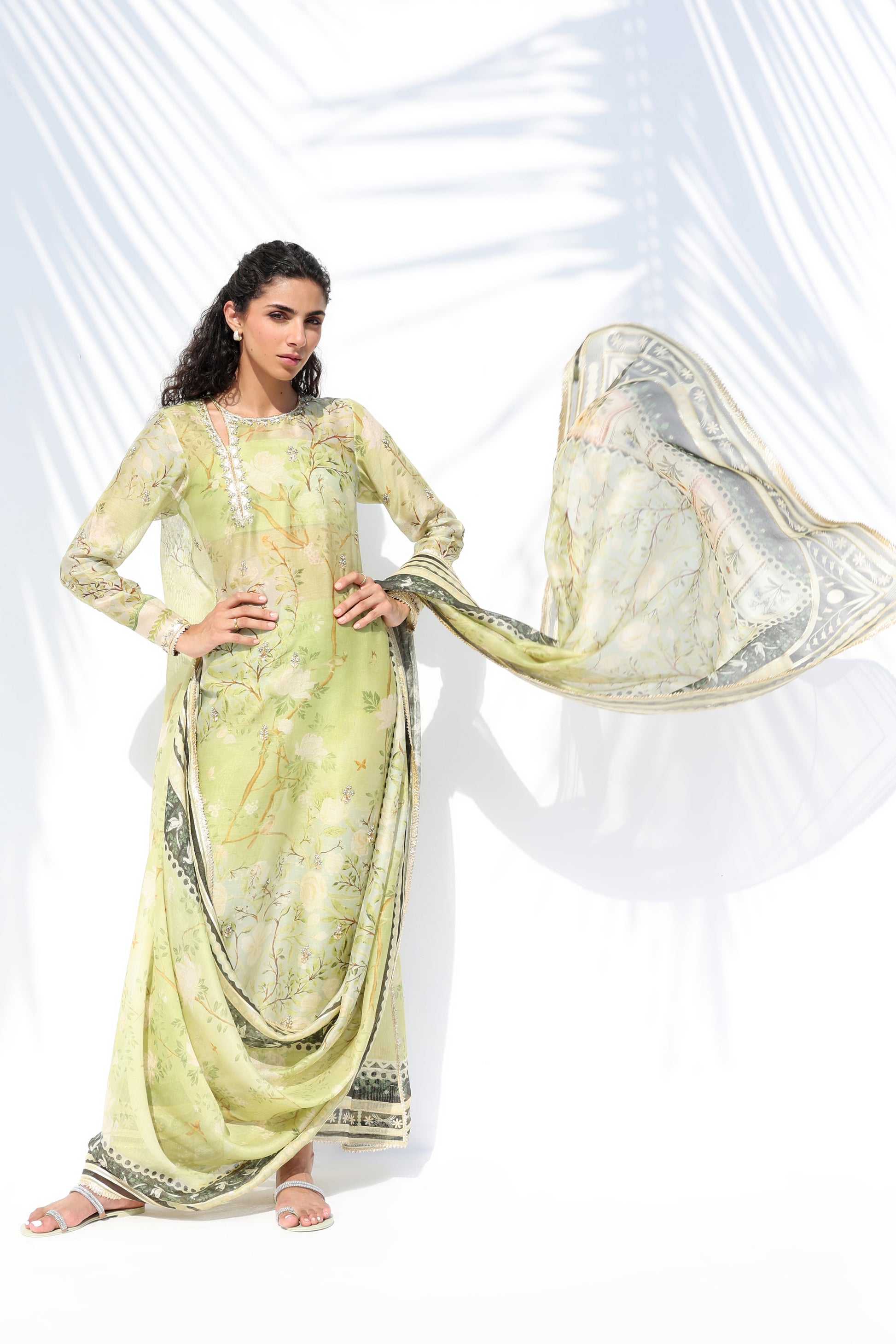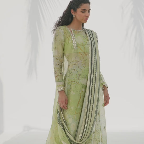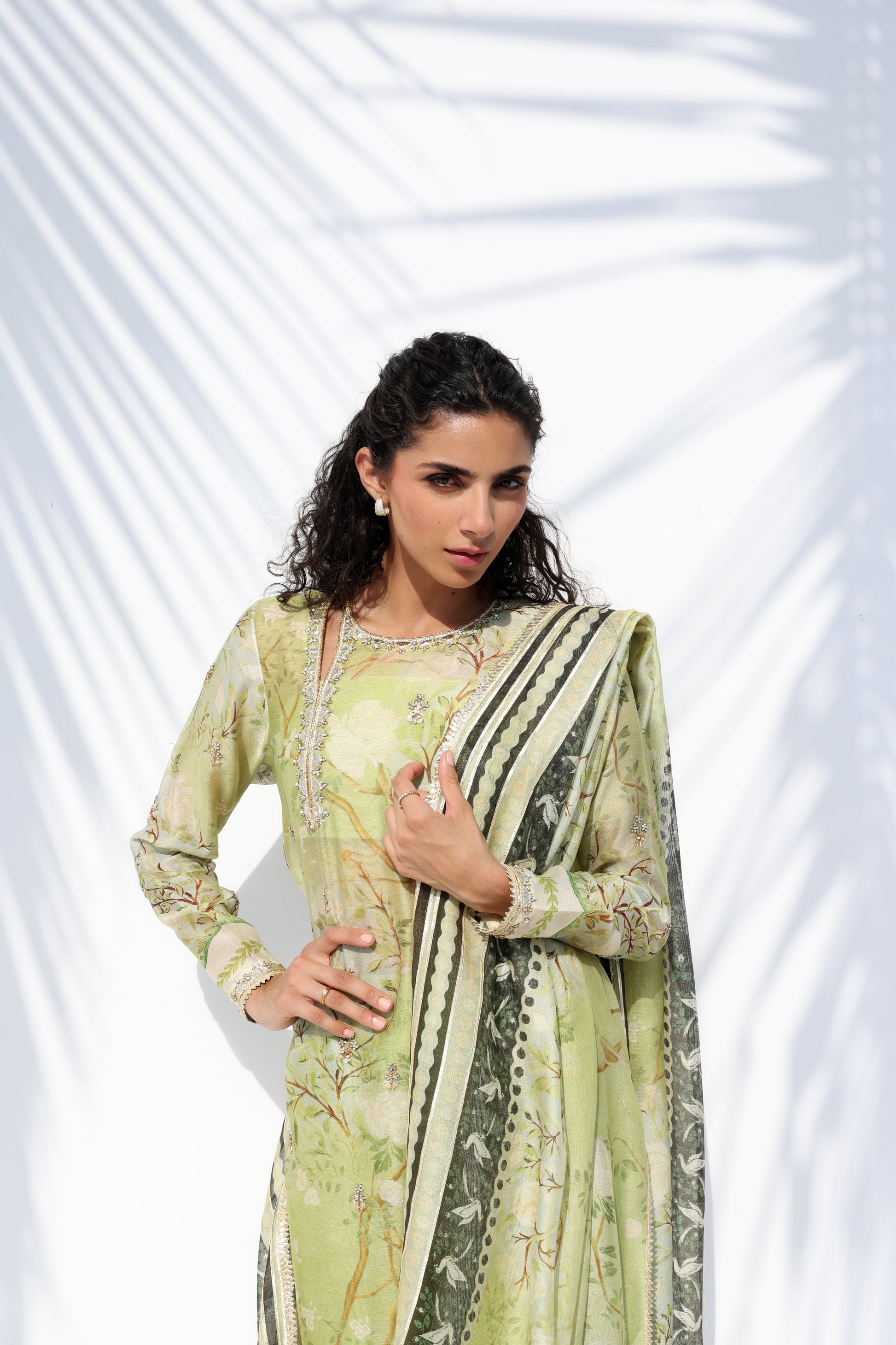Radiating a luminous, ethereal charm, this ivory hued ensemble features an oversized sheer organza shirt, meticulously embellished with tonal floral aari work and scattered embroidery. The silhouette is defined by a bold V neckline framed with floral motifs, layered over a matching crepe camisole for a refined play on transparency. Statement sleeves and a scalloped hem lend textured depth, while lustrous pure rawsilk shalwar adds a fluid, modern drape, completing the monochromatic look with effortless grace.