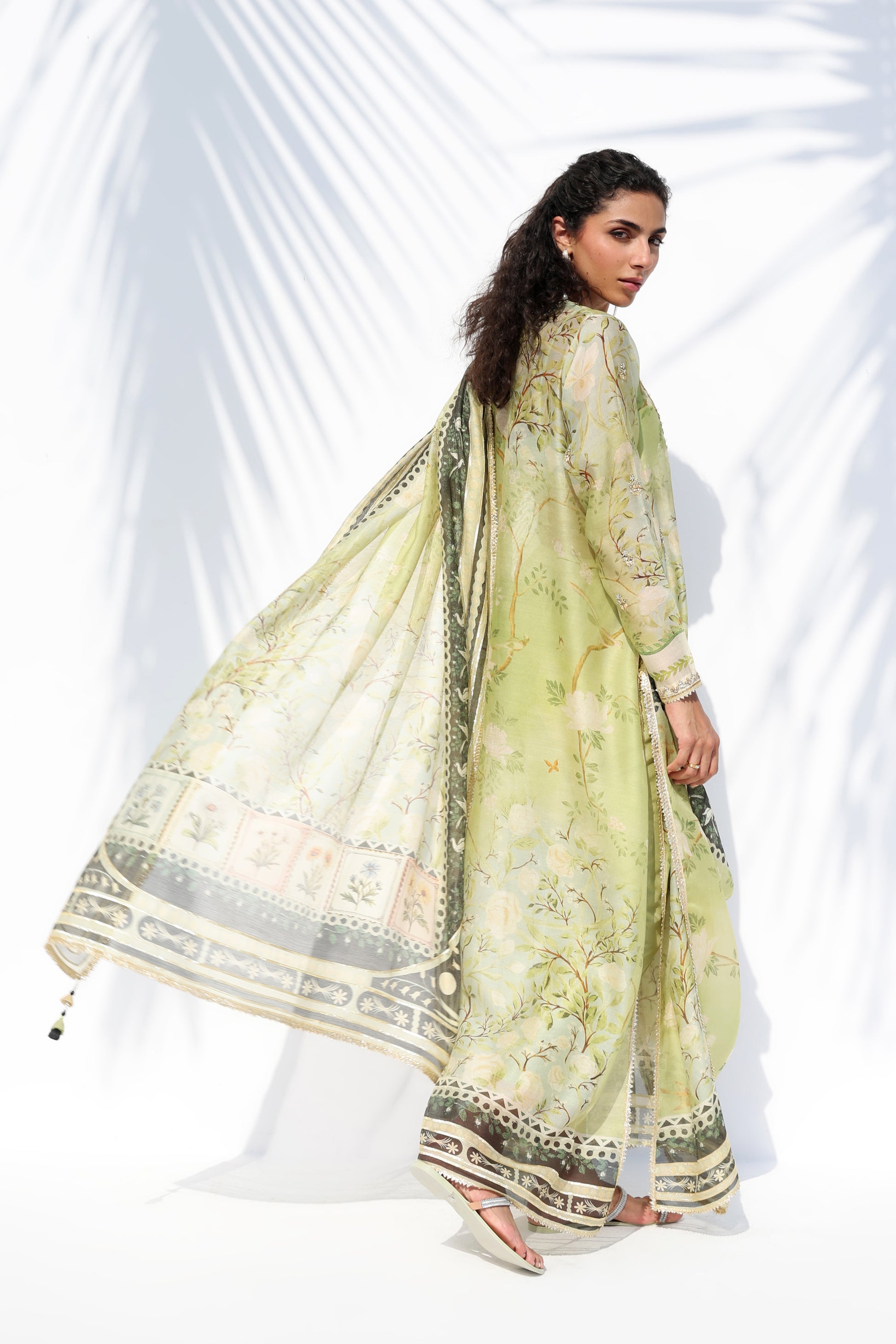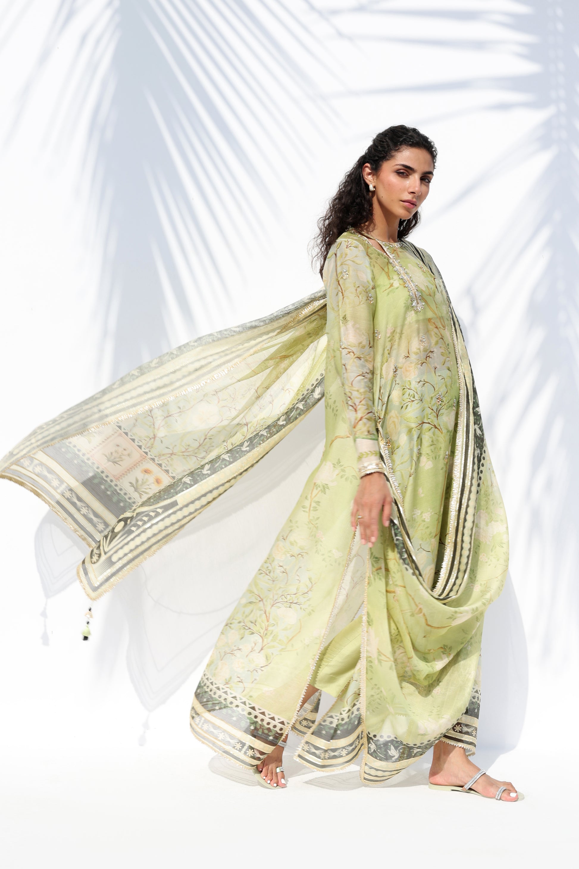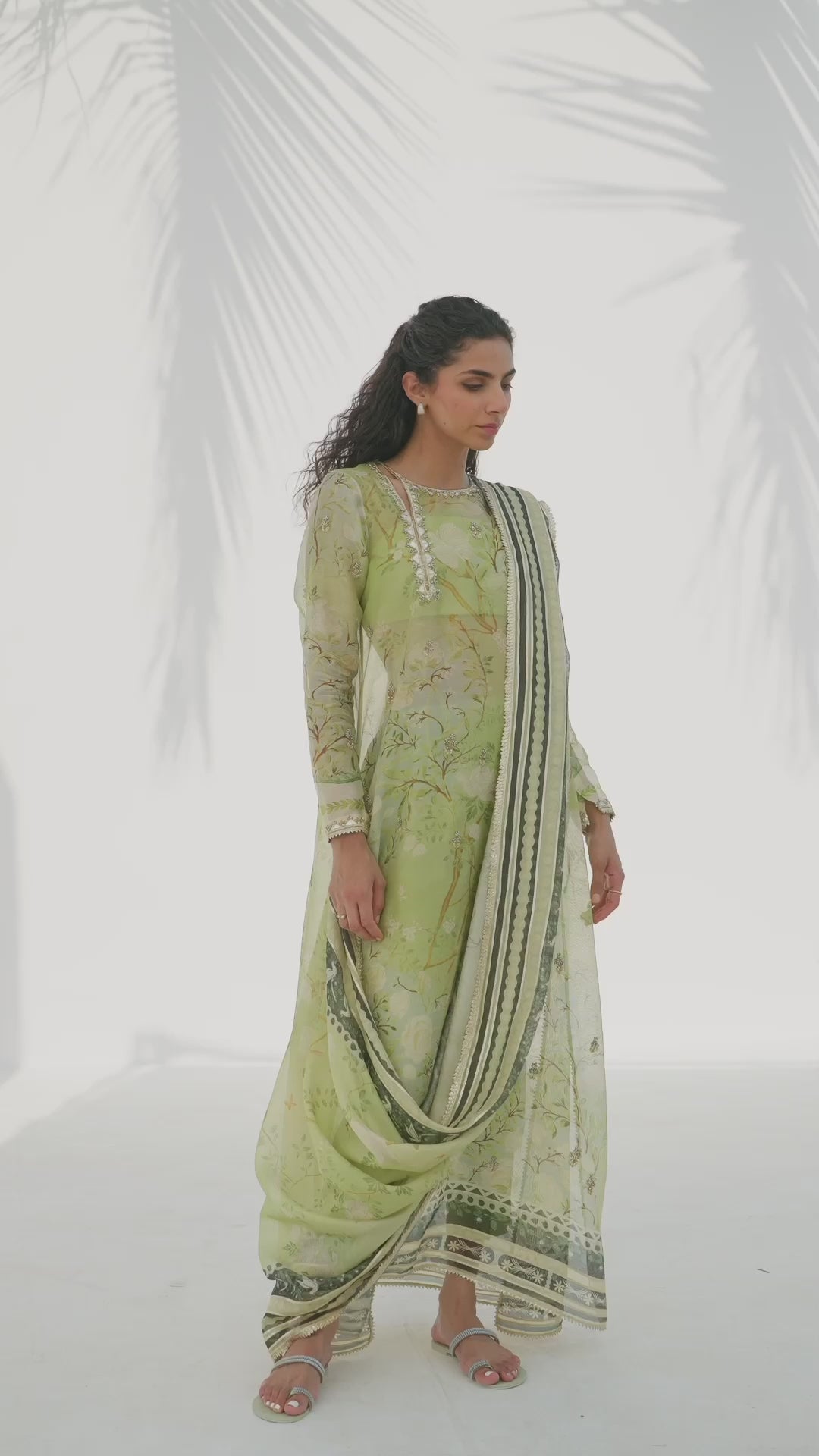 Radiating a luminous, ethereal charm, this ivory hued ensemble features an oversized sheer organza shirt, meticulously embellished with tonal floral aari work and scattered embroidery. The silhouette is defined by a bold V neckline framed with floral motifs, layered over a matching crepe camisole for a refined play on transparency. Statement sleeves and a scalloped hem lend textured depth, while lustrous pure rawsilk shalwar adds a fluid, modern drape, completing the monochromatic look with effortless grace.