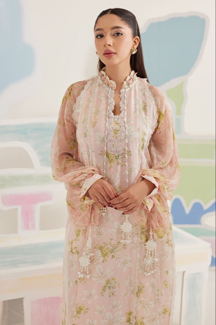 Delicate and serene, Alora is an ode to softness and fluid elegance. Crafted in a whisper-light printed fabric, the long shirt falls effortlessly with gentle movement, creating a calm, elongated silhouette. Subtle lace accents add refinement, while the muted floral print keeps the look airy and timeless. Paired with softly textured crushed pants and a flowing printed dupatta, this ensemble is ideal for understated celebrations, intimate gatherings, and refined daytime wear.