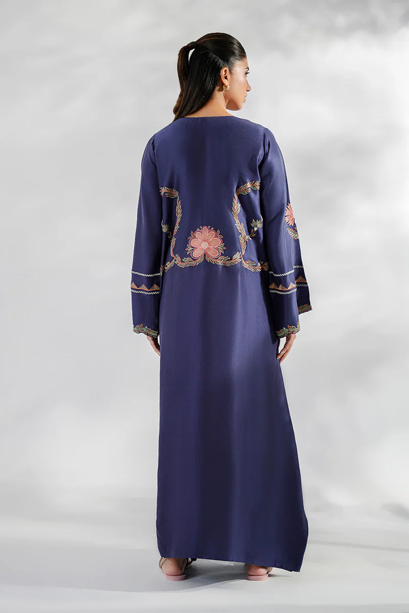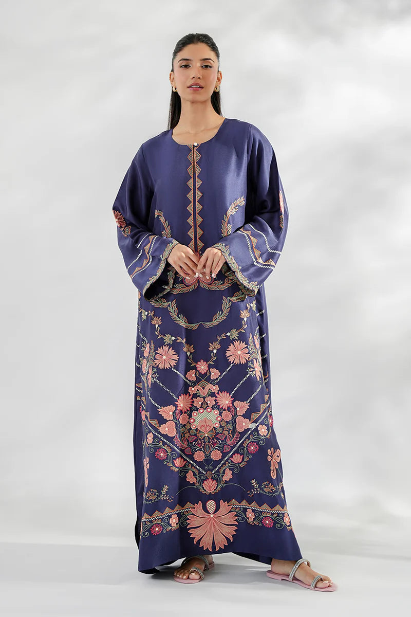 A striking midnight blue kaftan in pure rawsilk, embroidered with a tapestry of painterly florals in soft peach and vivid coral. Artful applique embellishment heightens the relaxed silhouette, while scalloped full sleeves bloom with bold floral sprigs.