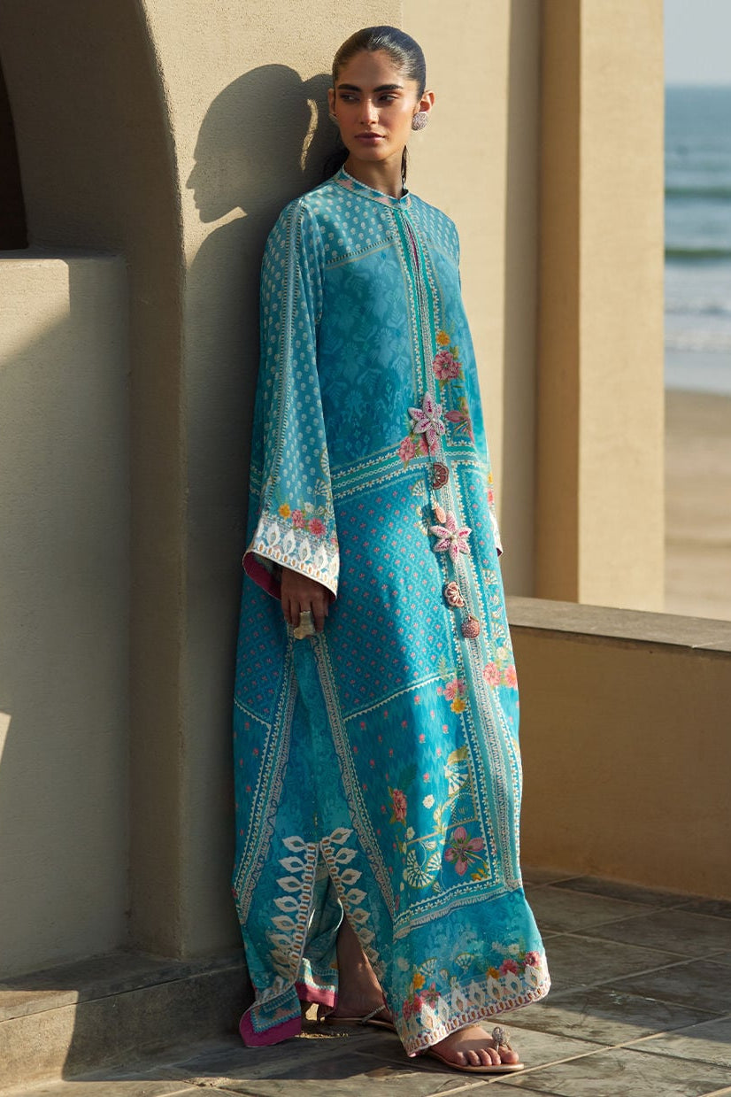 Vibrant and effortlessly elegant, this digitally printed sky-blue kaftan is crafted for a flowing, graceful silhouette. Hand-made floral tassels adorn the design, adding a playful yet refined touch that sways with every movement. The sleeves and hem are trimmed with a richly embroidered ivory border. Perfect for elevated daywear or relaxed evening gatherings, this kaftan combines contemporary charm with artisanal detailing for a look that is both chic and captivating.