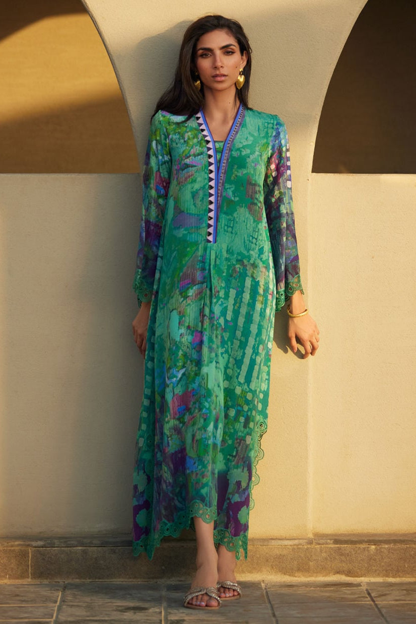Elegantly understated, this crepe printed kaftan is enhanced with a striking black and white hand embellished neckline. The side slits, daman, and statement sleeves are trimmed with a coordinating embroidered border, adding subtle structure and texture to the flowing silhouette. Rendered in cool tones, this kaftan is perfect for those who appreciate timeless elegance with thoughtful detailing.