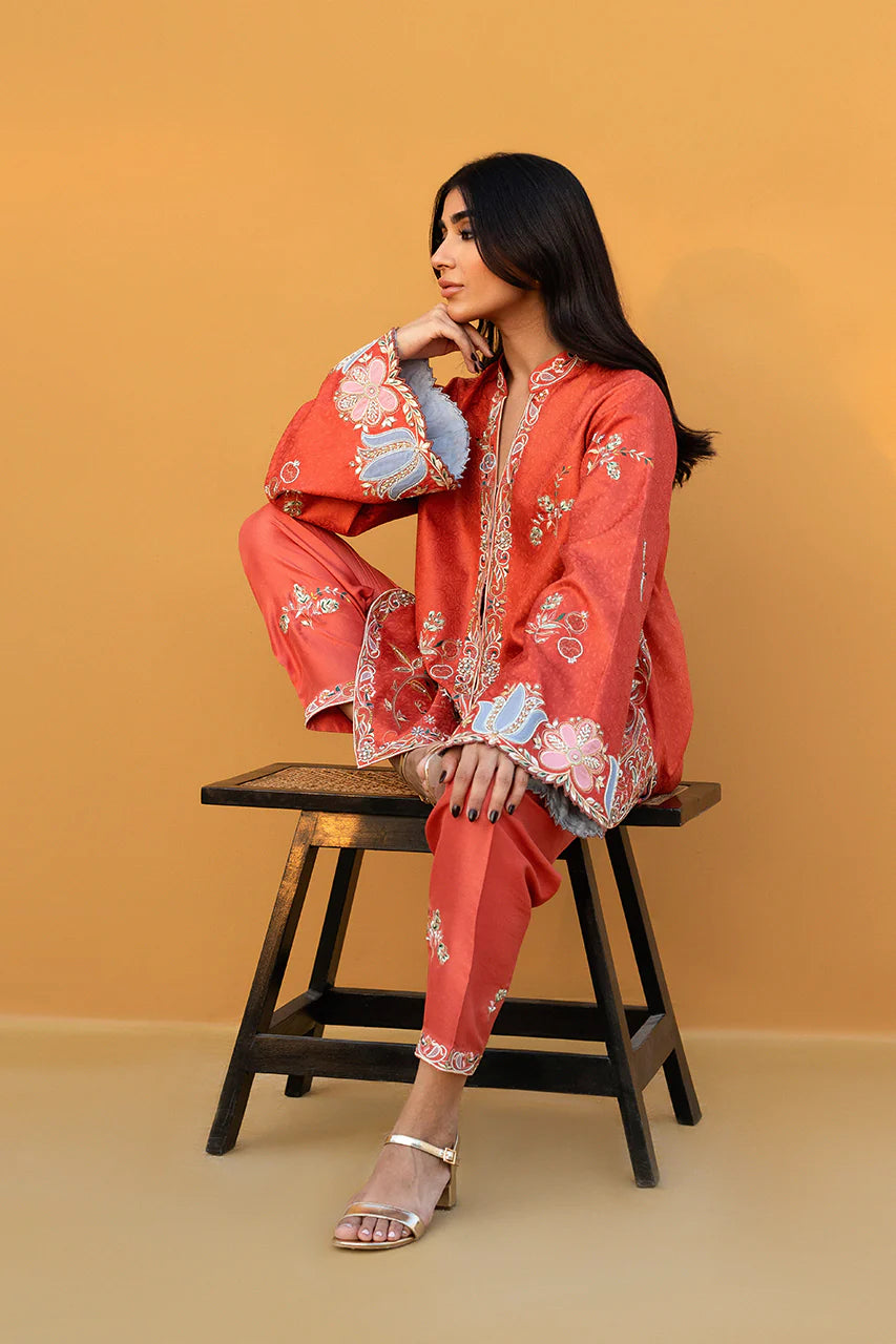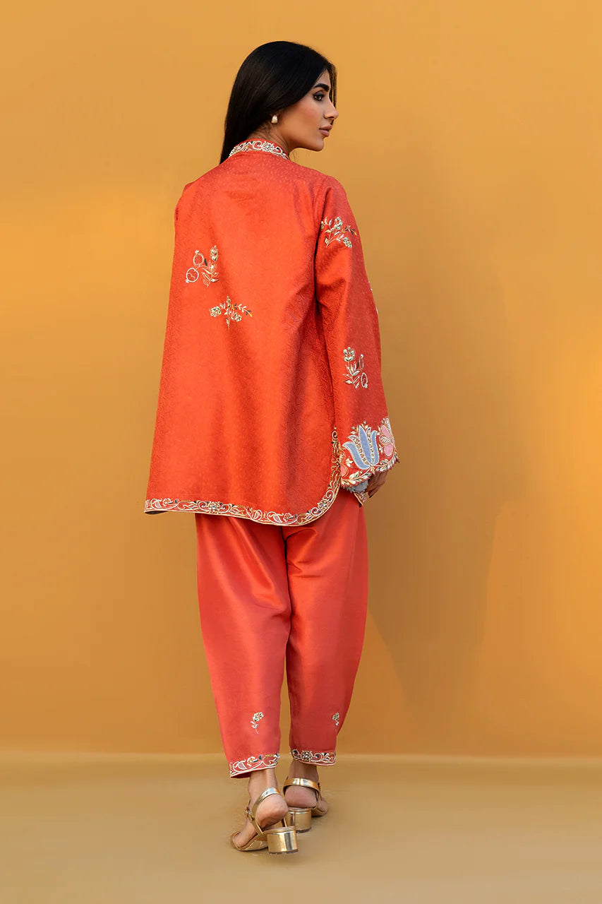 A vibrant short kurta in striking coral is adorned with intricate floral embroidery in cool tones of light azure and ivory resham. The detailing traces the band collar and front placket, culminating in a scenic composition of birds and pomegranate motifs along the hem. Scalloped sleeves are further elevated with applique embroidery at the cuffs, adding finesse. Paired with matching pure raw silk shalwar featuring embroidered hems, the look balances traditional craft with a fresh, contemporary palette.