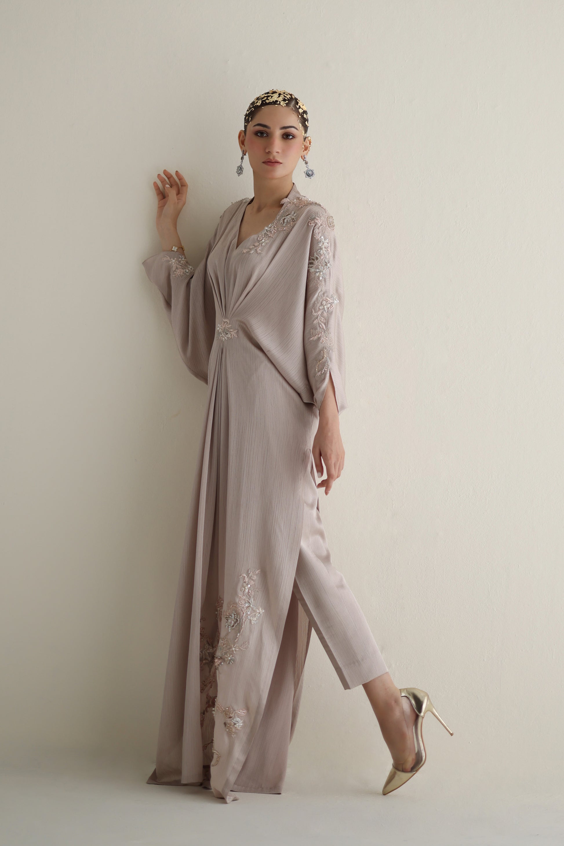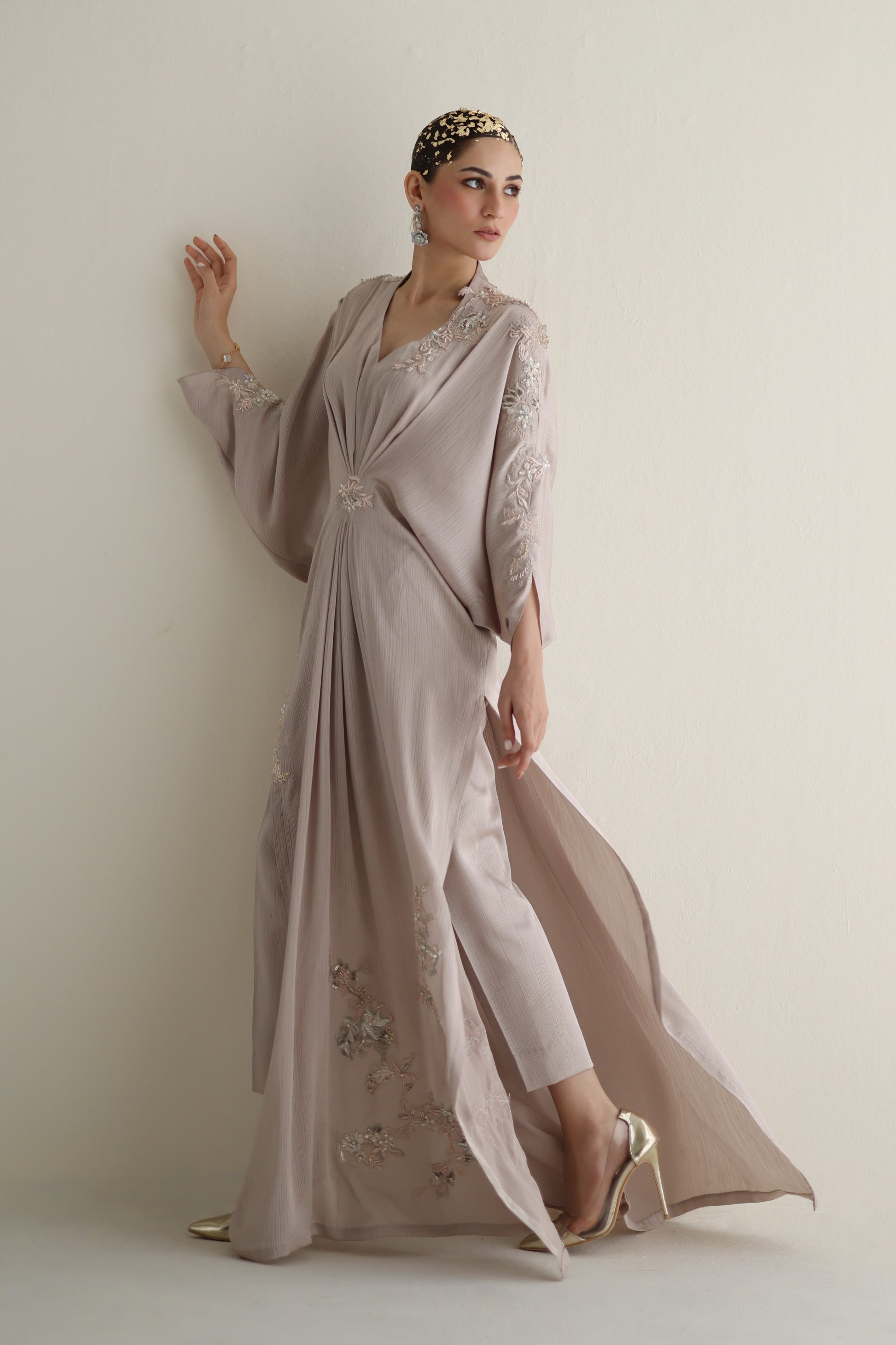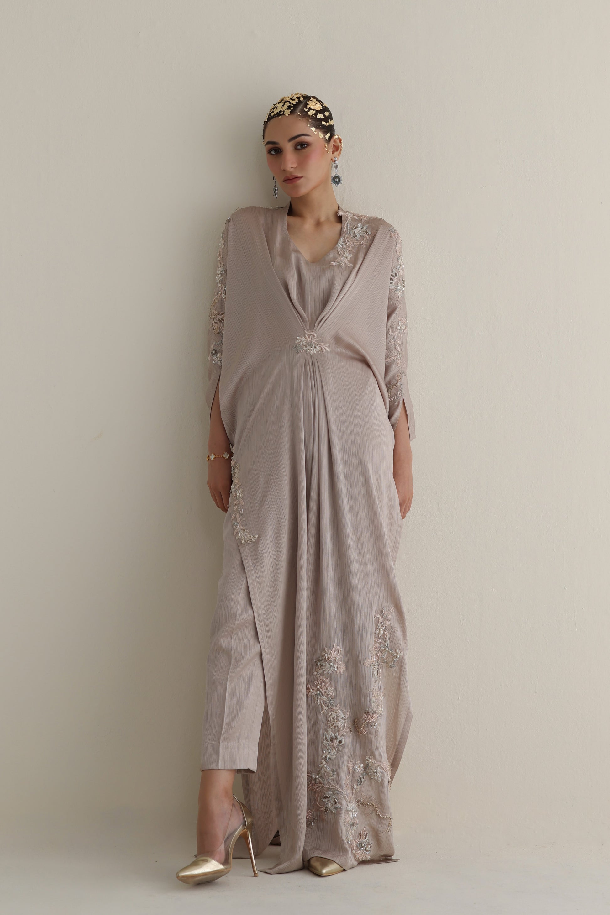 Introducing our sea salt lily silk high slit kaftan with pants, a captivating ensemble that exudes elegance and grace. Crafted from luxurious Lily silk, the kaftan features a high slit design that adds a touch of allure to your silhouette. Embellished with intricate detailing including resham, zari, cutdana, moti, sequins, and pearls, this ensemble is perfect for making a statement at any occasion. Paired with matching Lily silk fused pants, this ensemble offers both style and comfort. Elevate your wardrobe with this chic and sophisticated ensemble that effortlessly blends luxury and glamour. The model's Kaftan length is 58.