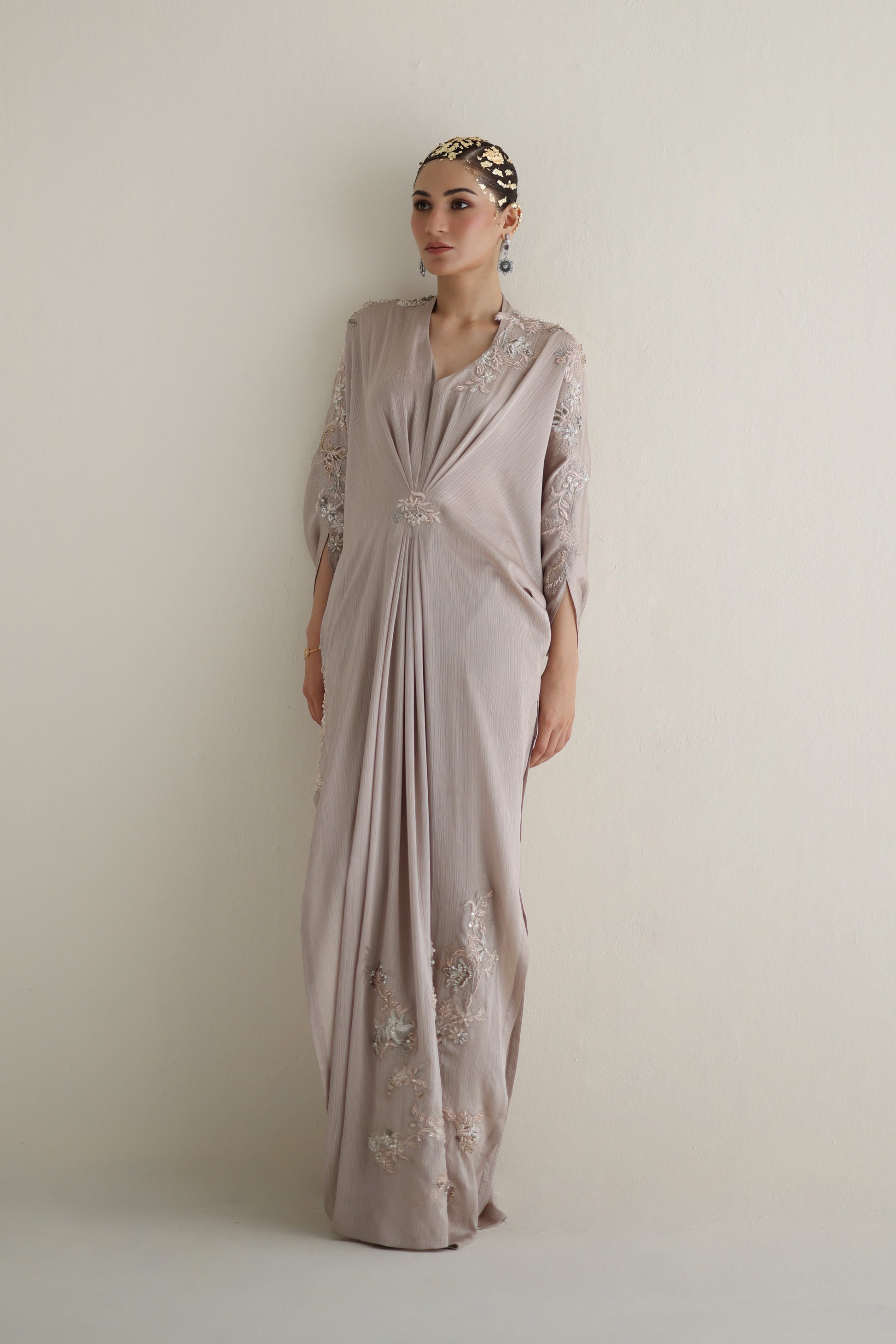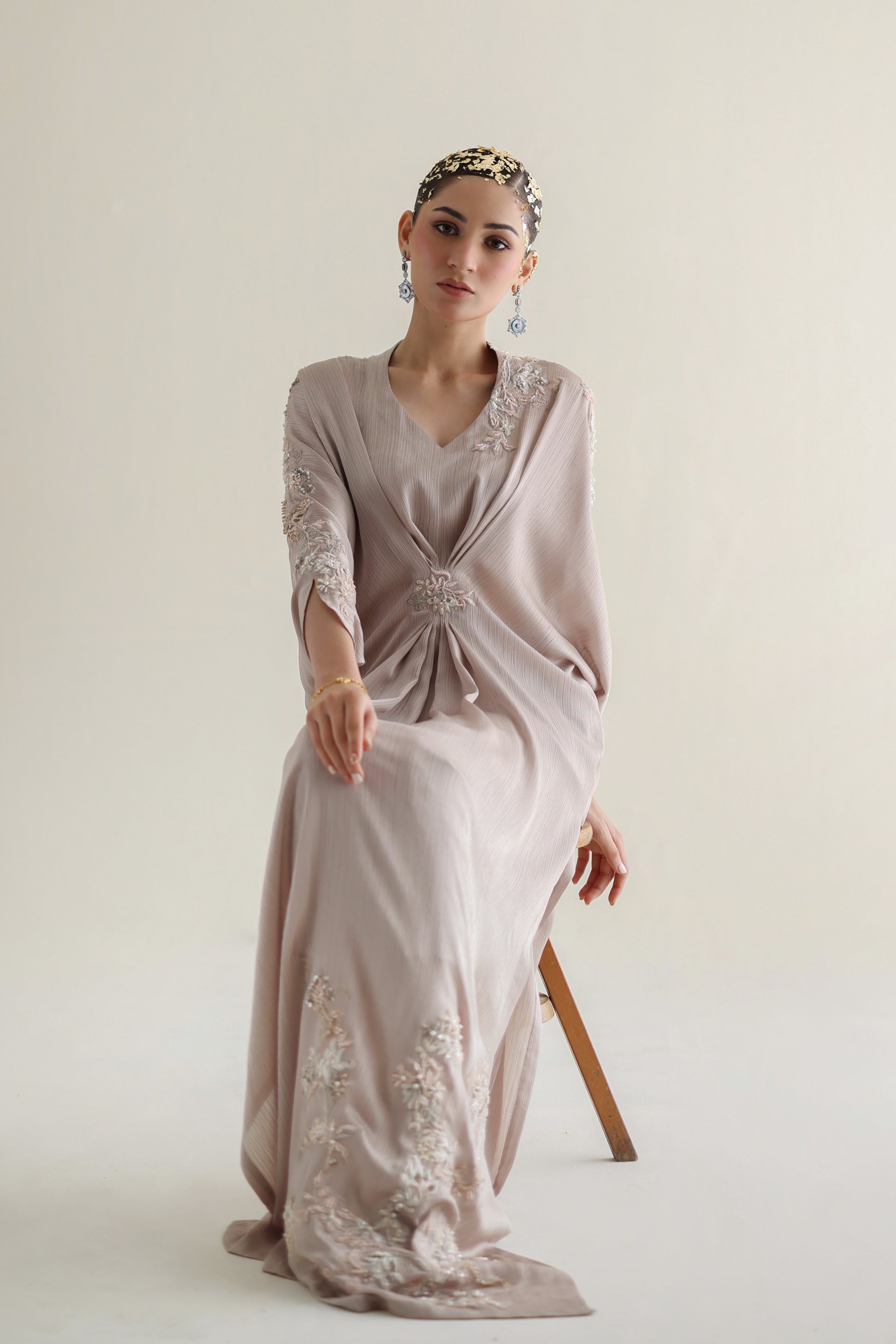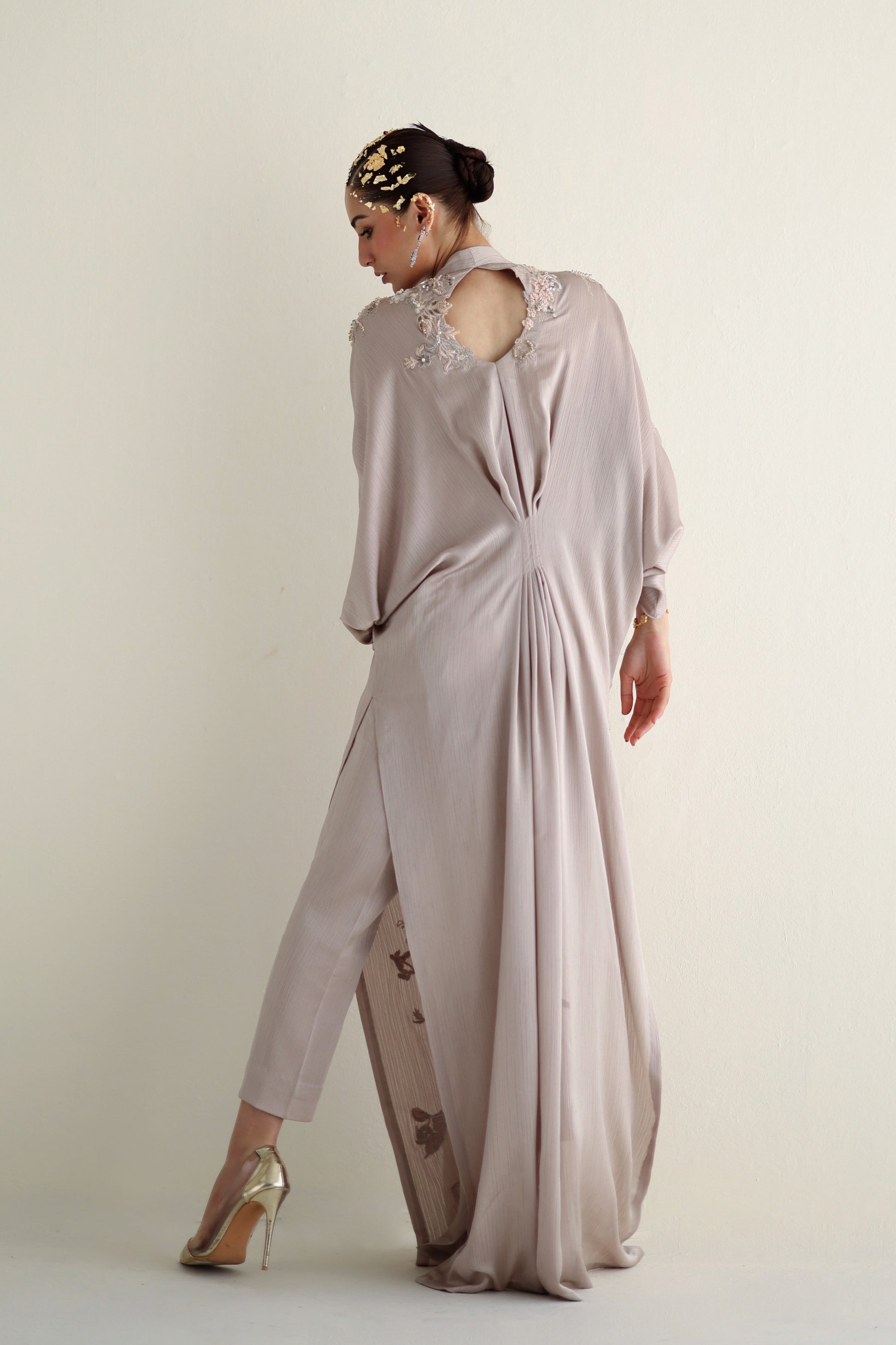 Introducing our sea salt lily silk high slit kaftan with pants, a captivating ensemble that exudes elegance and grace. Crafted from luxurious Lily silk, the kaftan features a high slit design that adds a touch of allure to your silhouette. Embellished with intricate detailing including resham, zari, cutdana, moti, sequins, and pearls, this ensemble is perfect for making a statement at any occasion. Paired with matching Lily silk fused pants, this ensemble offers both style and comfort. Elevate your wardrobe with this chic and sophisticated ensemble that effortlessly blends luxury and glamour. The model's Kaftan length is 58.