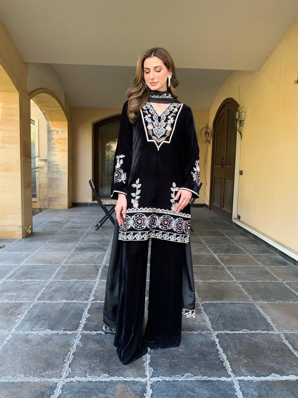 The black velvet outfit consists of a short a like cut kameez (tunic) and wide-legged trousers. The kameez features intricate embroidery in shades of silver, white, and light blue along the neckline, sleeves, and hemline, with floral and geometric motifs. Dupatta is in silk fabric .
