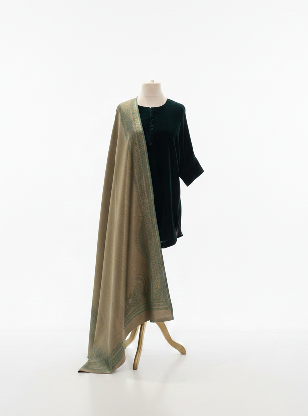 Step out in effortless elegance with this emerald green relaxed fit short shirt, beautifully paired with a sleek skinny shalwar and a soft moonlight stole. Designed for comfort and style, this ensemble is perfect for an evening out, blending modern silhouettes with timeless charm.