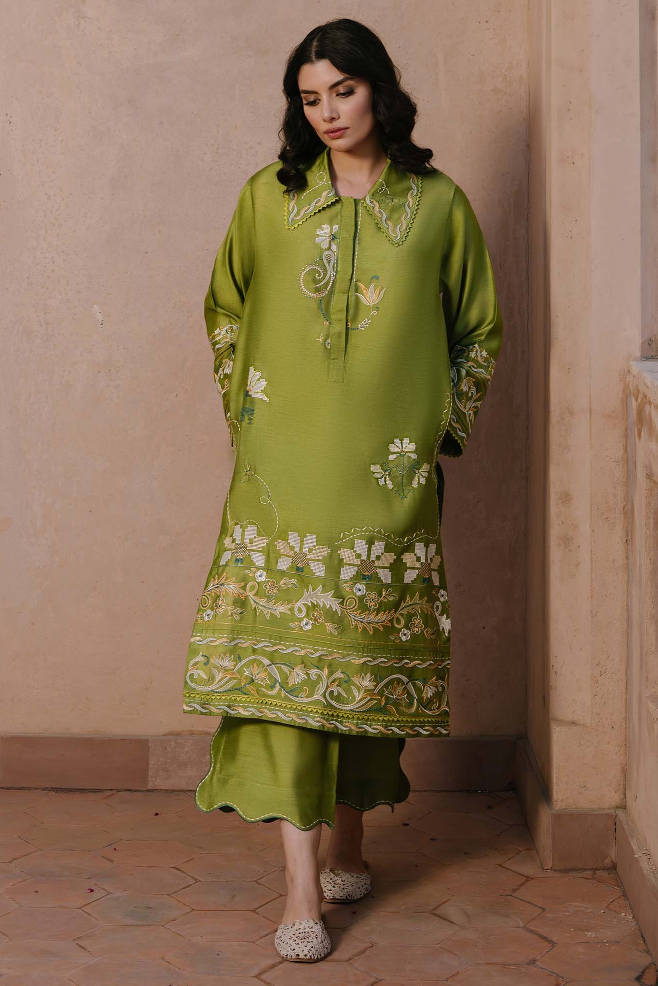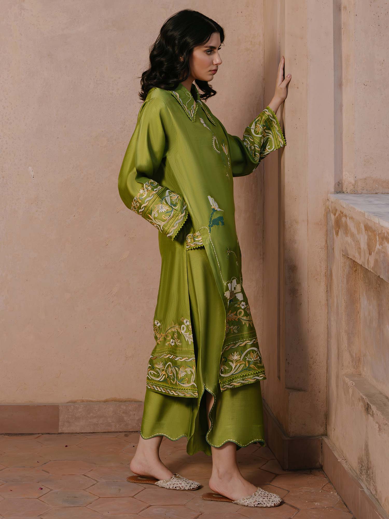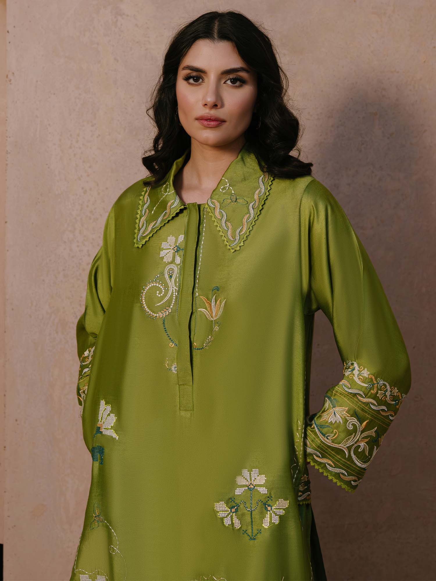 Buy now, love forever. Our moss green Bundi set in khaddi silk features fine cross stitch embroidery in complementing hues, inspired by floral motifs, paired with matching side slit pants to elevate the look.