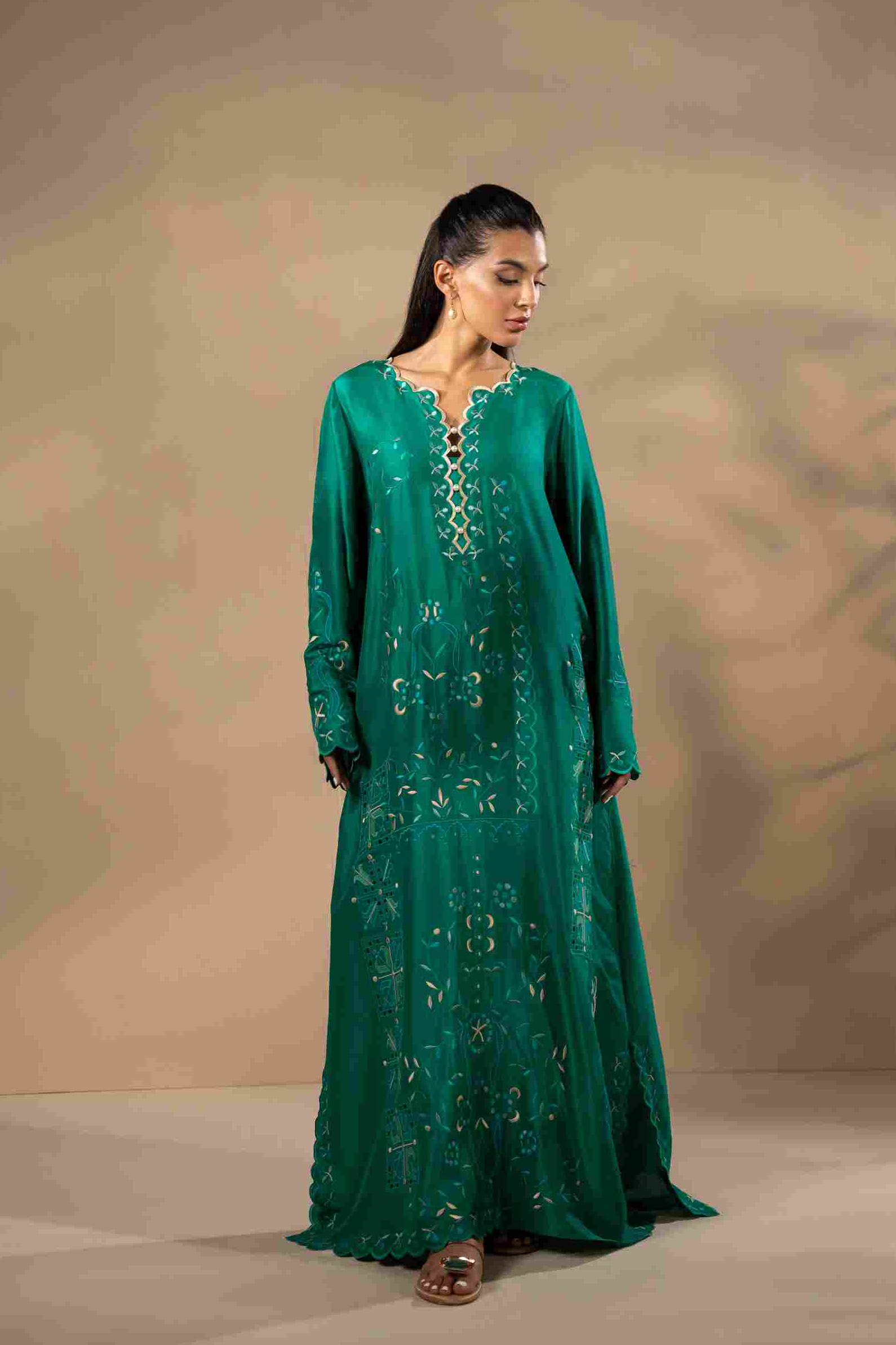 Rendered in a deep emerald hue, this fluid silhouette is adorned with intricate cutwork embroidery and artisanal stitch detailing. The kaftan, crafted from luminous pure raw silk, is paired with tonal straight pants to create an effortlessly elegant ensemble.