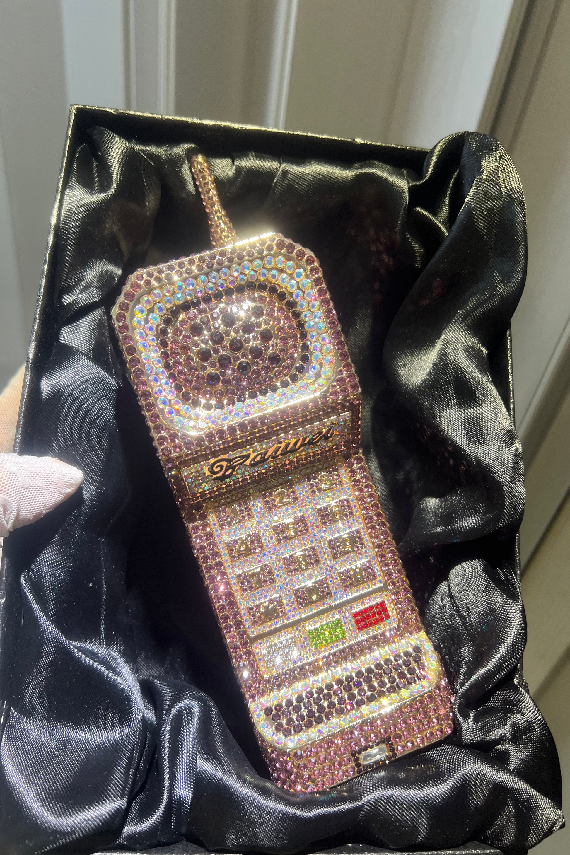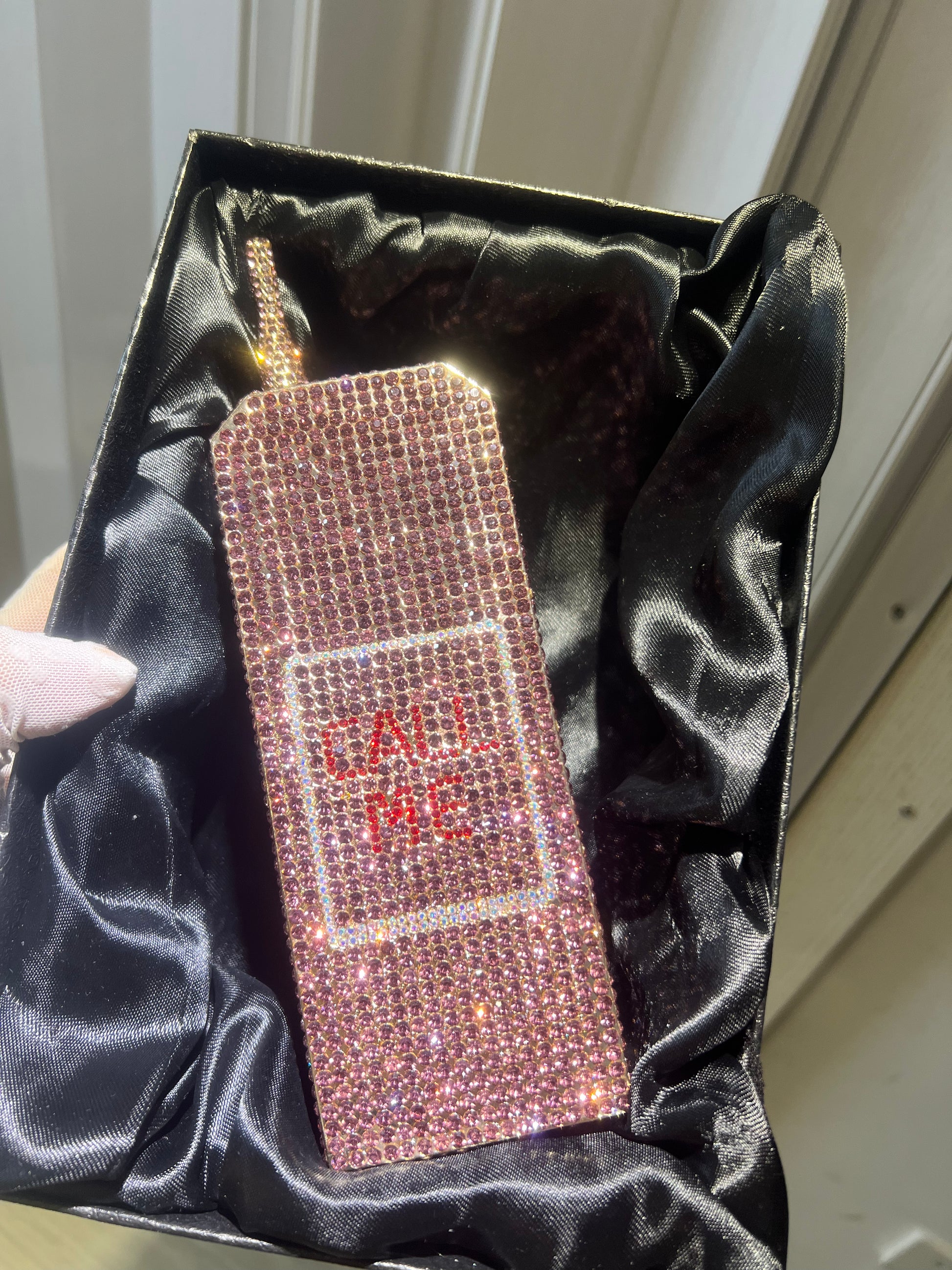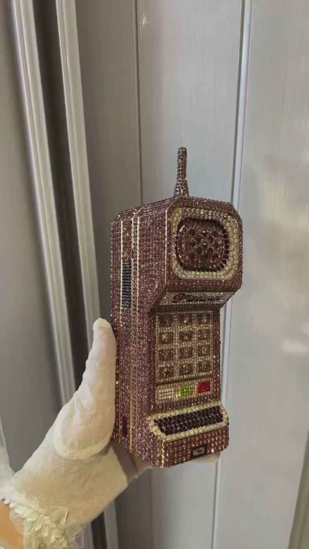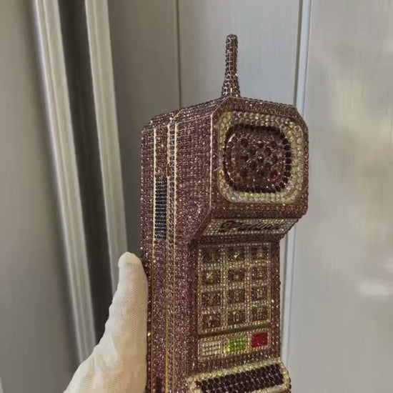 Make a statement with this luxury evening bag, designed to look like a jeweled flip phone. Expertly crafted with high-quality rhinestones and crystals, this clutch adds sparkle and whimsy to any outfit.