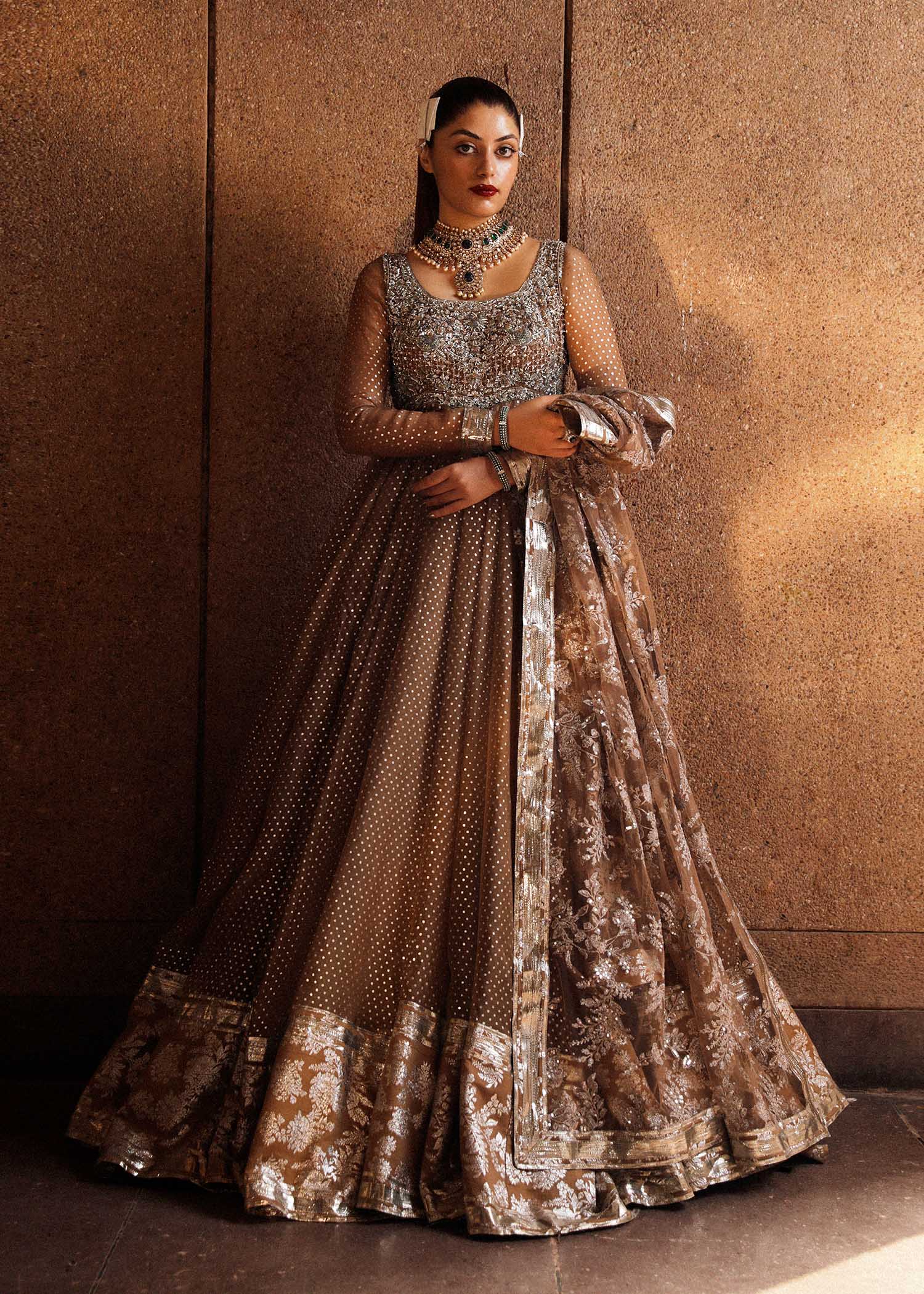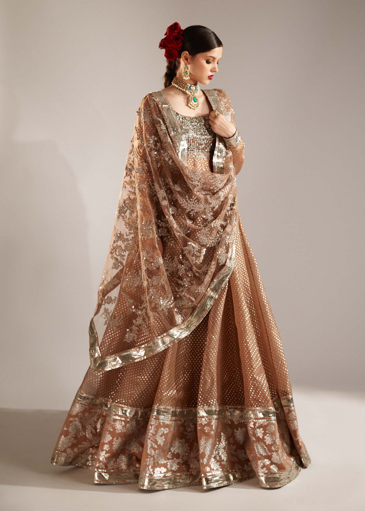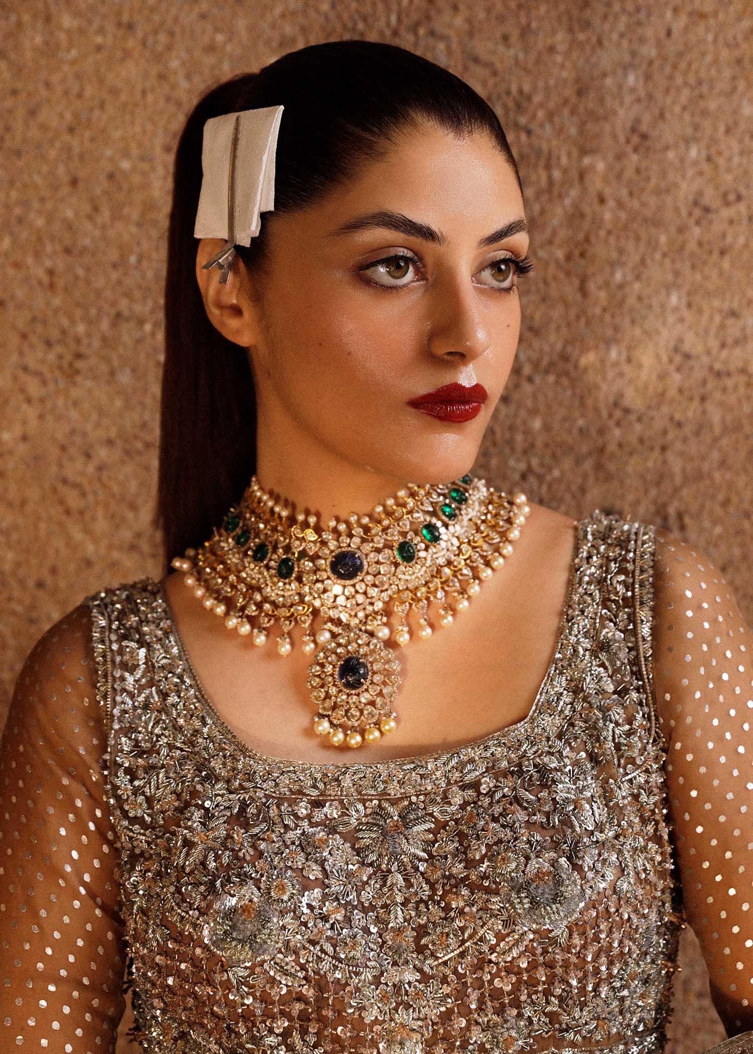 A symphony of artistry and opulence woven into every thread. Hand embelllished bodice meets shimmering foil printed flare, adorned with chanderi silk border. The crushed sharara in medium silk sways with grace, while the exquisite dupatta, trimmed with gotta and lappa completes this masterpiece of regal splendor.