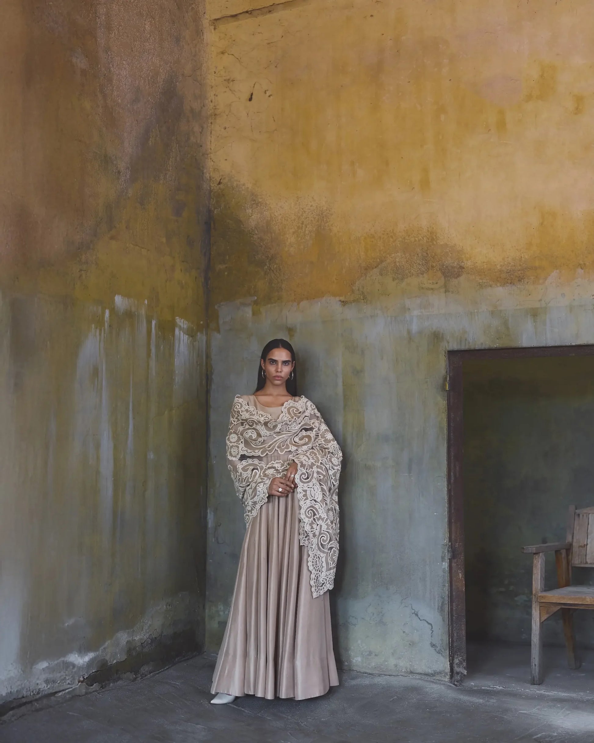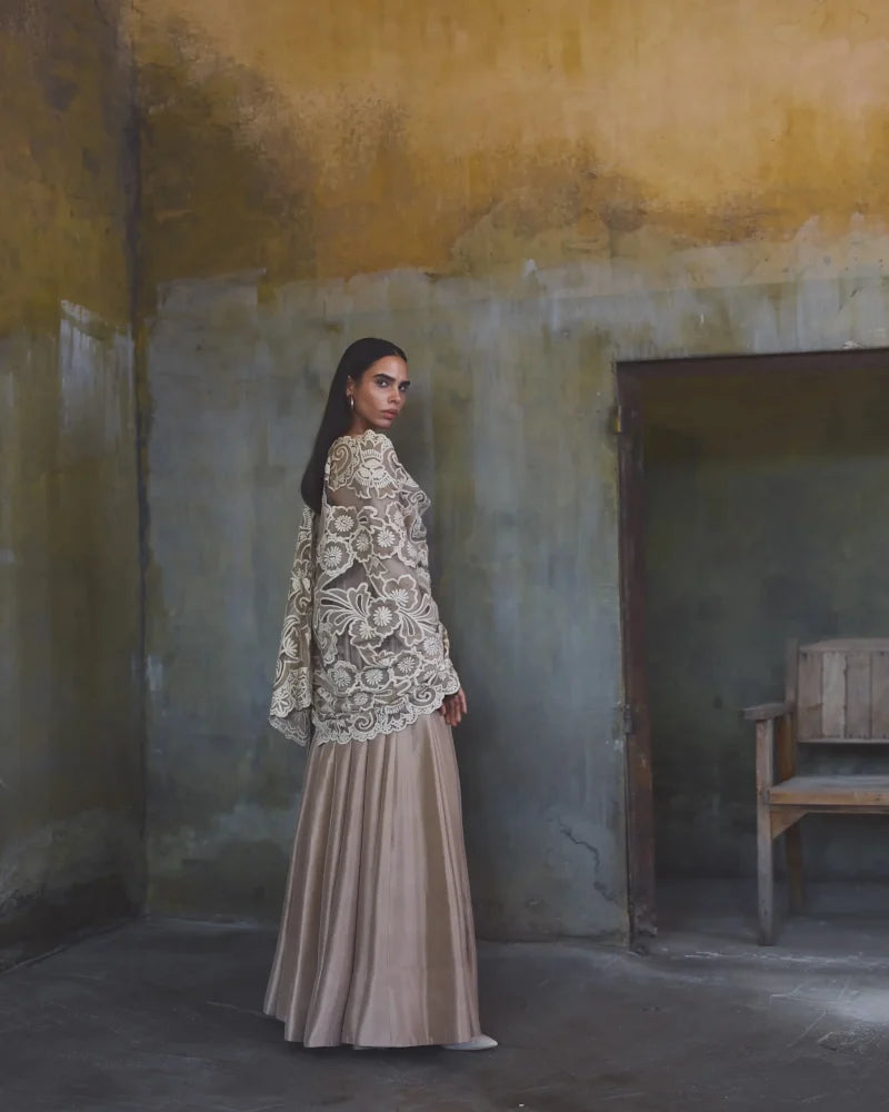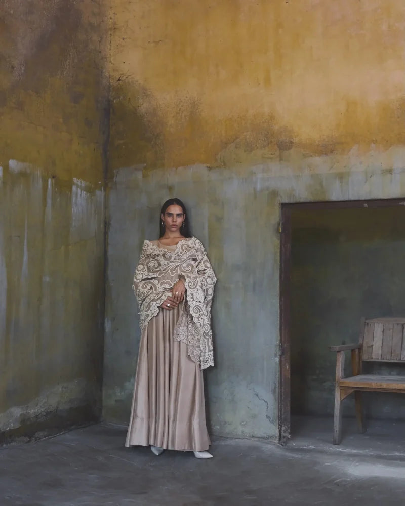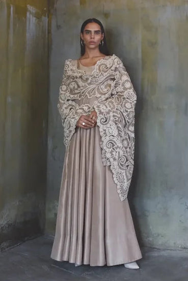 Pishwas: The outfit is crafted from a rich, coffee beige colored 80 grams pure raw silk features a clean, structured bodice with a classic round neckline.The fit is tailored to the waist, transitioning into a voluminous flare. The waistline transitions into structured pannels that provide significant volume and a dramatic flare toward the hem. A modest U shaped back keyhole fastened by thin tie-up strings with a multi-tiered tassel accessory. Dupatta (Stole): The 2.75 yards by 36" width soft net dupatta features heavy, tonal embroidery decorated with bold, swirling floral applique patterns.The edges are finished with a wide, intricate scalloped border.