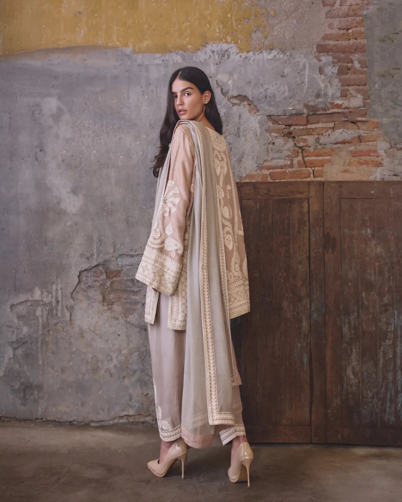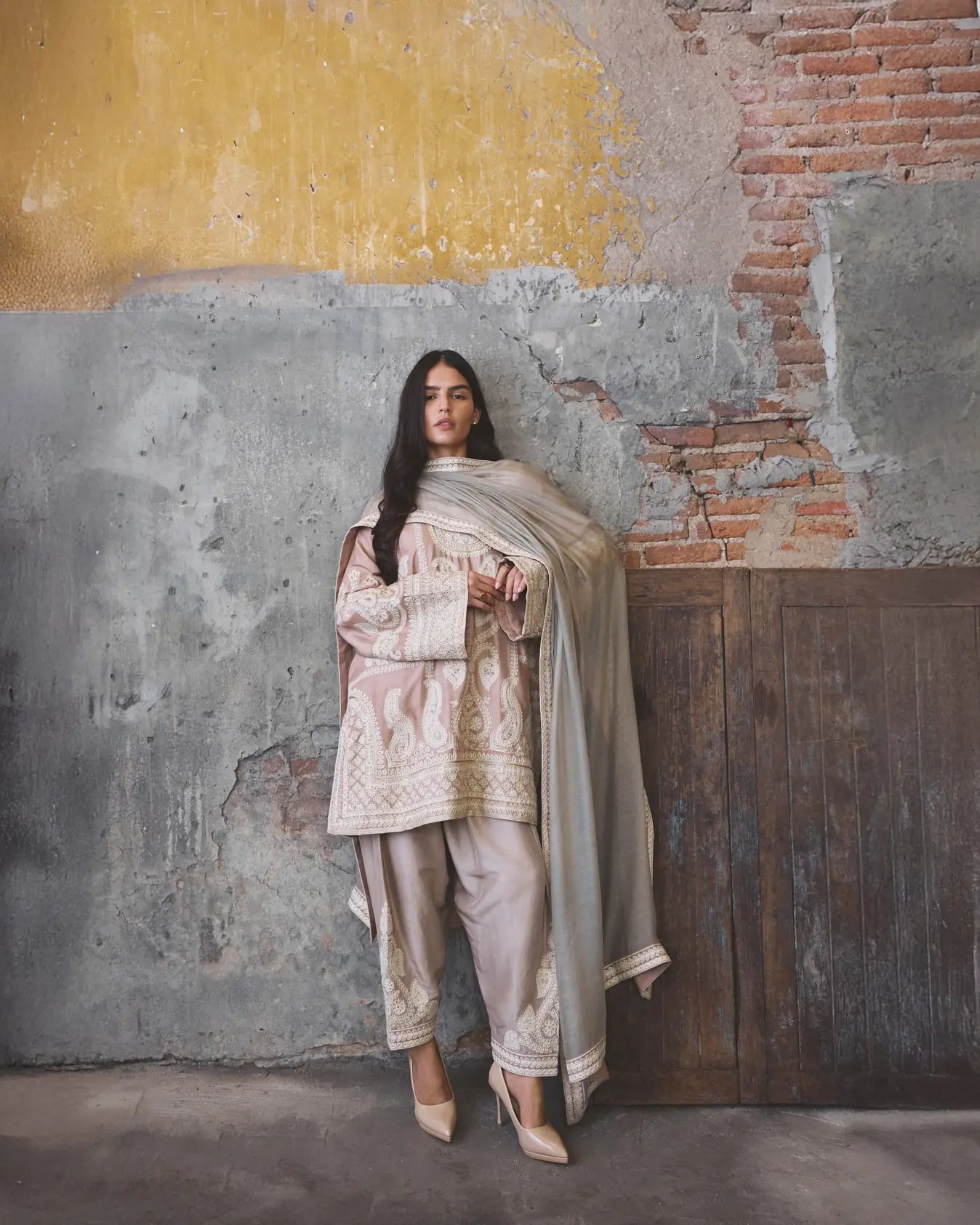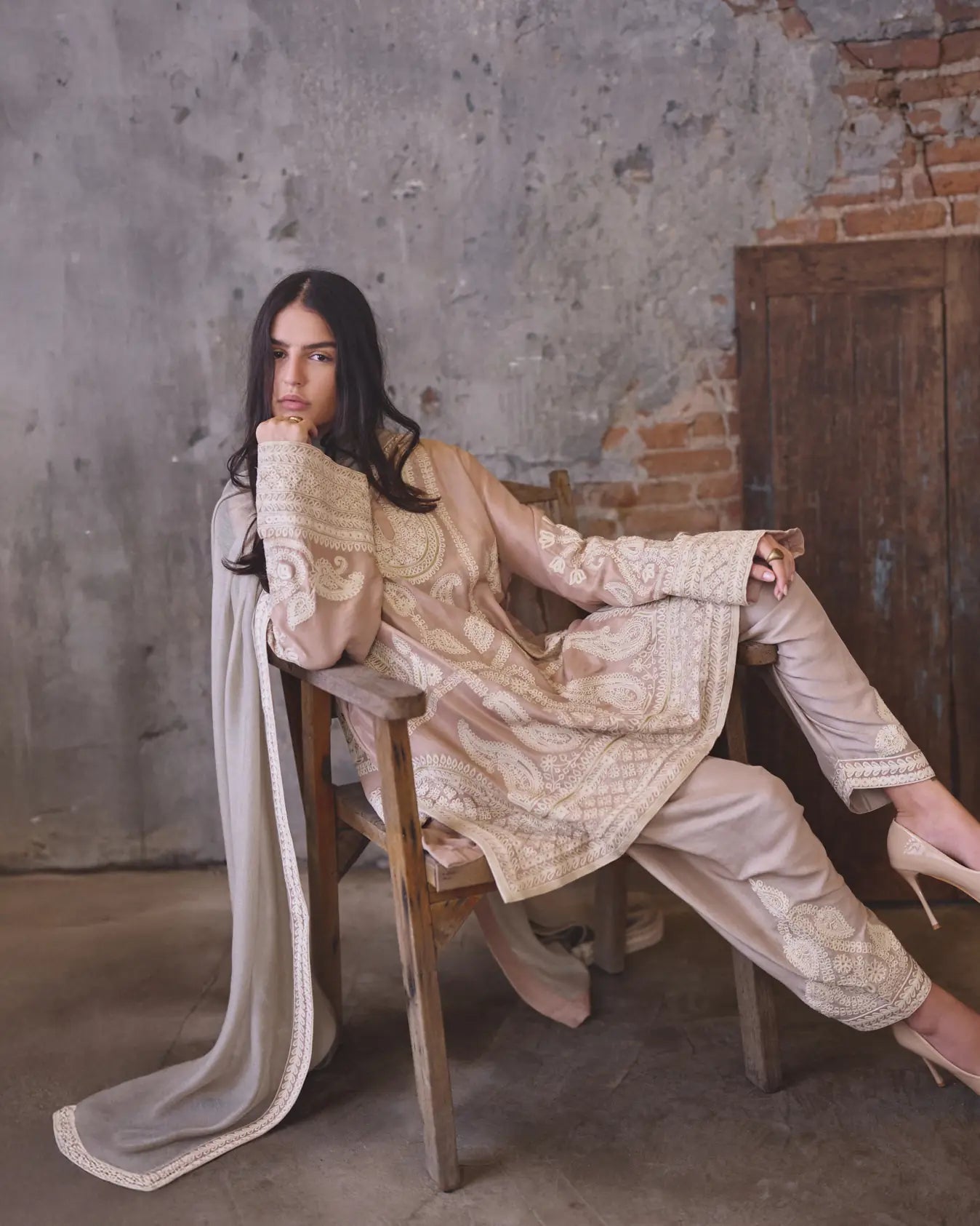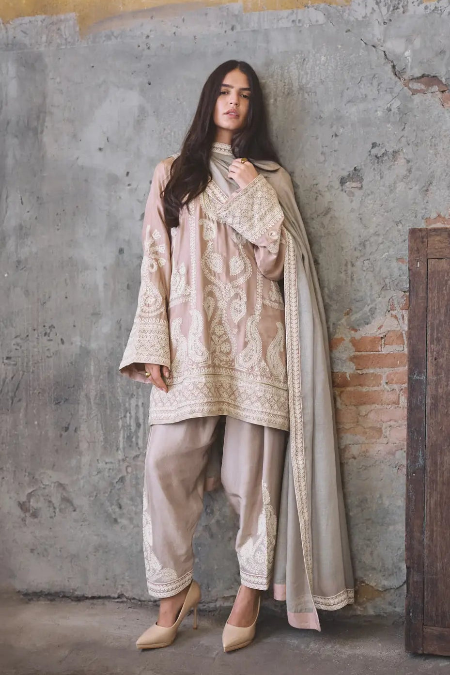 Shirt: This outfit is a sophisticated three-piece ensemble features a mid-length, loose-fit shirt crafted from a premium dusty pink 80 grams pure raw silk, defined with heavy,intricate thread and zari embroidery.The front and back are dominated by large, stylized paisley motifs, surrounded by vertical borders and finished with a wide, ornate hemline (daaman).The sleeves are long and slightly flared, mirroring the embroidery of the shirt’s hem to create a balanced visual flow. Shalwar: Made of pure 80 grams raw silk fabric. The hem is embellished with white embroidery with tilla that matches the tunic, ensuring a cohesive look from top to bottom. Dupatta: The dupatta is crafted from pure silk net in sage green color features a delicate four sided border with ivory embroidered patterns and a subtle contrast silk finishing.