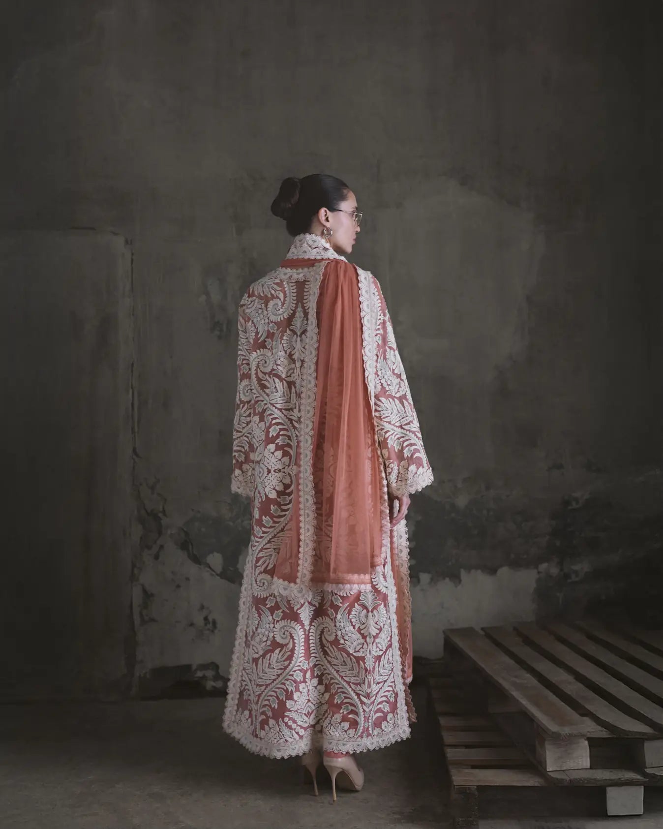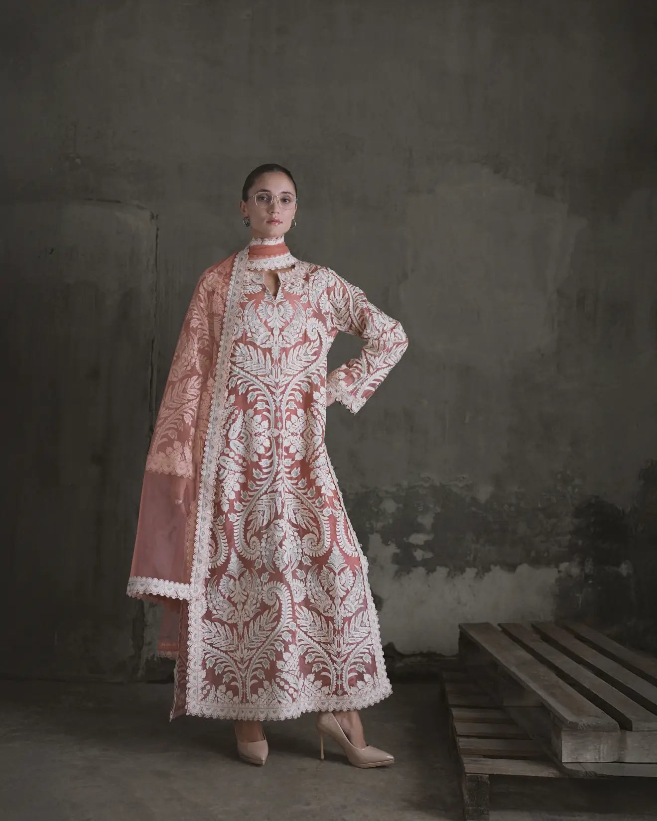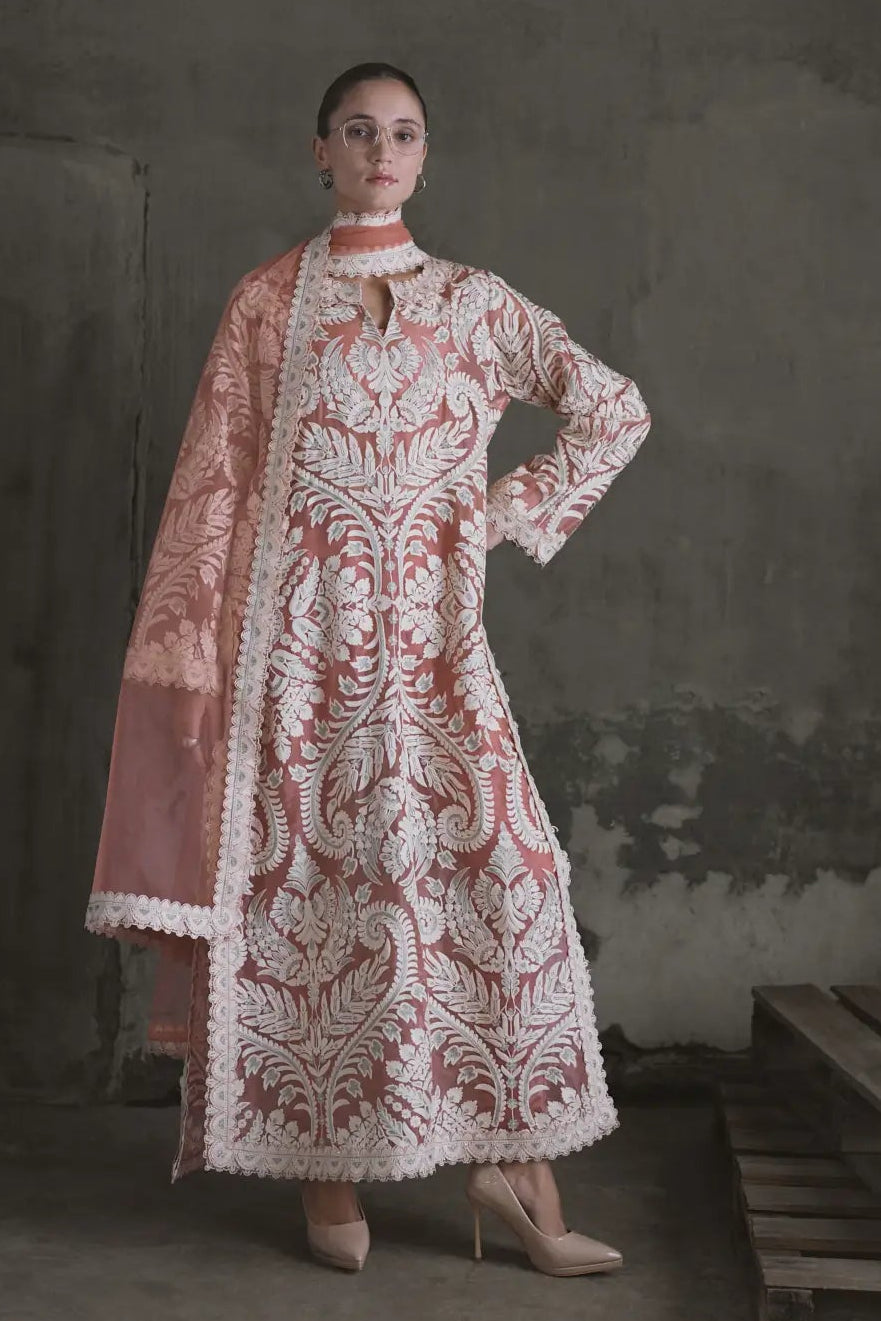Dupatta: Gosh pink colour soft net dupatta. It is framed by a broad, white embroidered border with the scalloped edges that match the tunic's detailing.