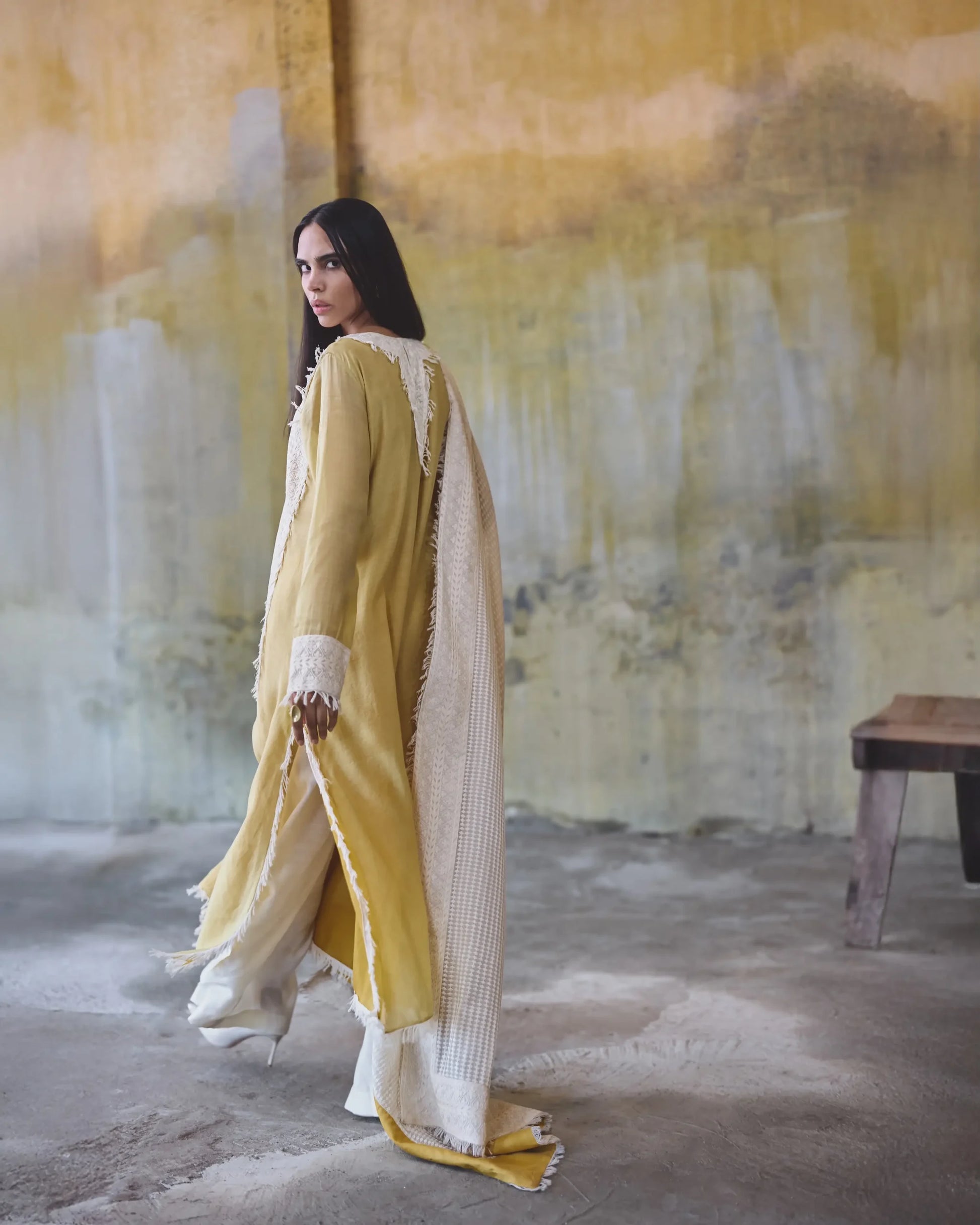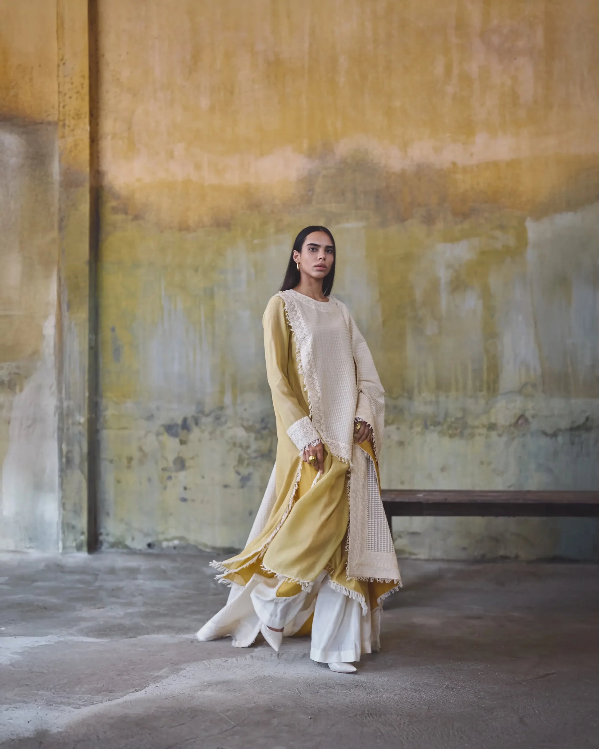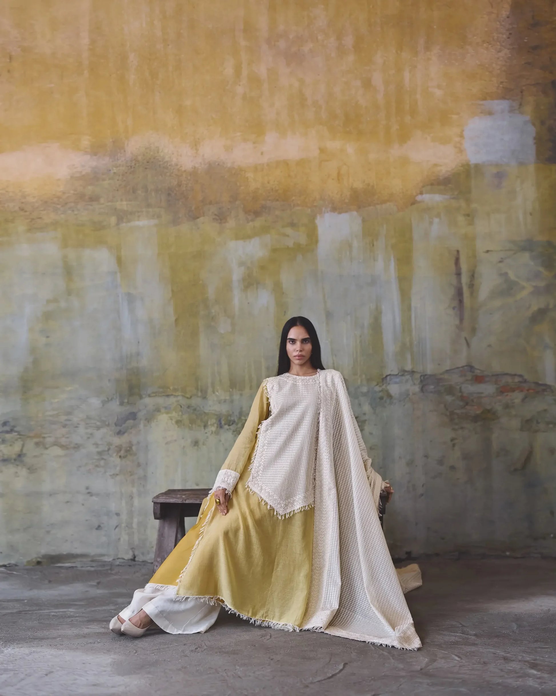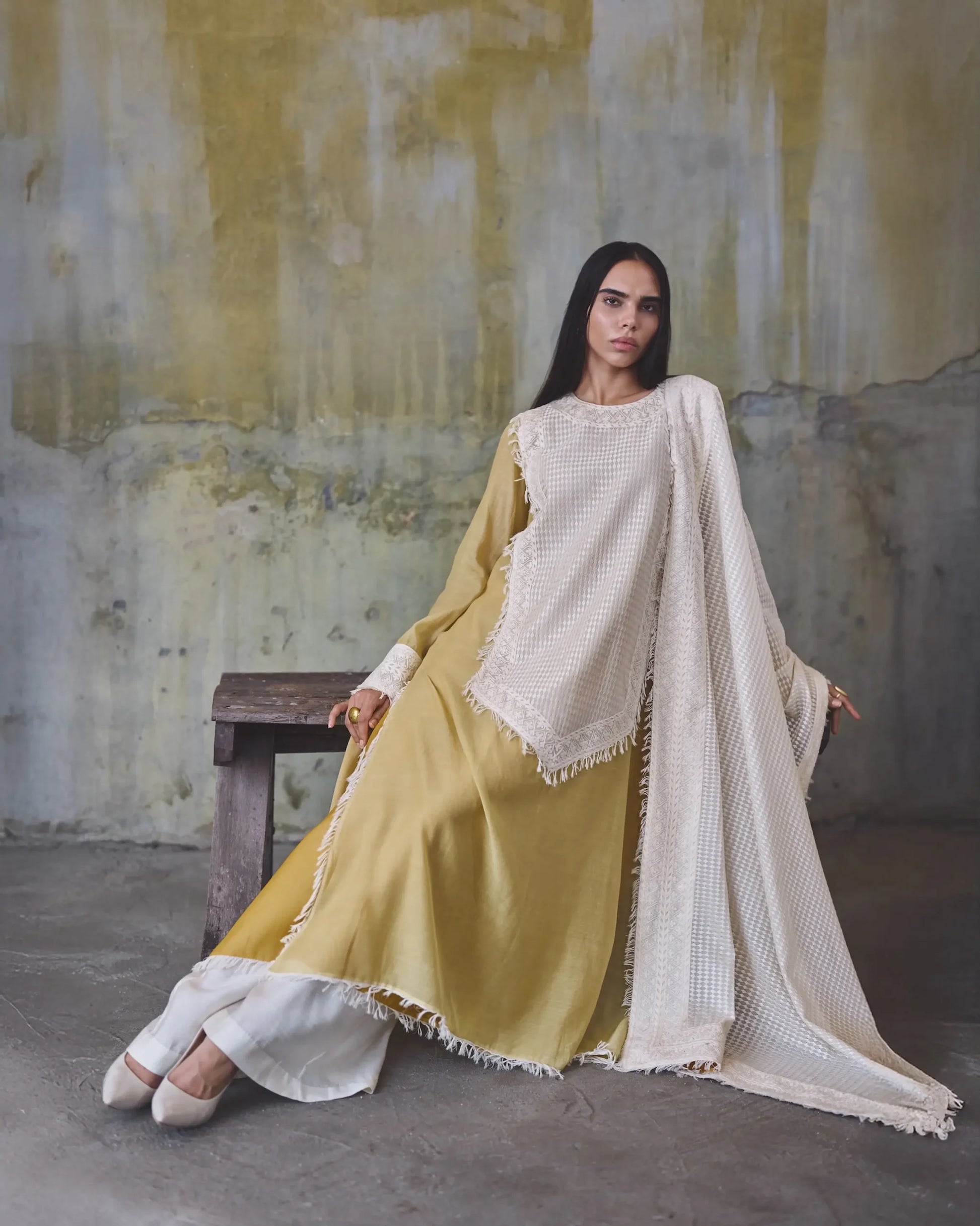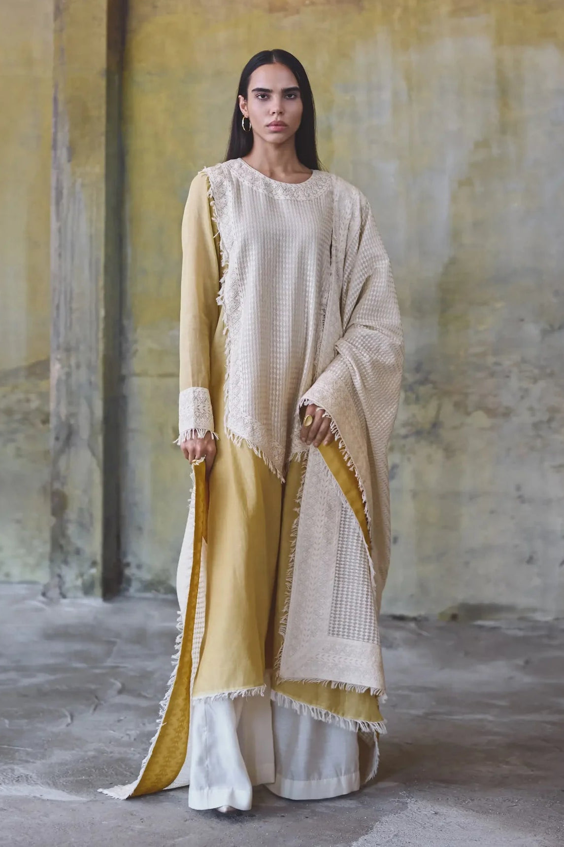 Shirt: A long, loose-fit shirt crafted from pure cotton silk fabric. The neckline is elegantly framed by a heavily embroidered geometric work patch. The sleeves are finished with heavy, structured cuffs that mirror the detailed tilla and threadwork. Bottom: Boot cut ivory colored pants tailored from premium pure cotton silk fabric. Dupatta: A matching pure cotton dupatta, heavily embellished with white thread embroidery. It is finished with a sophisticated four-sided edging of thick, decorative borders.
