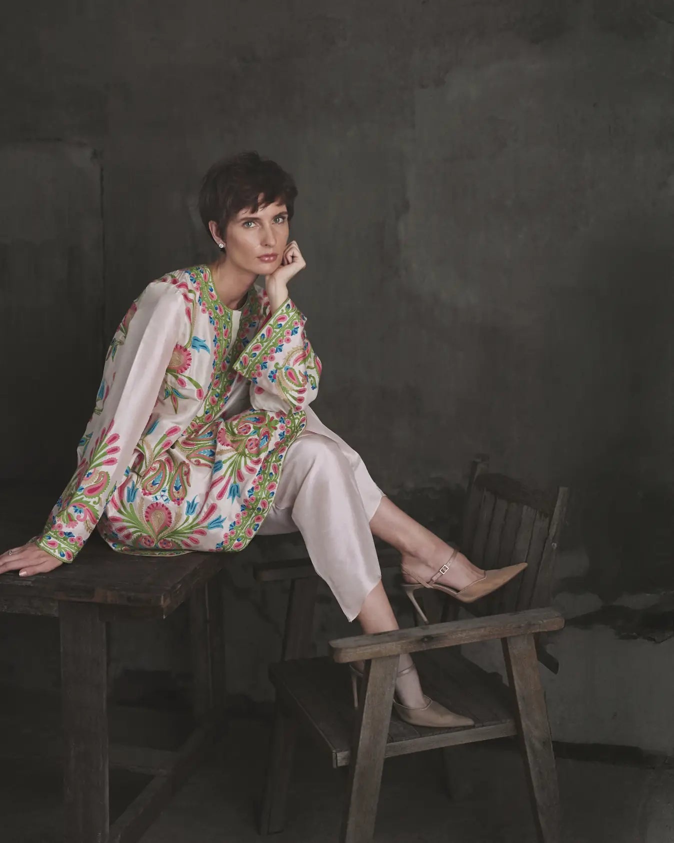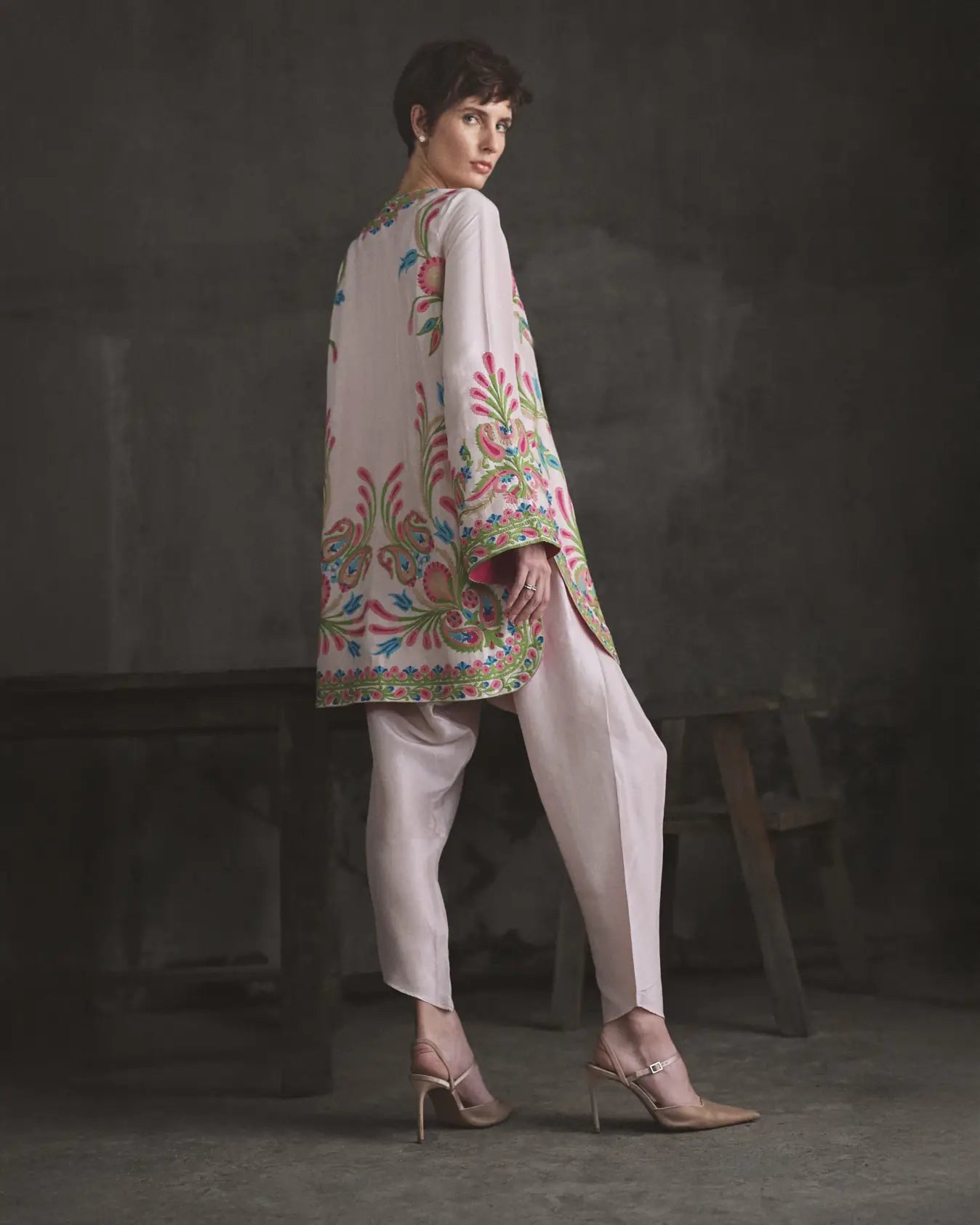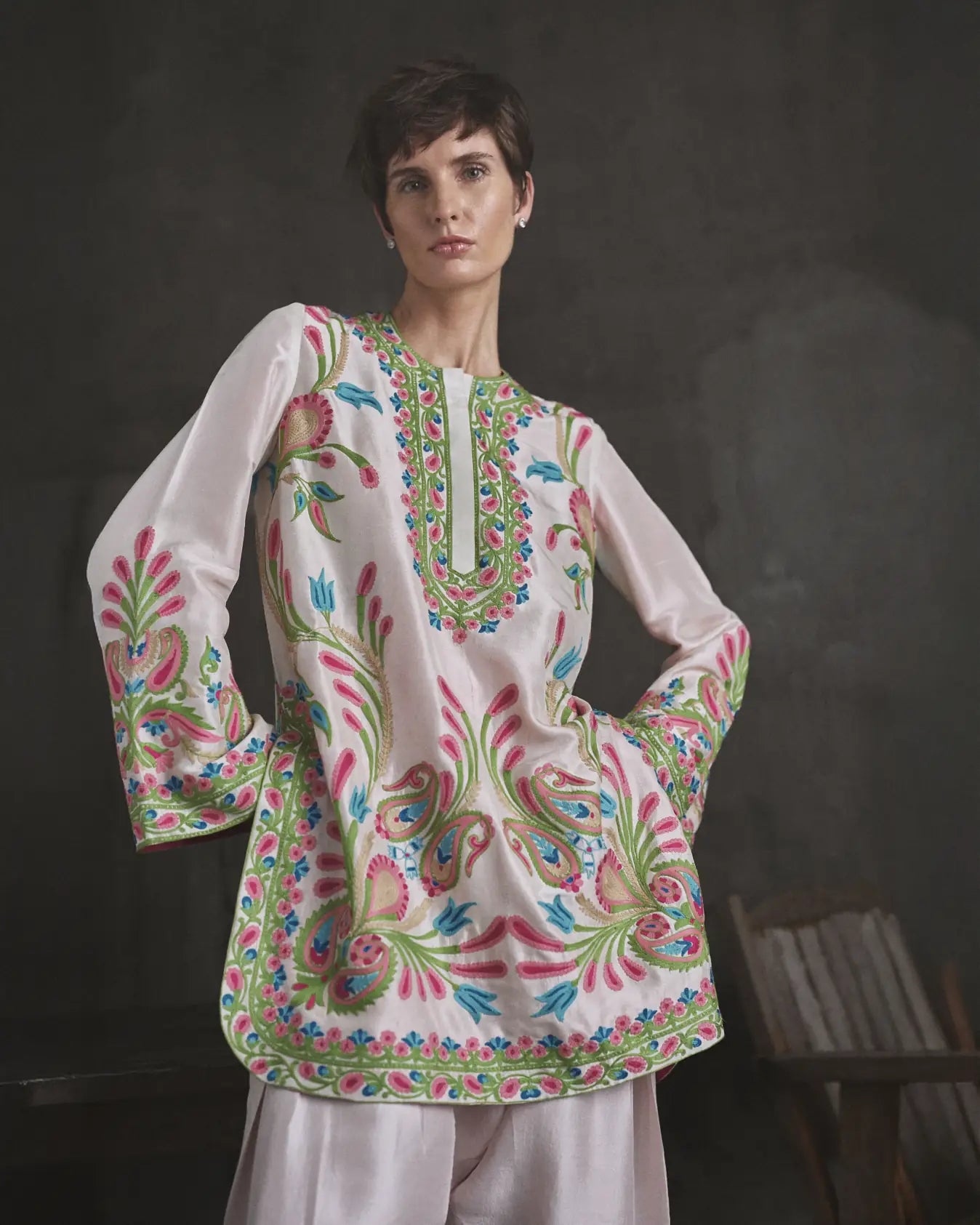 Shirt: The garment is crafted from a tea pink 80 grams pure raw silk features a relaxed, straight cut tunic that hits mid-thigh.A clean, round neckline featuring a partial placket (slit) at the center front, which maintains a sleek, structured look. Long, straight sleeves that finish with a wide, decorative border at the cuffs. A subtly curved or "u-cut" hemline that adds softness to the overall structure, complemented by side slits.The outfit has an intricate multicoloured threadwork. A dense, frame-like border on neckline and placket, large, stylized paisleys are featured prominently on the lower front and back.Elongated floral stems rise from the hem and cuffs.The hem and cuffs are finished with a thick, structured border featuring a repeating geometric and floral pattern, providing a weighted, high-end finish.