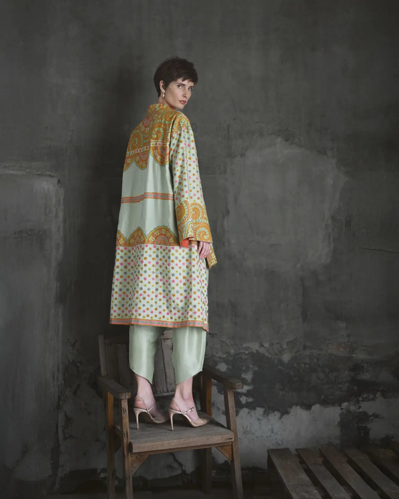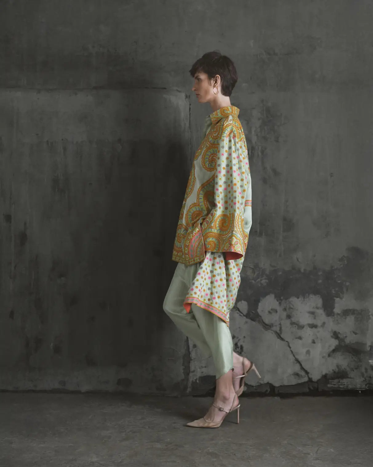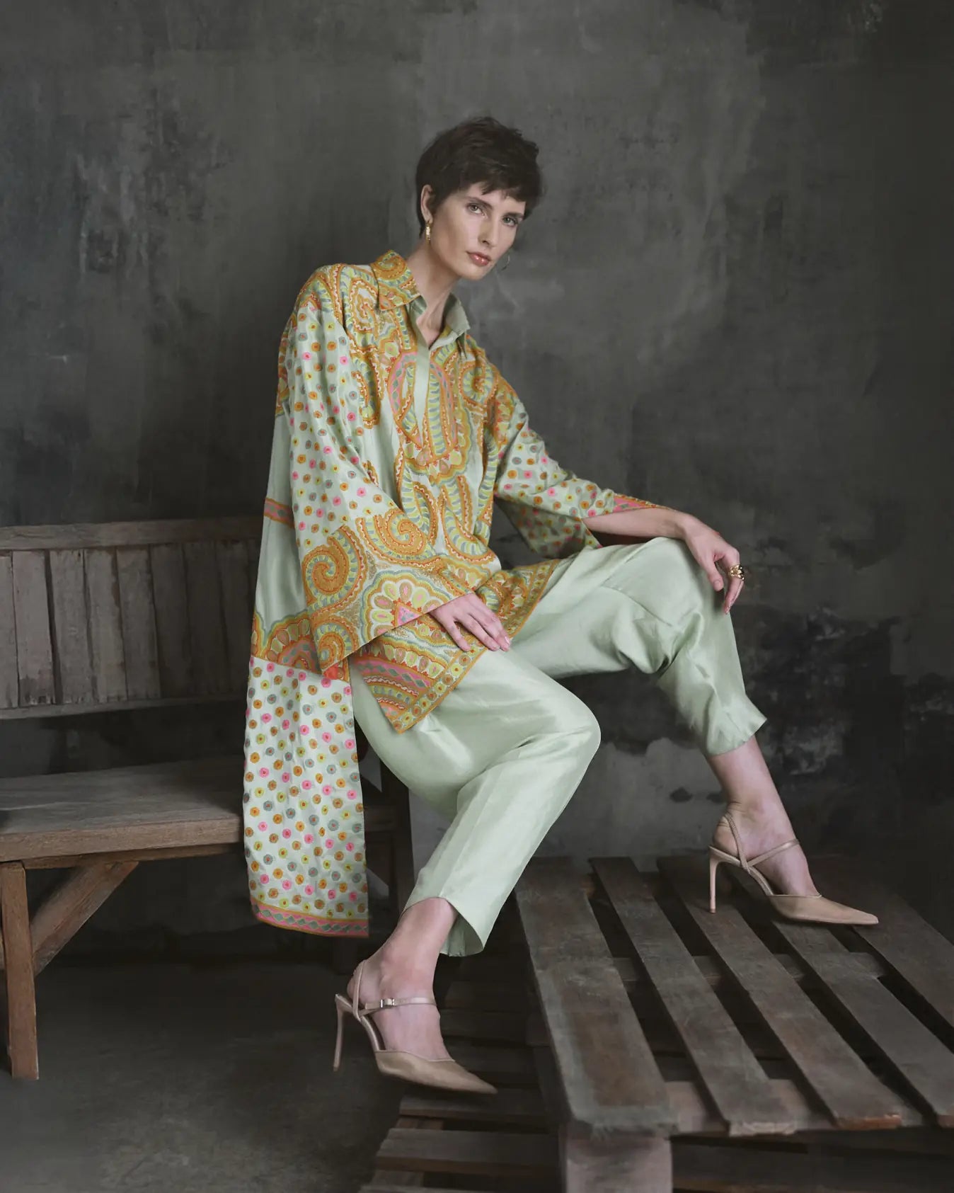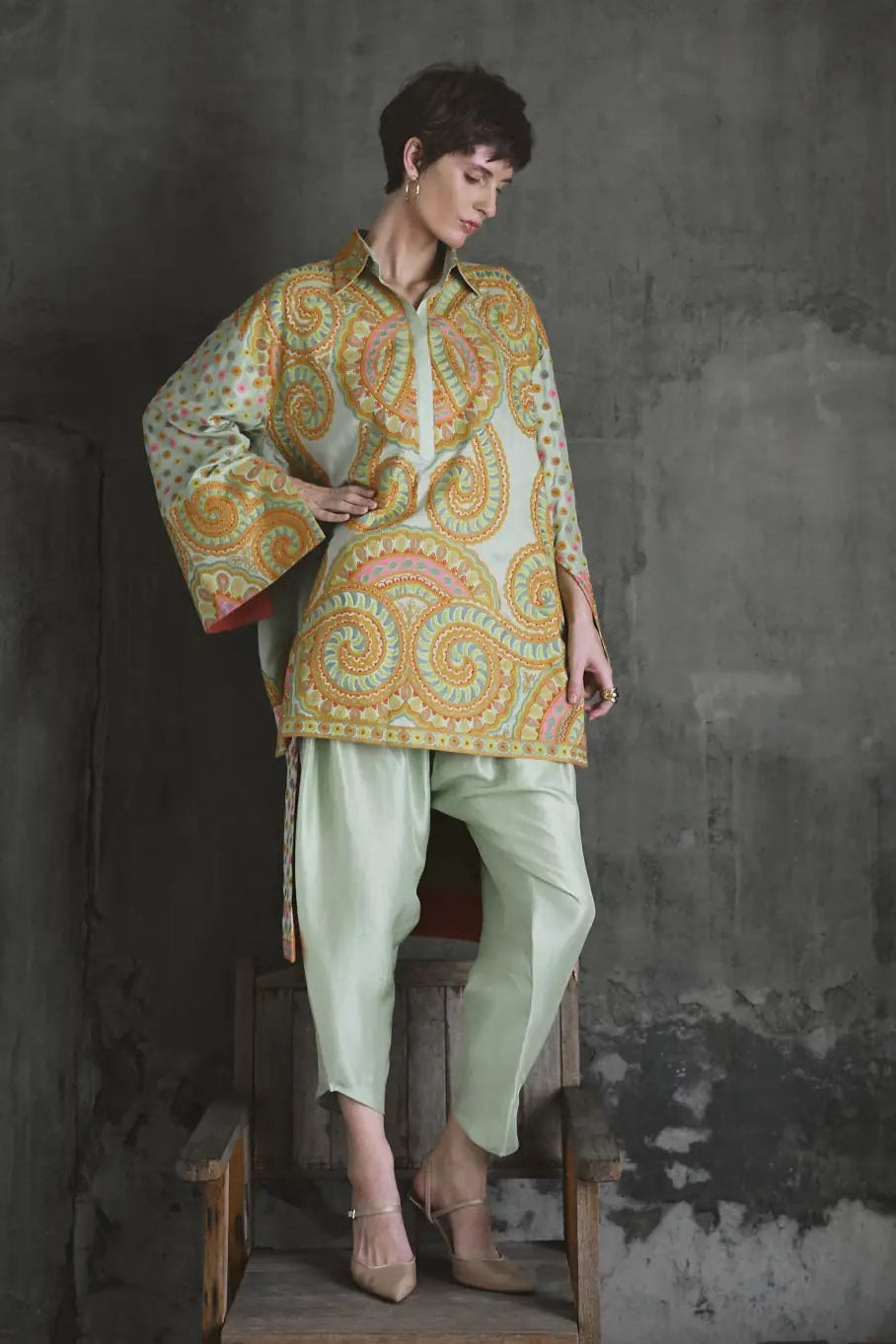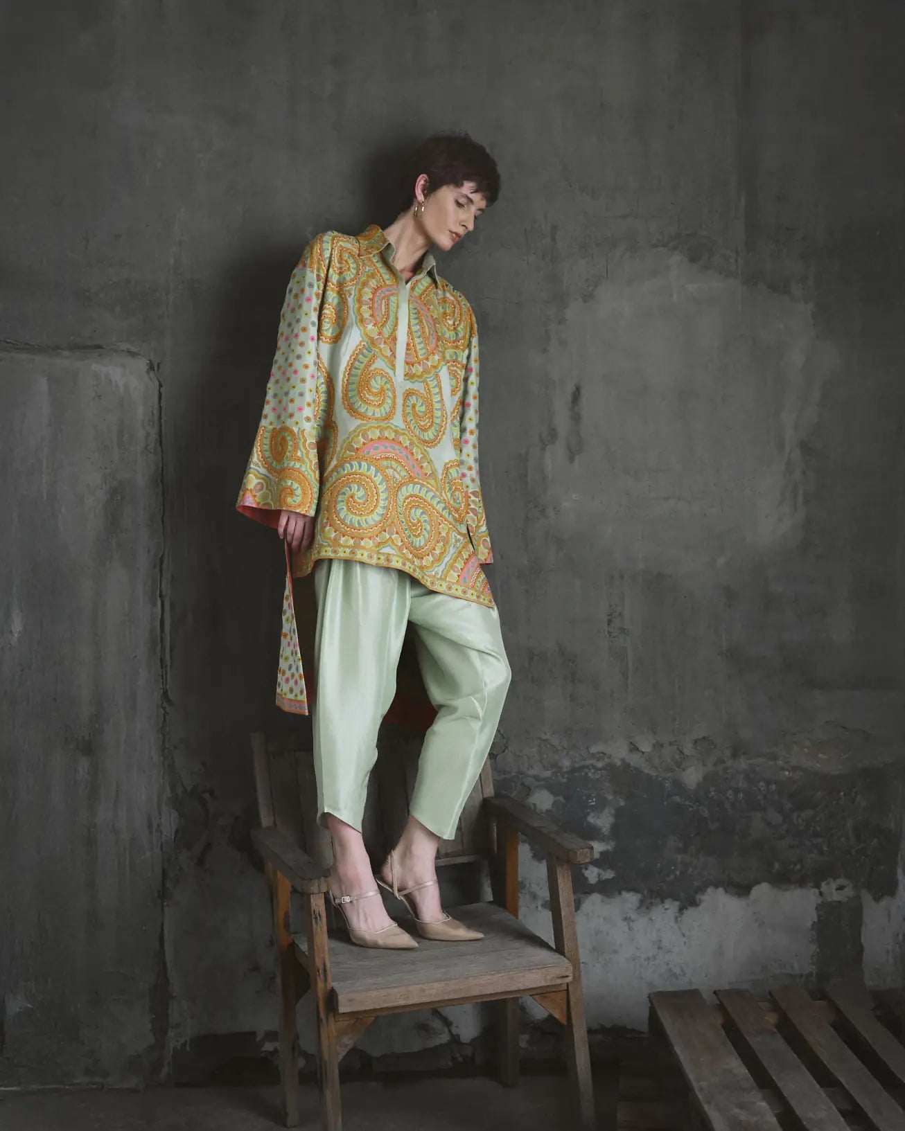 Shirt: A mid-length, straight-cut tunic crafted from a gold-beige 80 grams pure raw silk raw silk fabric.The garment features a dramatic Black paisley and floral motif. These patterns are densely applied to the lower half of the shirt and the sleeves.It features a slit round neckline embellished with delicate black beaded trim.The sleeves are full-length and wide, mirroring the heavy paisley embroidery on the hem.