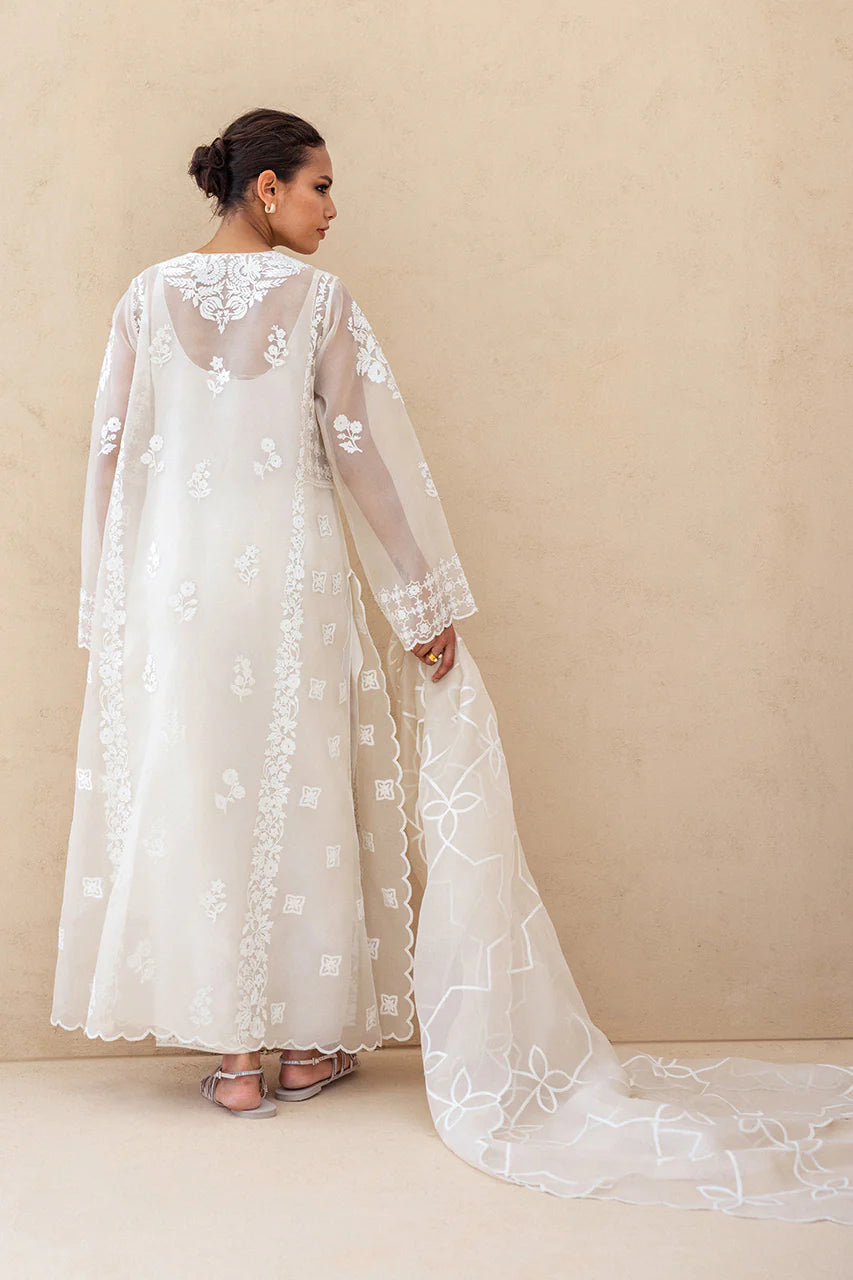 This pristine ivory ensemble captures an aura of timeless, angelic grace through delicate textures and ethereal layering. The centrepiece is a sheer, floor length organza kurta featuring a rich tapestry of tonal ivory embroidery. It is paired with matching pure rawsilk culottes and a flowing organza dupatta detailed with subtle geometric motifs.