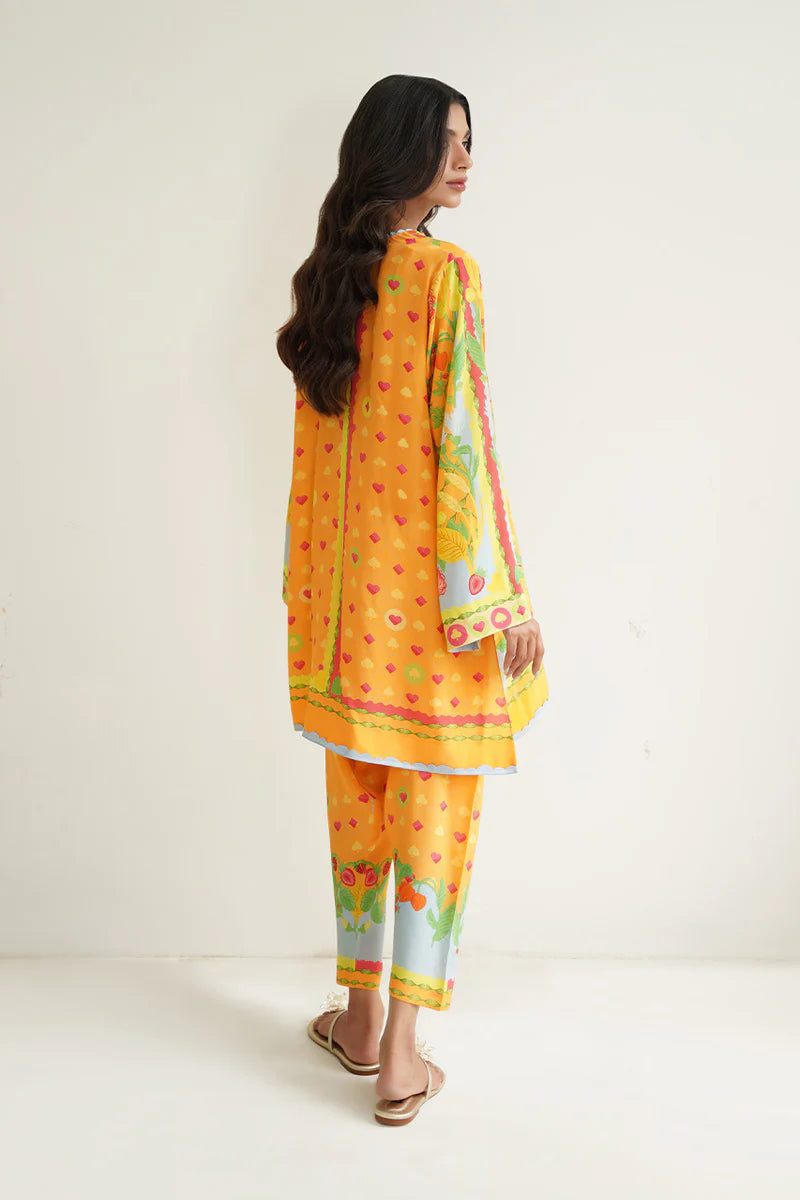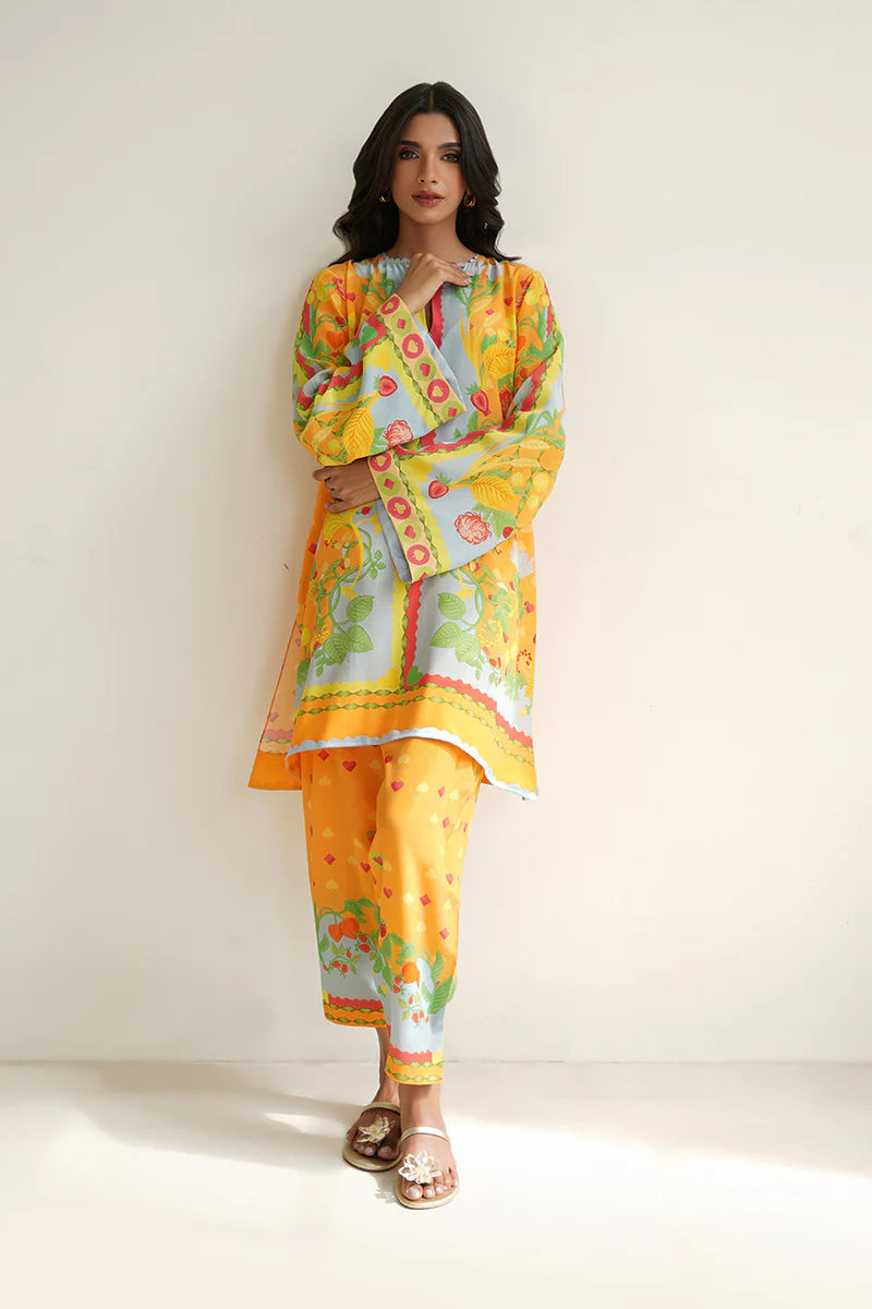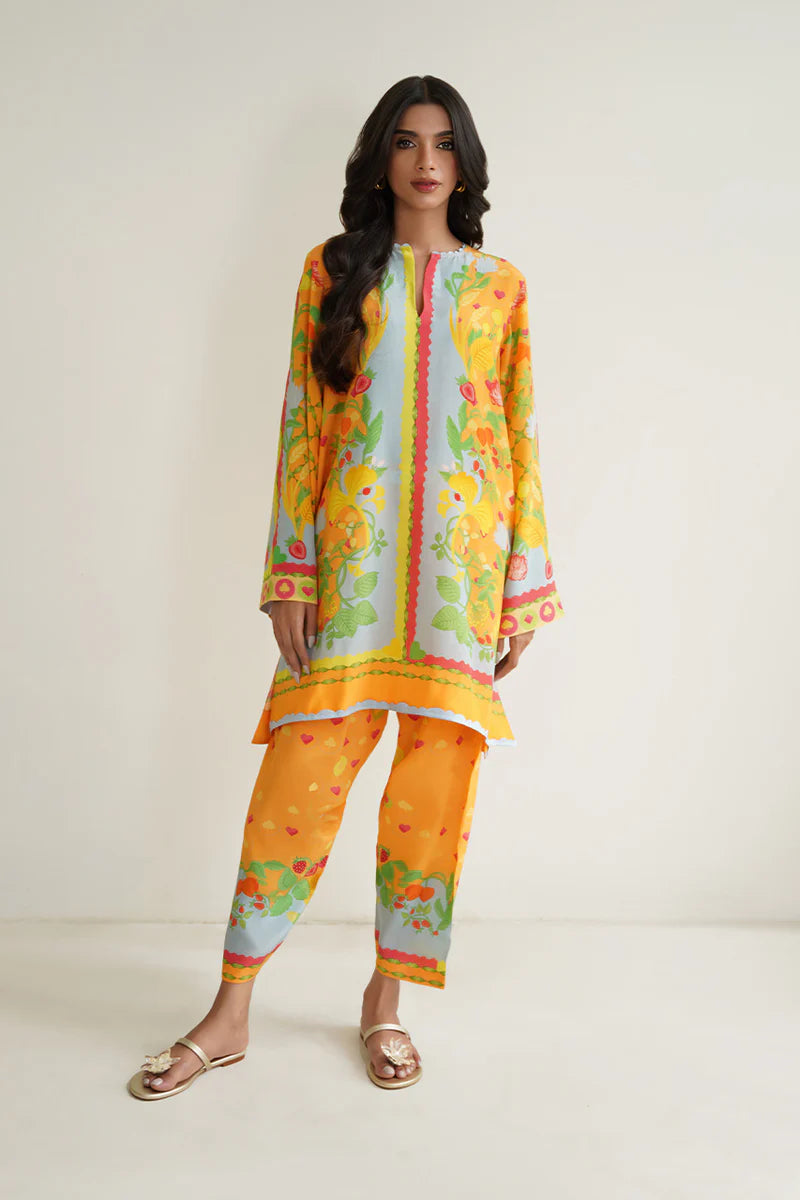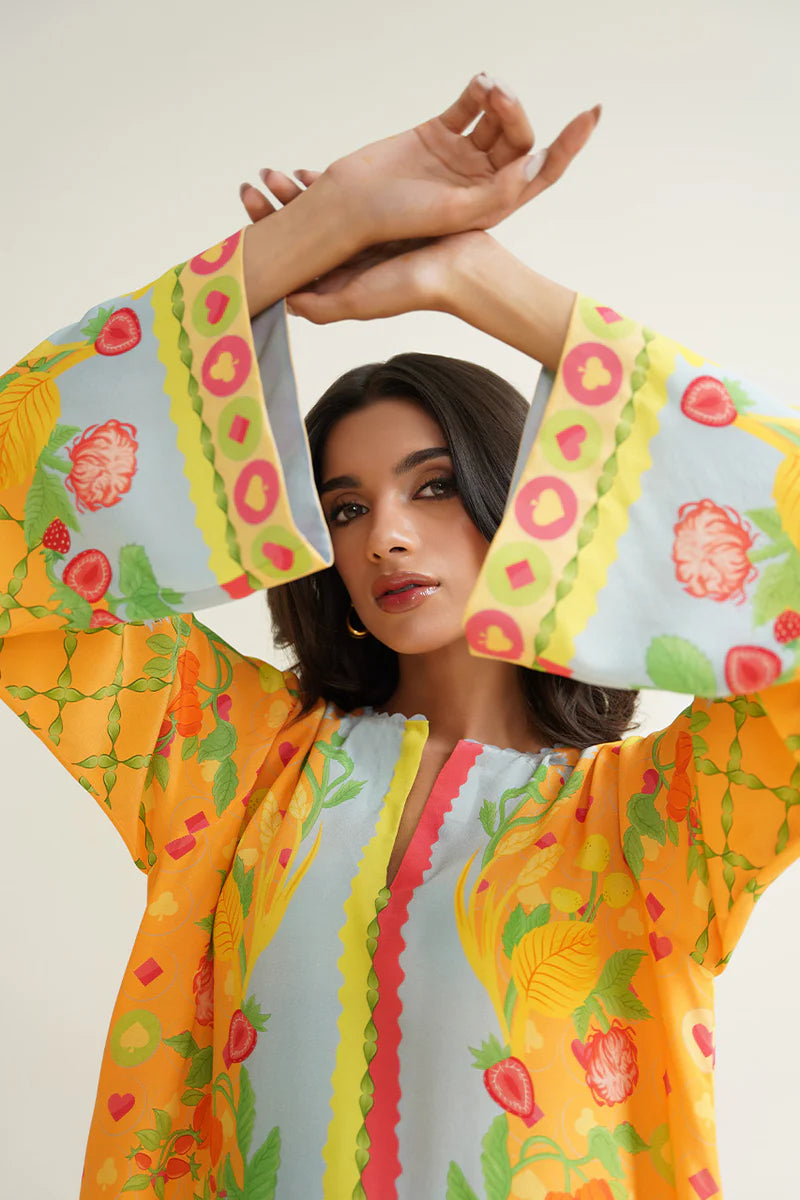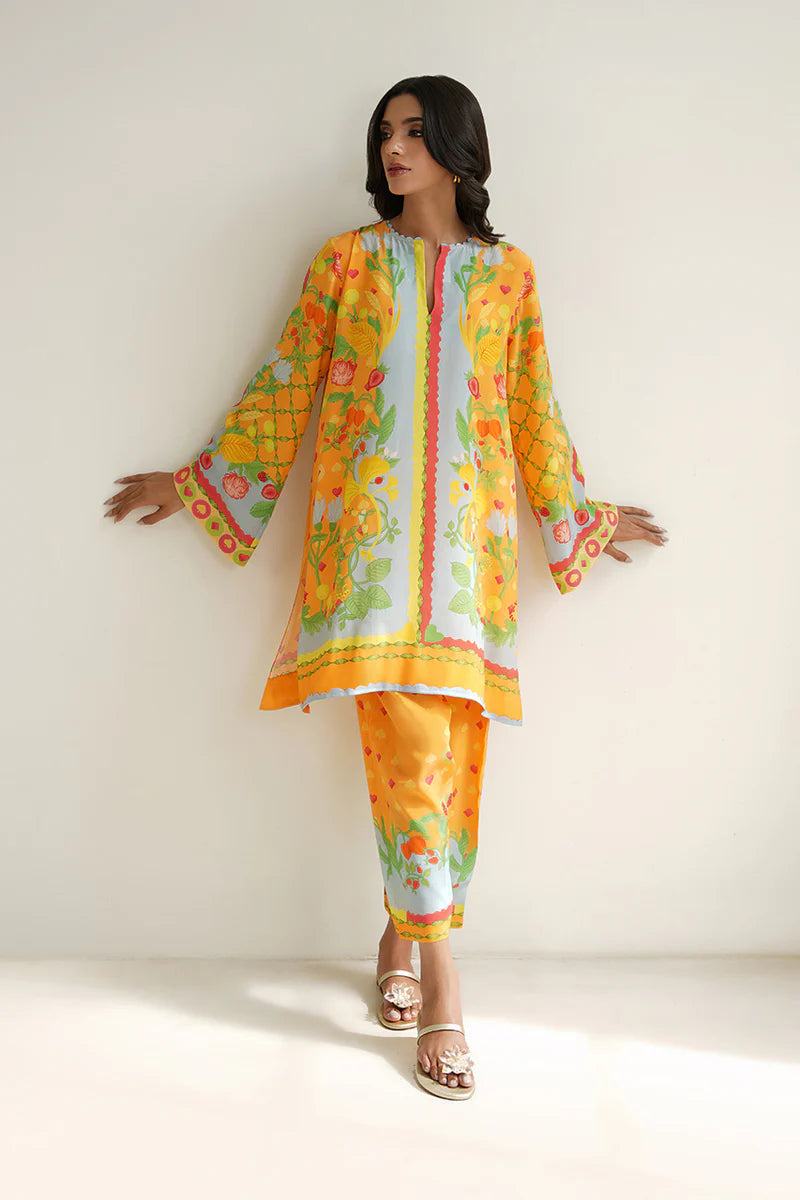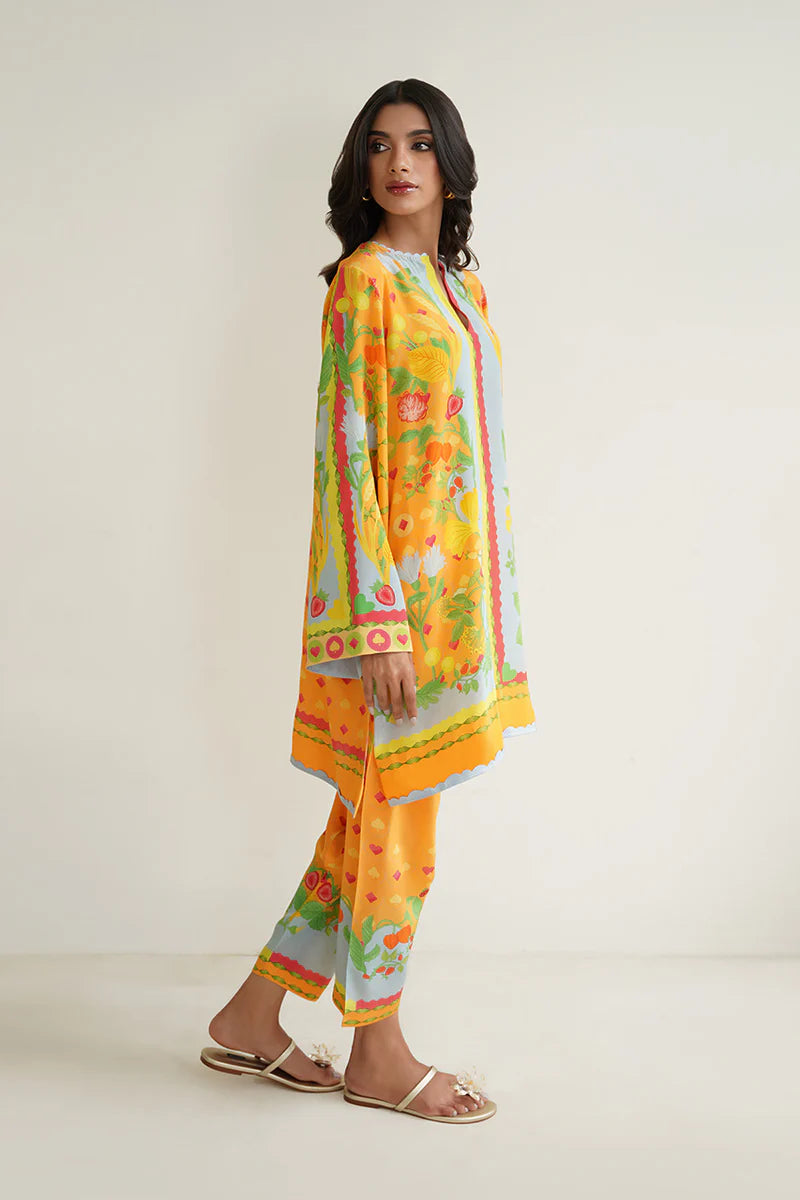 A playful composition inspired by mystical gardens and an exciting game of cards, Ejal (A) is a quintessential Sania Maskatiya print, made timeless with a simplistic cut. The sunshine yellow and powder blue hue combines with pops of tangerine and strawberry red, in the crepe set, to perfect a look that can effortlessly go from work to vacation.