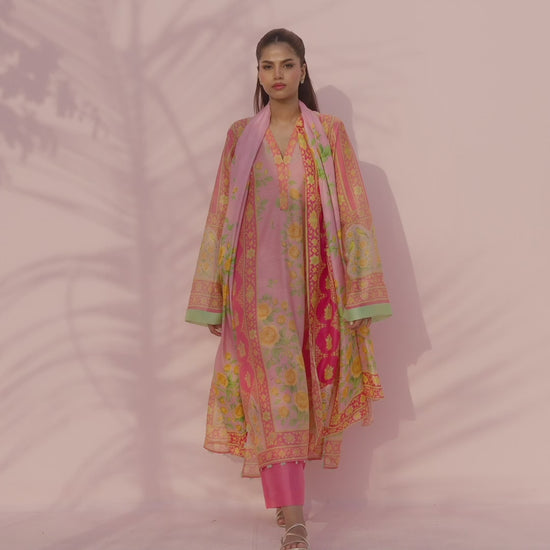 This soft peach and blush ensemble is brought to life with a delicate floral print in gentle tangerine and lime tones. The cotton net shirt features a relaxed silhouette, defined by colour blocked panels and finished with subtle detailing at the split neckline and sleeves. Coordinated pure rawsilk trousers add balance and continuity. A flowing medium silk printed dupatta completes the look with lightness and effortless elegance.