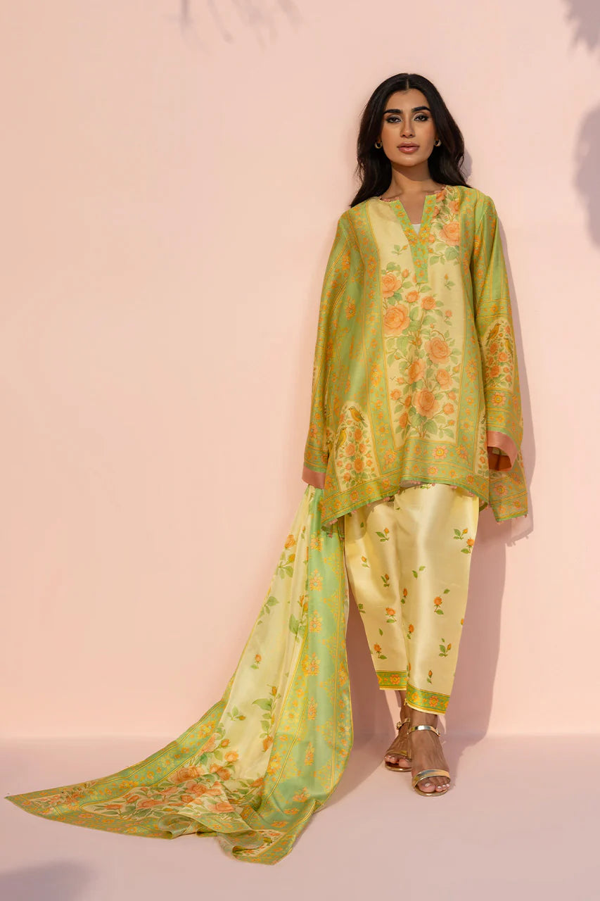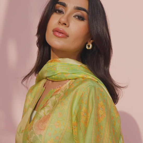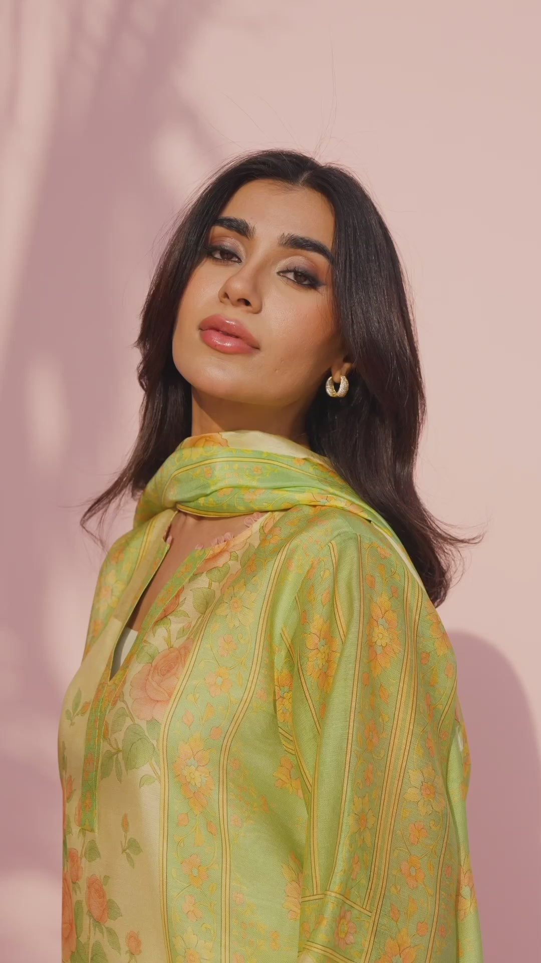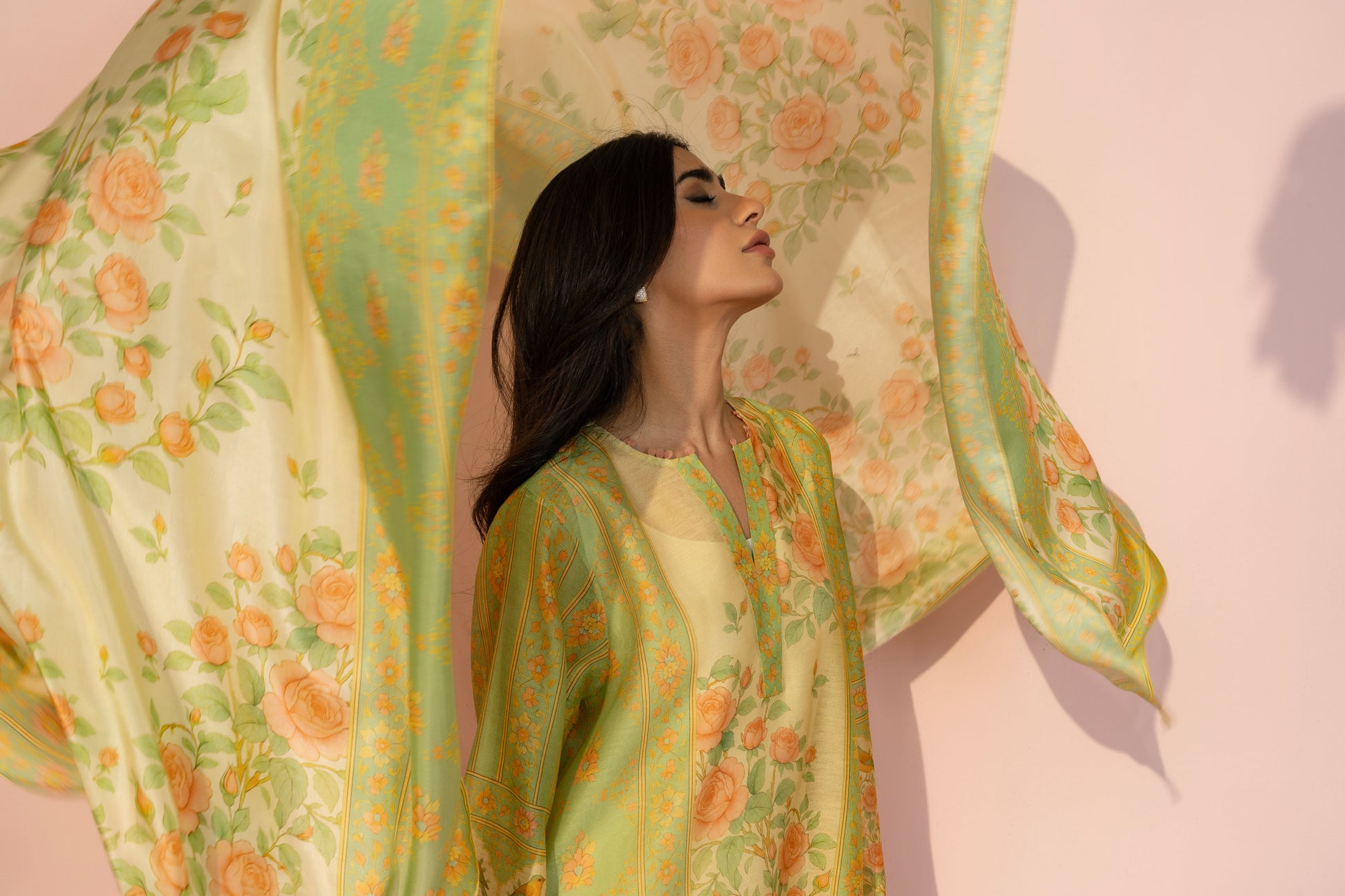 This lemon yellow and lime ensemble is brought to life with a delicate floral print in soft peach and lime tones. The cotton net shirt features a relaxed silhouette, defined by colour blocked panels and finished with subtle detailing at the split neckline and sleeves. Coordinated pure rawsilk shalwar carries scattered floral motifs, adding balance and continuity. A flowing medium silk printed dupatta completes the look, lending lightness and effortless elegance.