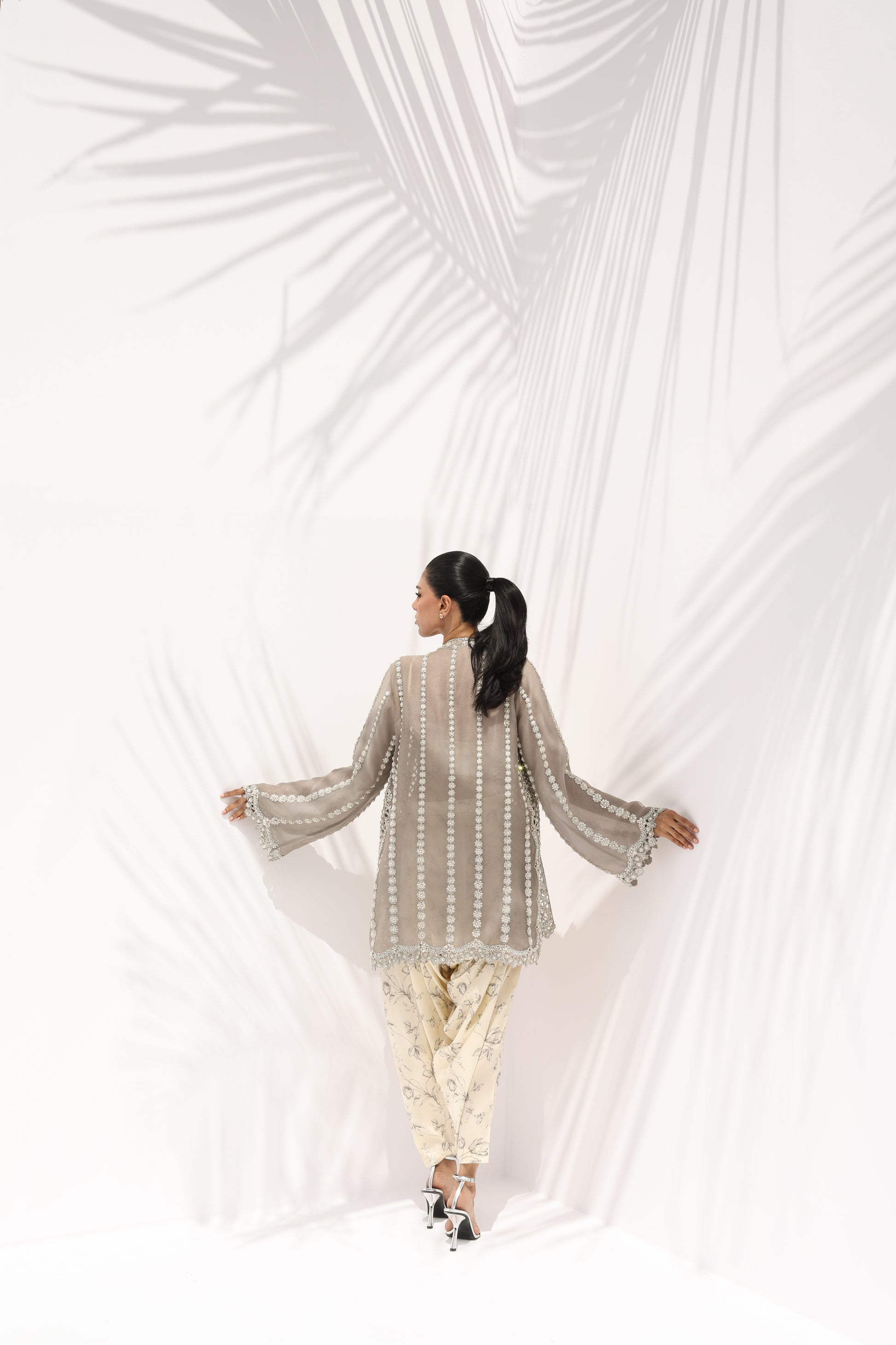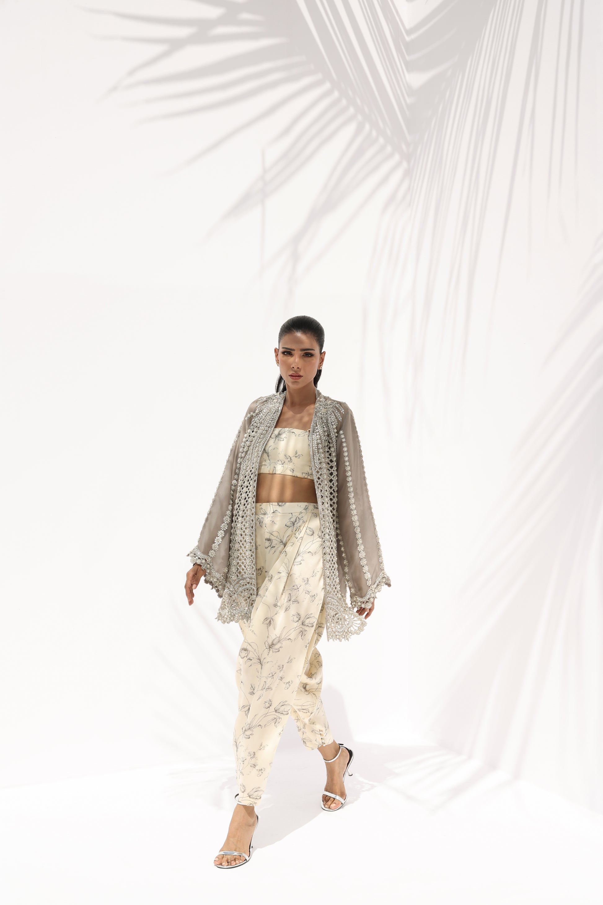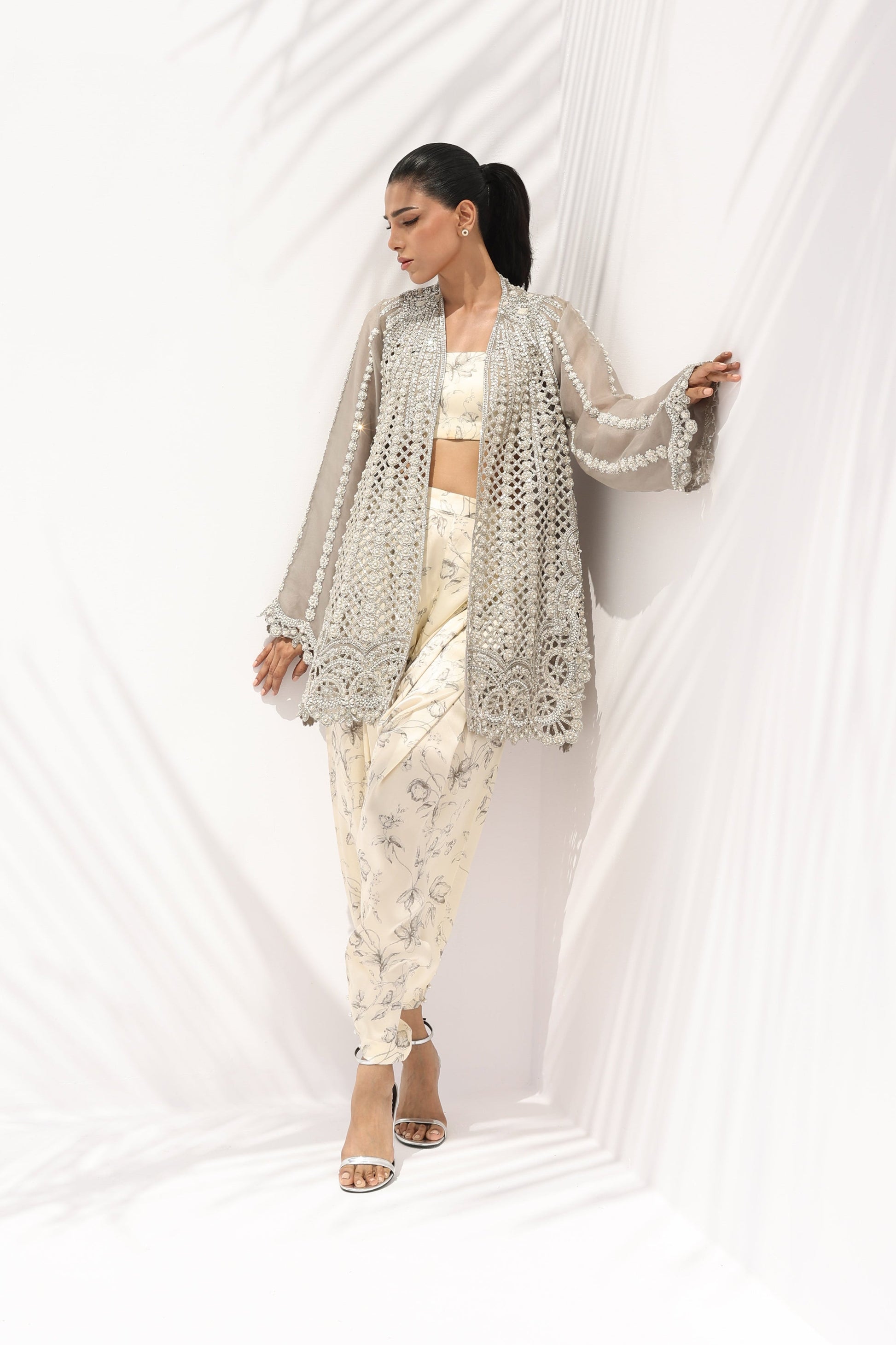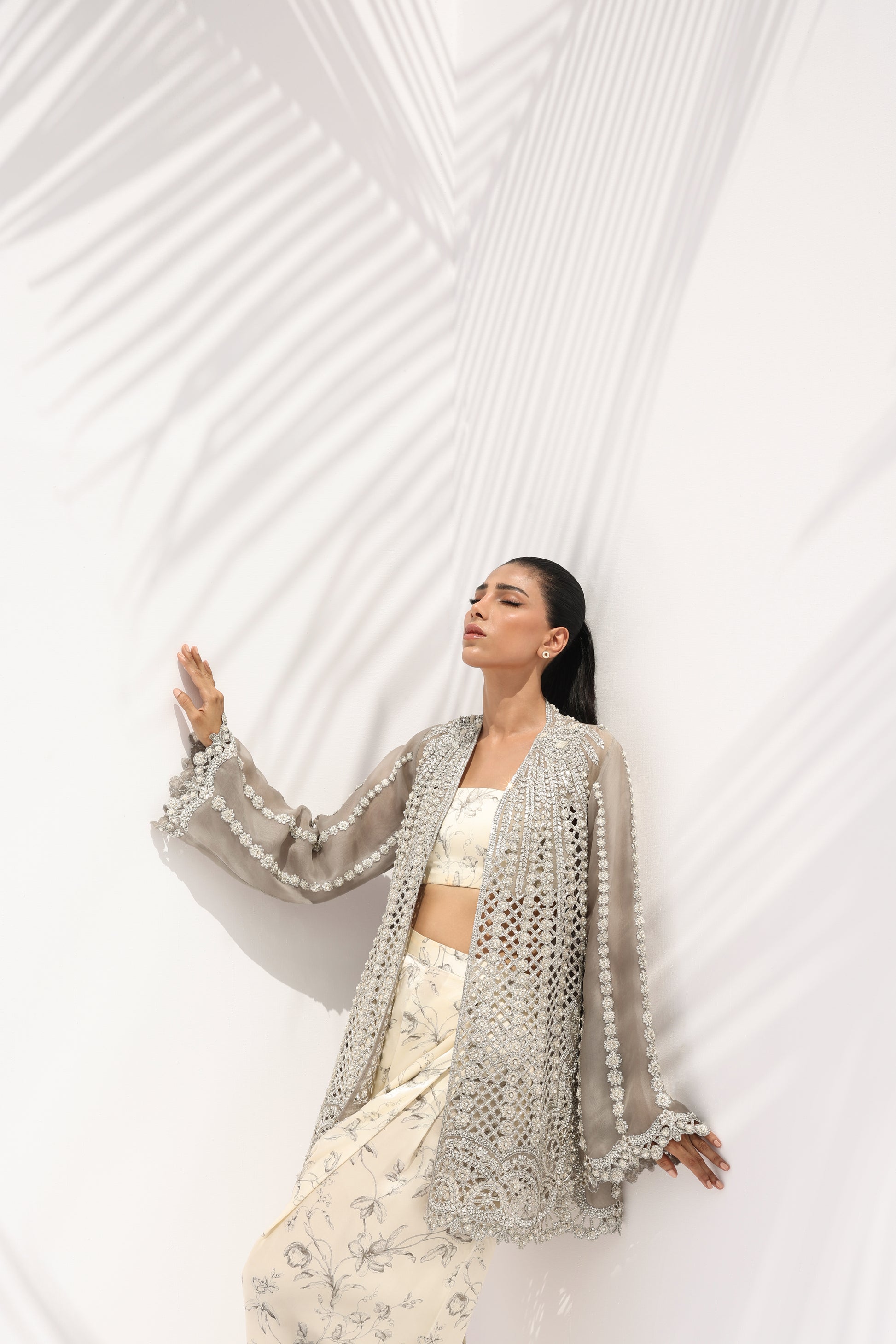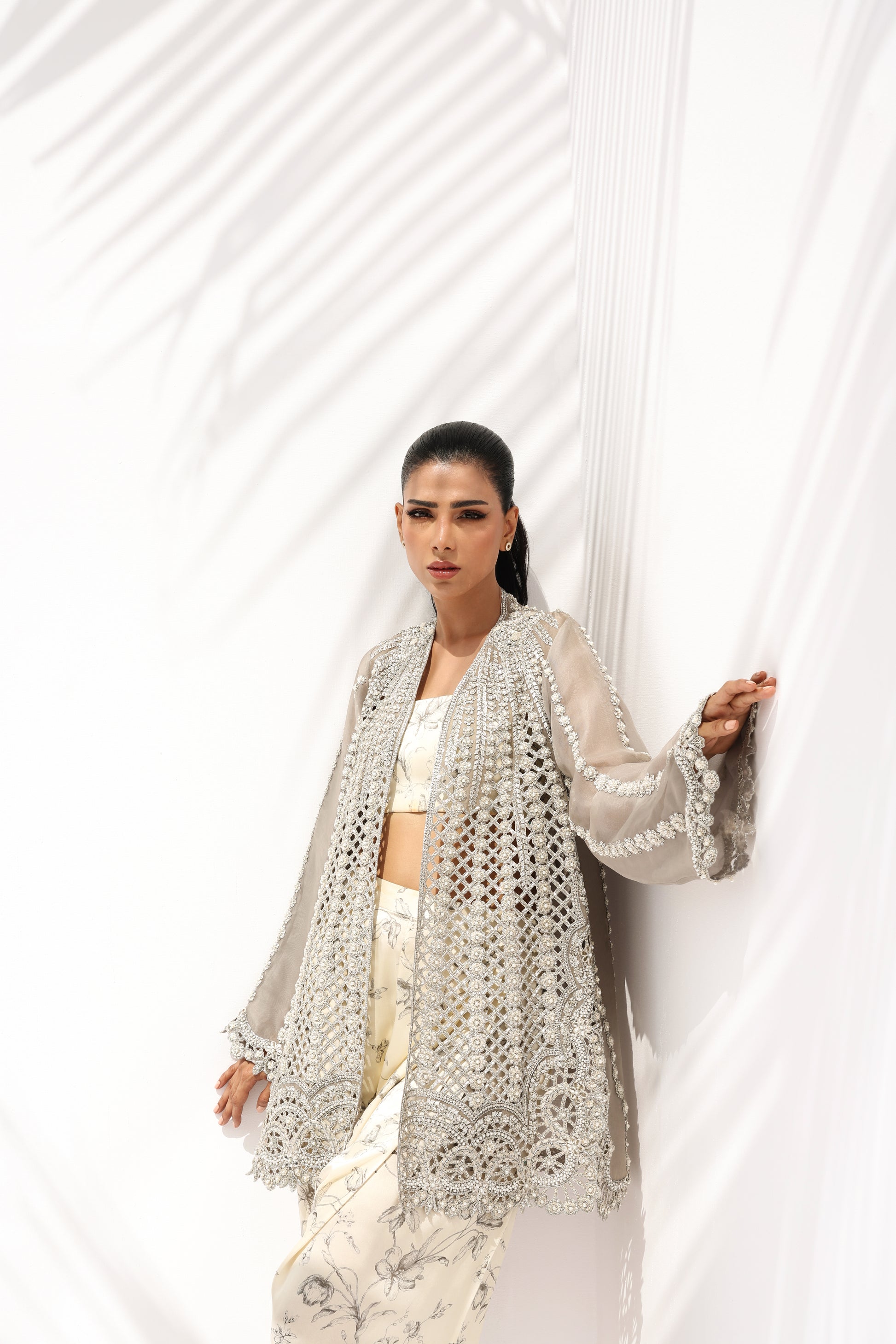 An ethereal play of shimmer and shadow, this look captures quiet regality in silvery tones that glisten like moonlight through mist. The platinum toned organza jacket is exquisitely hand-embroidered with intricate threadwork and sequined cutwork, finished with scalloped borders that gracefully frame the silhouette. Sheer sleeves traced with tonal floral embroidery lend a sense of lightness and fluidity. Worn over a painterly printed cream charmeuse bustier, the look is completed with billowing printed charmeuse shalwar in matching tones, adorned with fine botanical sketches that evoke a touch of vintage poetry.