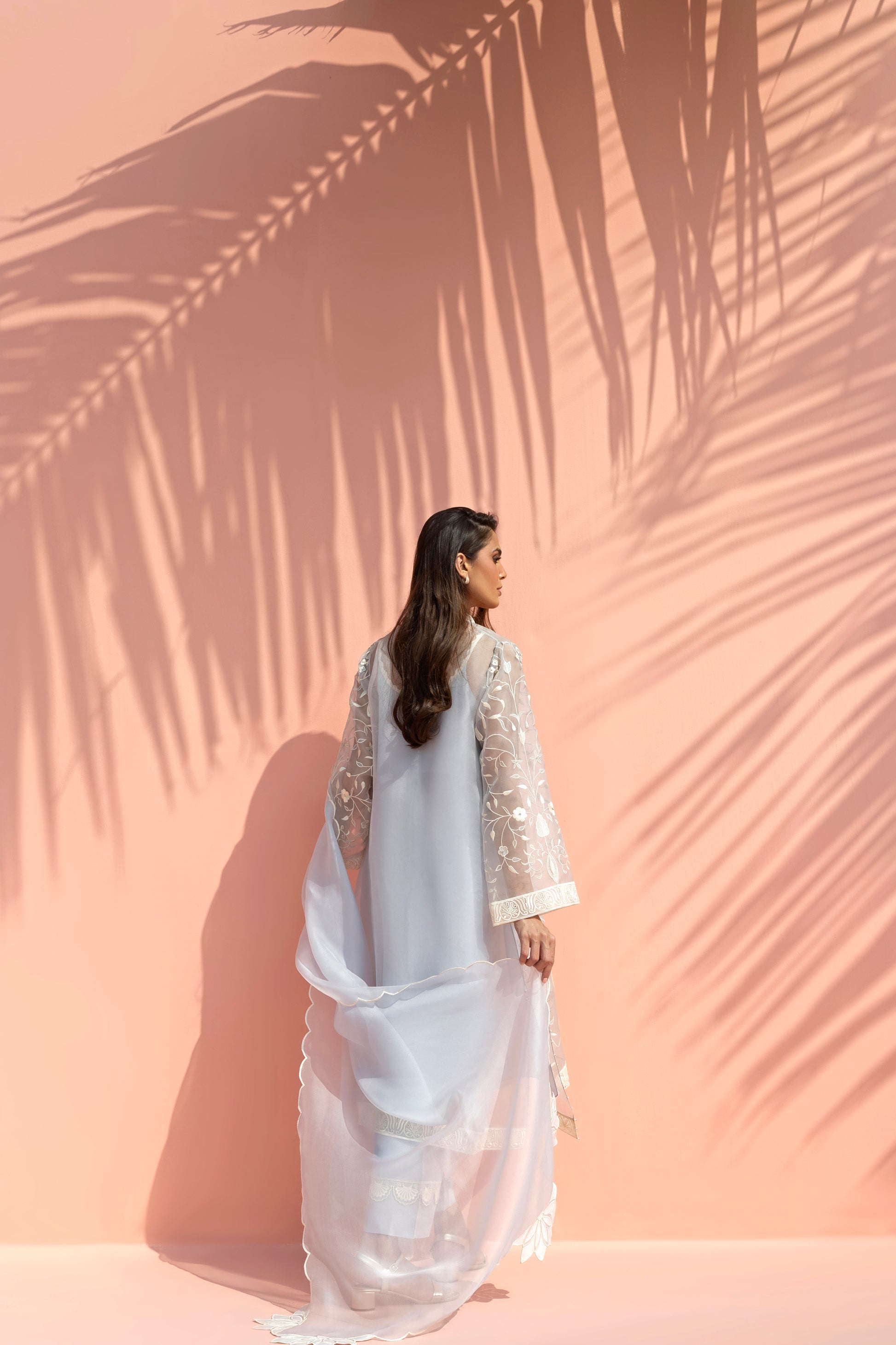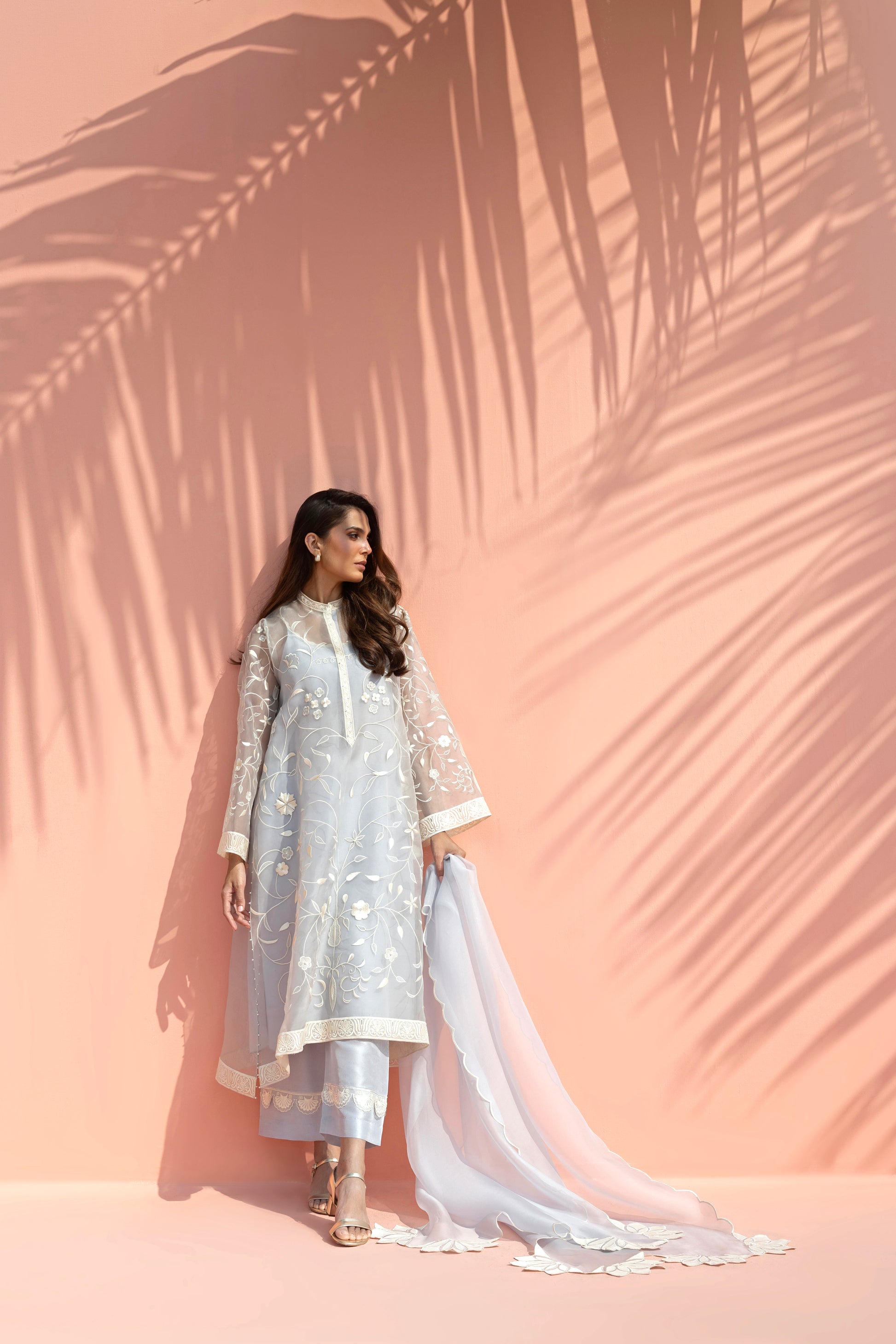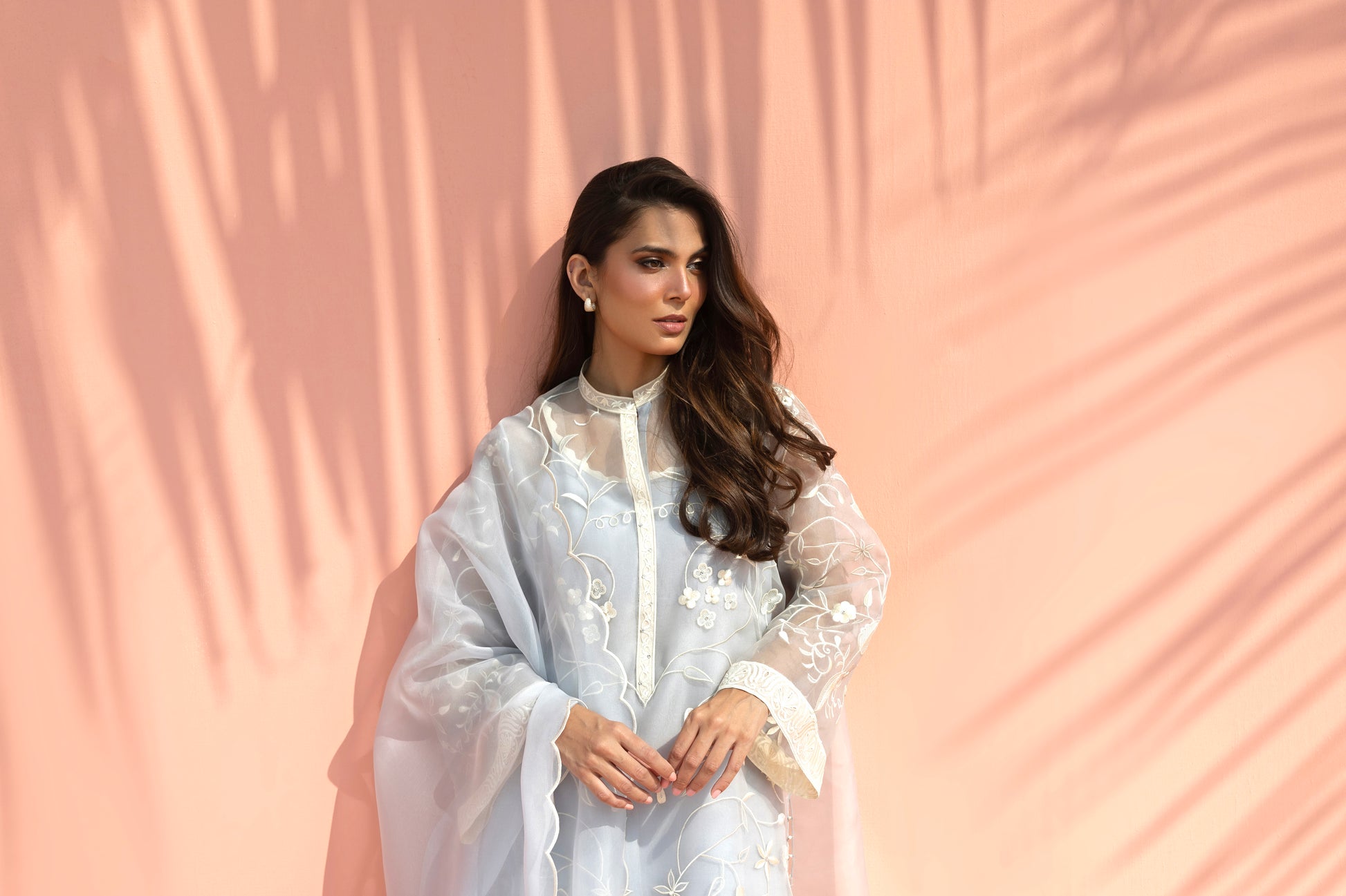 A vibrant interplay of colour and fluid drape defines this georgette ensemble, rendered in a striking aquamarine hue layered with bold painterly florals in vivid cobalt tones. The silhouette is anchored by a halterneck blouse with a soft V neckline, cinched at the waist with pleat detailing. It is paired with a fluid draped skirt that gathers and falls in soft folds, creating natural movement, while a matching pre draped dupatta, attached to the skirt and gathered into stylised folds at the shoulder, envelops the silhouette. Delicate tassel accents punctuate the edges, adding subtle movement and a playful finish to the ensemble.