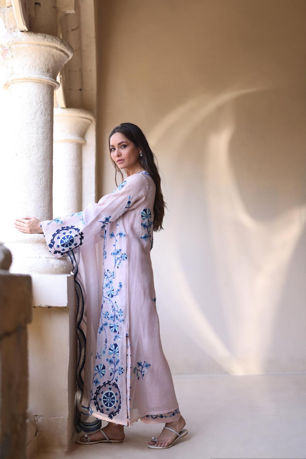 A statement salmon hued shirt is adorned with intricate cerulean aari embroidery, inspired by botanical motifs, cascading effortlessly down the khaddi corduroy canvas. Accented with applique details, the shirt is paired with an organza dupatta featuring aari embroidery and scalloped borders. Salmon toned matching pure rawsilk trousers complete the look.