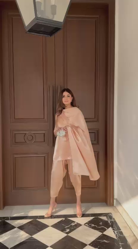 This elegant chamuse silk short shirt is paired with a chic skinny shalwar for a sleek, contemporary silhouette. The kurta features an attached scarf that adds a refined and graceful finish, making the ensemble effortlessly sophisticated.