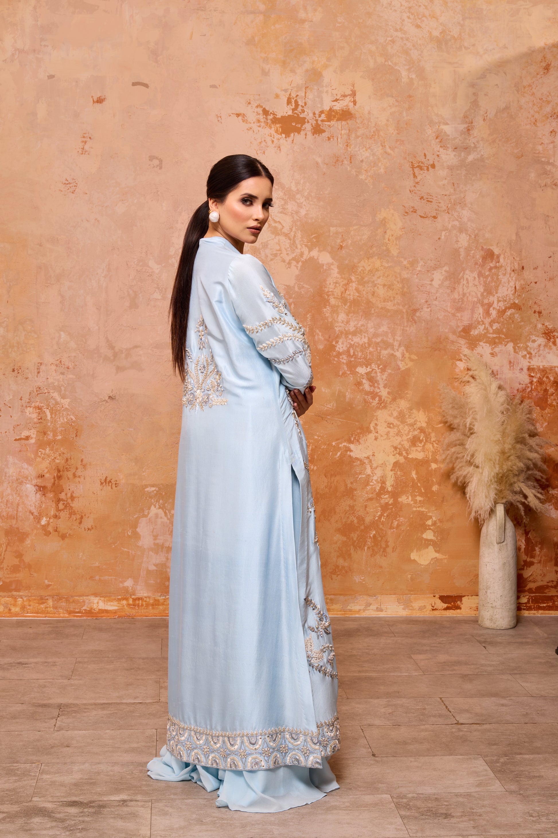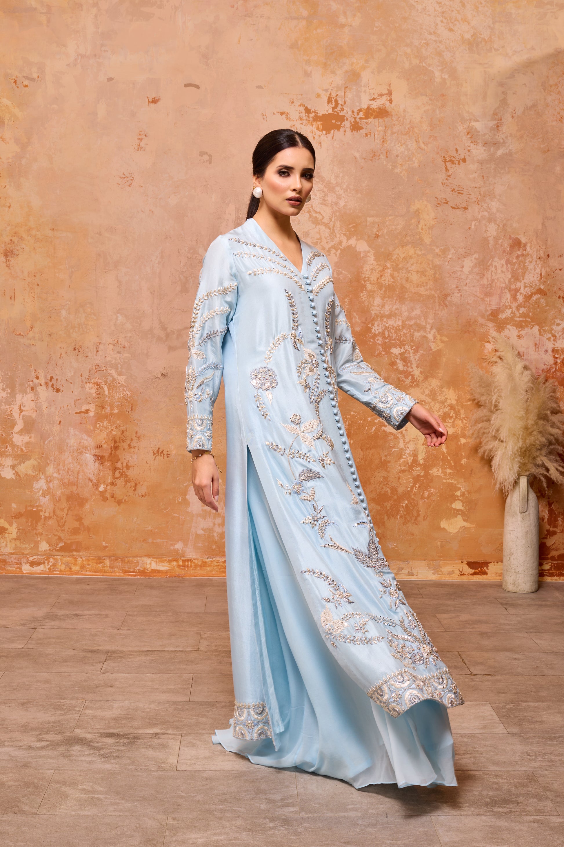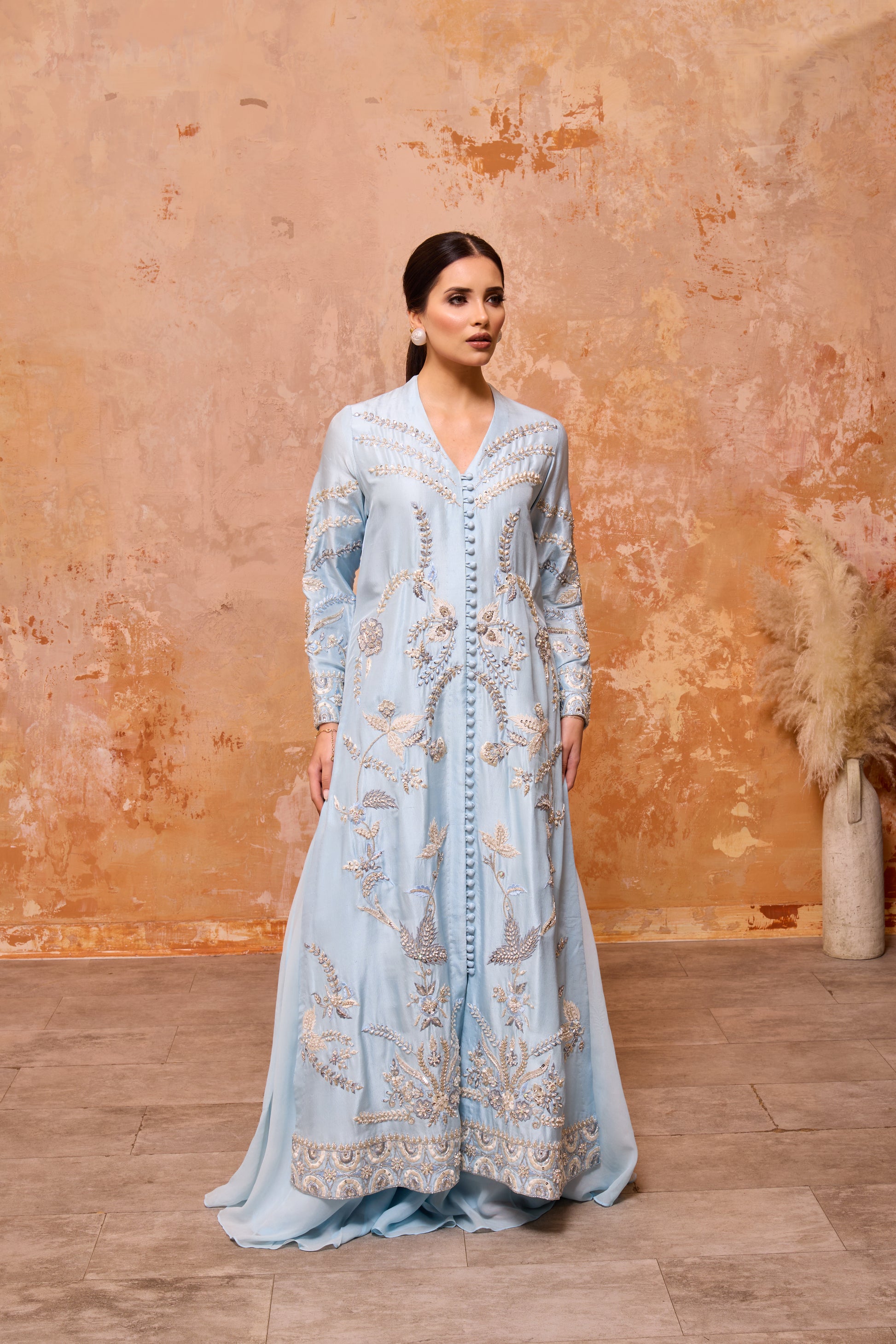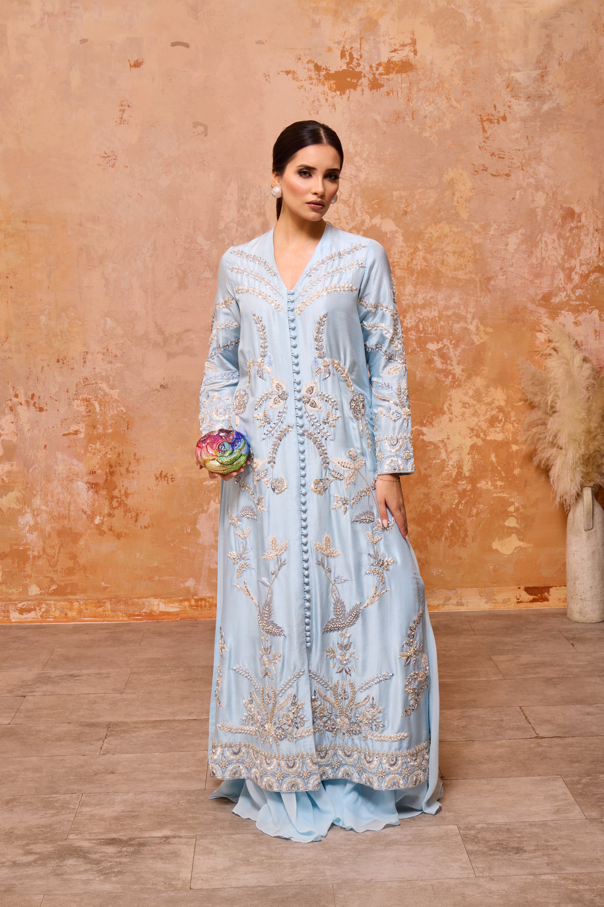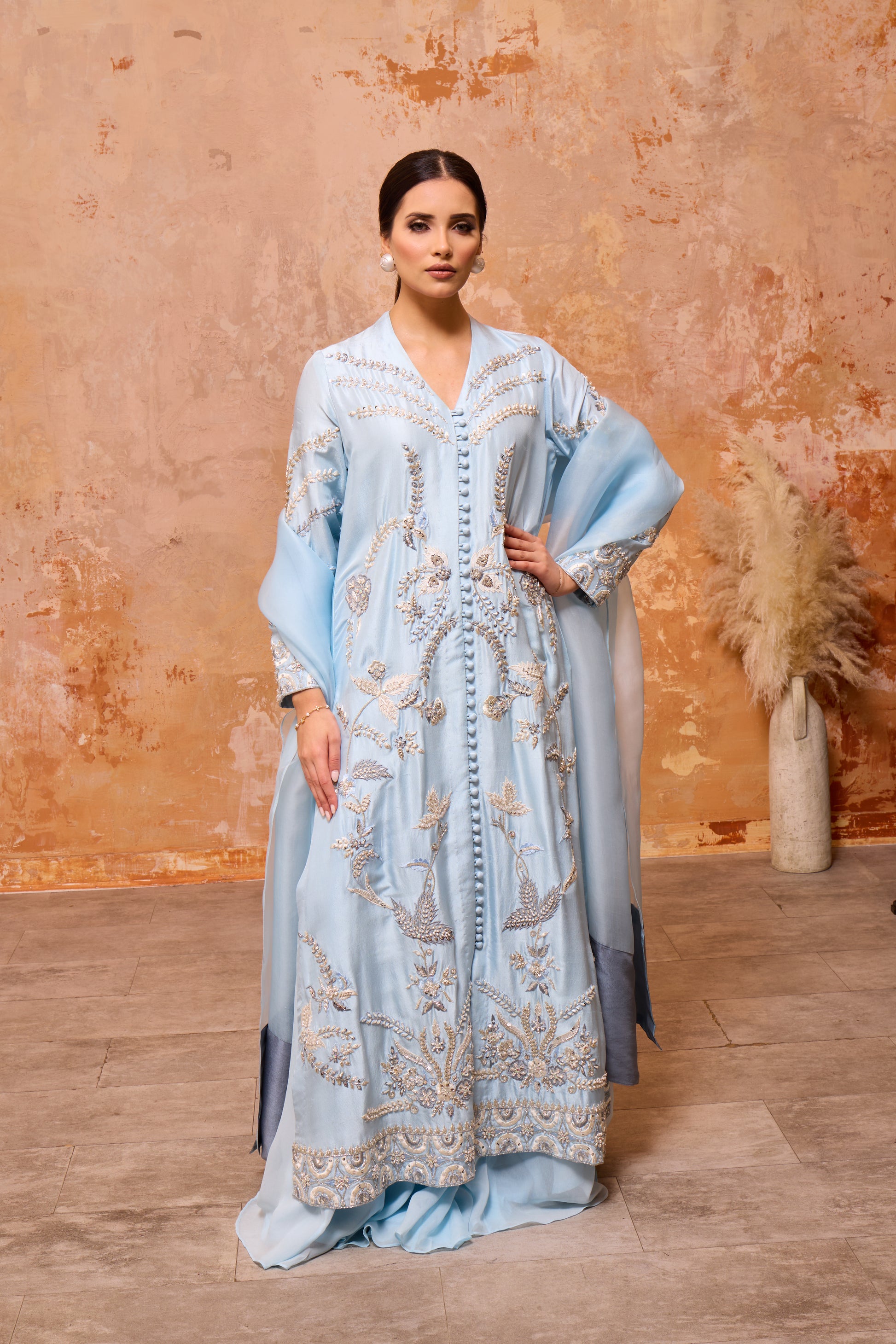 Luxurious velvet front-open A-line shirt with raw silk appliqué in contrast tones, embellished with intricate zardozi, kora, dabka, pearls, beads, and crystals. Paired with a chiffon-georgette full-gathered sharara and an organza dupatta for a timeless, elegant look.