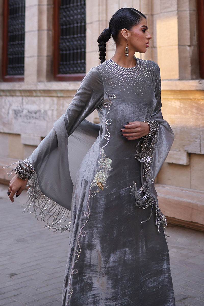 An elegant Desert Sage kaftan crafted from pure velvet, adorned with exquisite hand-stitched stonework featuring zari, resham, cutdana, sequins, dabka, and nakshi detailing on the front, back, and sleeves. The silhouette is thoughtfully designed with functional pockets for added ease. Paired with a refined shrug in diamond silk and culottes or pants tailored from soft cotton charmeuse, this ensemble blends luxurious craftsmanship with understated sophistication—a perfect choice for timeless festive charm.