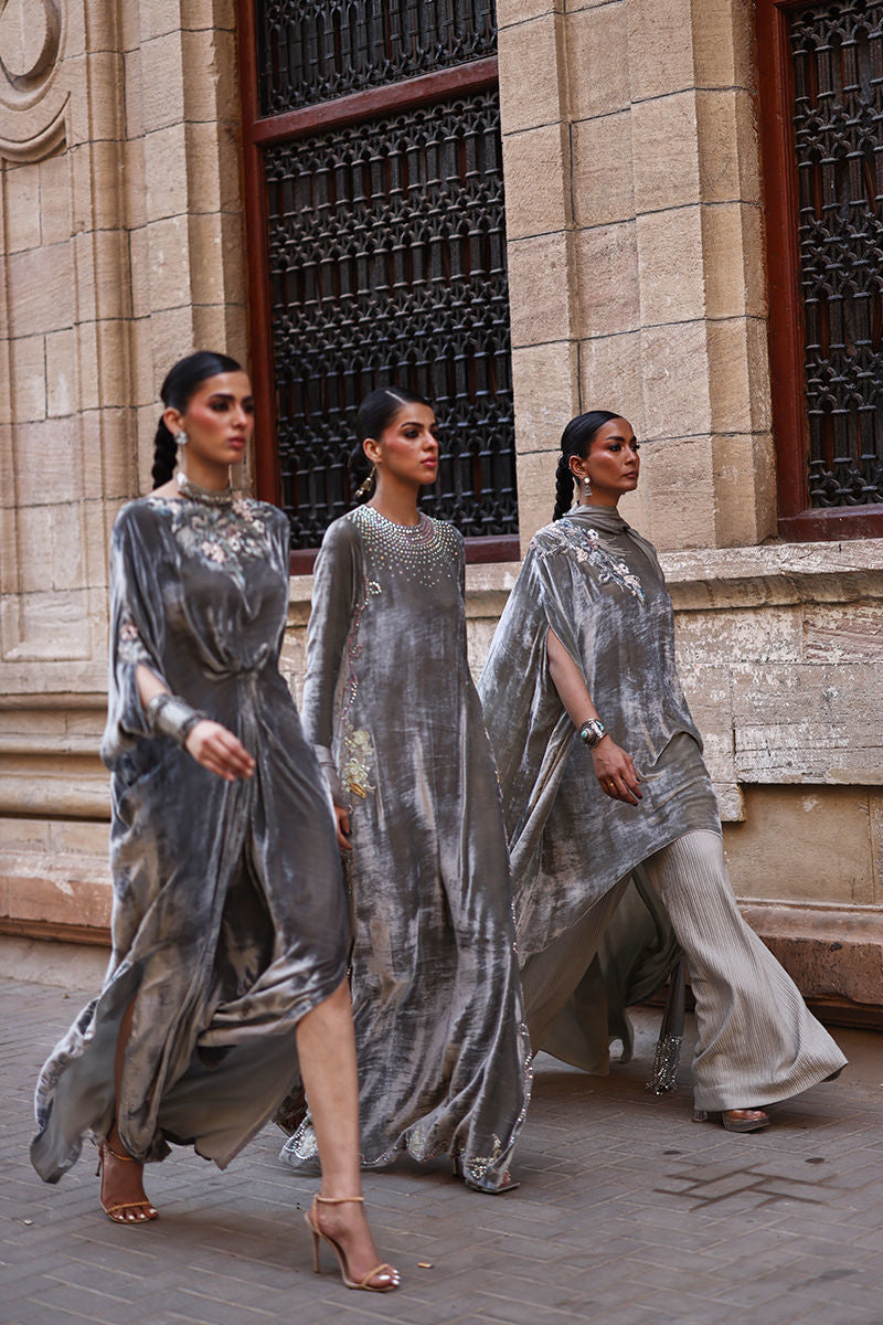 This high-low silhouette in luxurious pure velvet exudes contemporary elegance, paired with pleated culottes for a modern, flowing look. The ensemble features an attached stole in pure medium silk, adding grace and sophistication. Both the front and back are adorned with intricate zari and colored resham embroidery, enhanced with sequins, moti, pearls, cutdana, and crystals, showcasing meticulous handwork and timeless artistry.