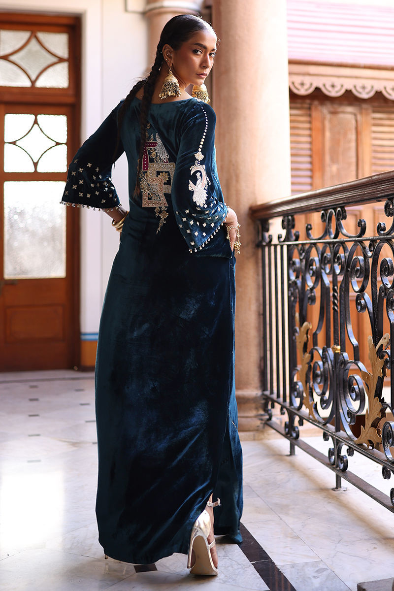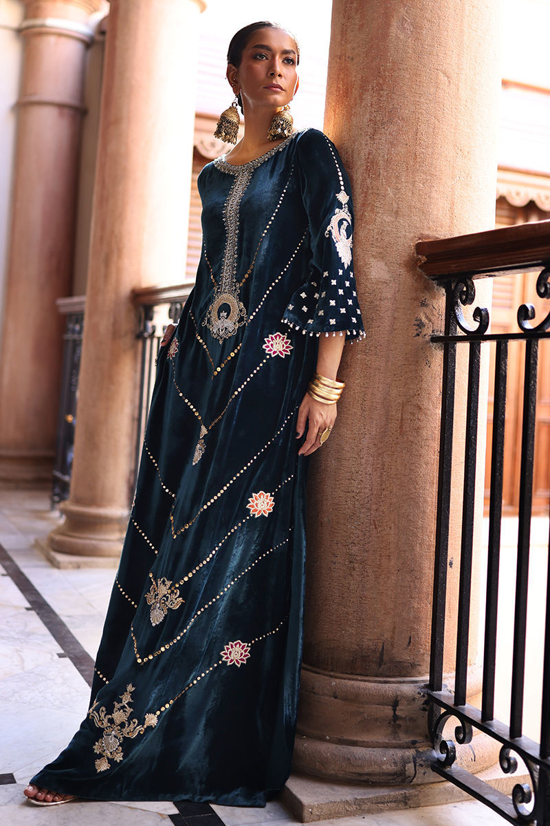 A statement kaftan crafted in luxurious pure velvet, designed with side pockets for a modern touch. The ensemble features exquisite gold and silver zari embroidery with colored appliqué work, beautifully enhanced by intricate handwork of sequins, cutdana, dabka, naqshi, tikki, and stones on the front, back, and sleeves. Delicate gota ball detailing along the sleeve edges adds a playful yet elegant finish. Paired with cotton charmeuse culottes, this Deep Lake ensemble is a perfect blend of contemporary charm and timeless craftsmanship.
