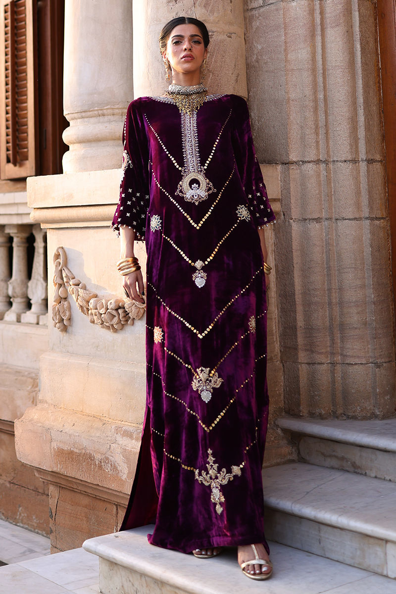 An elegant kaftan in rich magenta pure velvet, designed with side pockets for a contemporary touch. The piece features exquisite gold and silver zari embroidery accented with colored appliqué work, elevated by intricate handwork of sequins, cutdana, dabka, naqshi, tikki, and stones on the front, back, and sleeves. The gota balls delicately hanging from the sleeve edges add a playful yet sophisticated charm. Paired with cotton charmeuse culottes, this ensemble beautifully merges modern design with timeless craftsmanship.