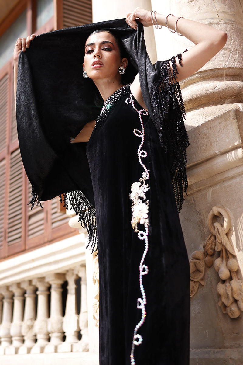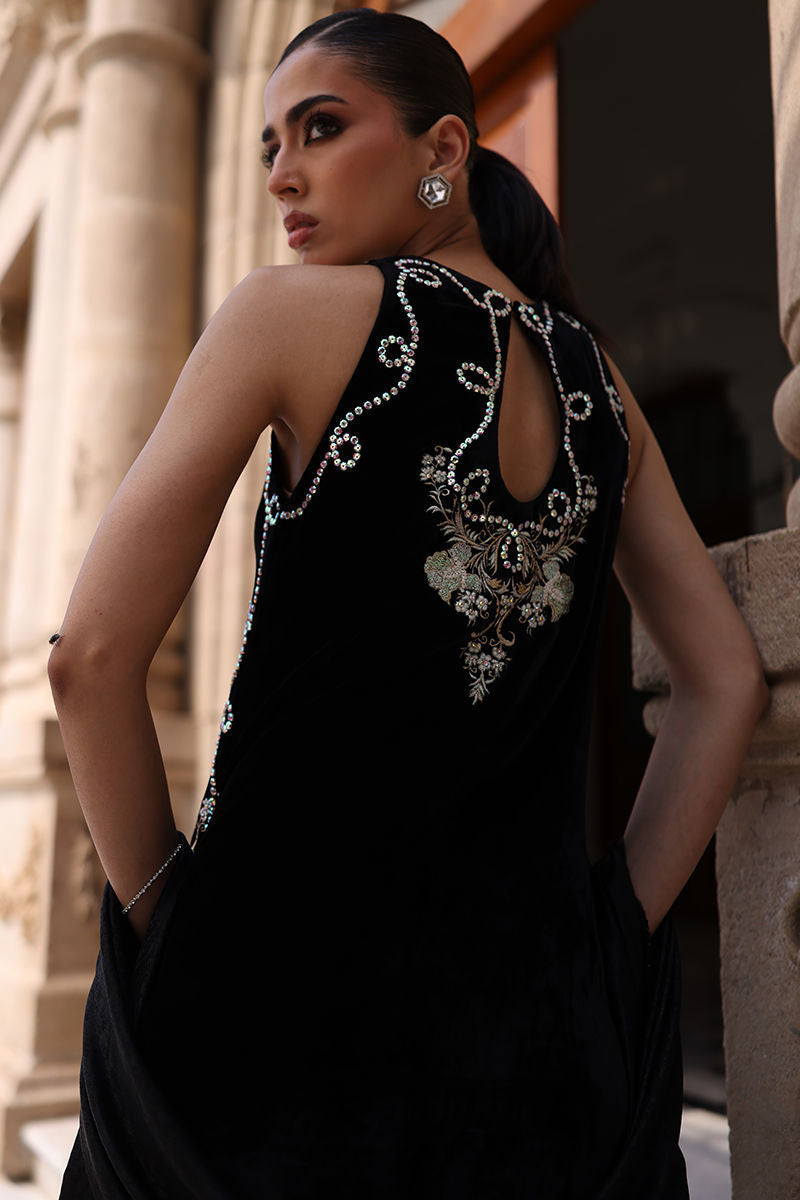 A luxurious black kaftan crafted from pure velvet, intricately hand-stitched with exquisite stone work, zari, resham, cutdana, sequins, dabka, and nakshi detailing on the front, back, and sleeves. The design features a flattering silhouette with functional pockets, paired with a graceful shrug made from Sachi silk for an added layer of sophistication. Complemented with culottes in soft cotton charmeuse, this ensemble beautifully balances opulence with comfort — an ideal statement piece for timeless festive elegance.