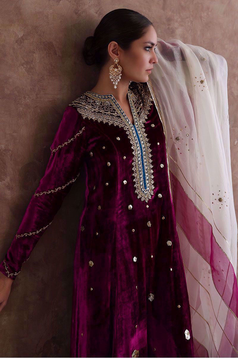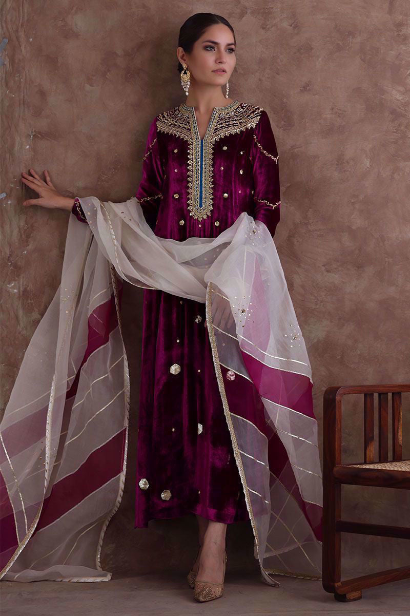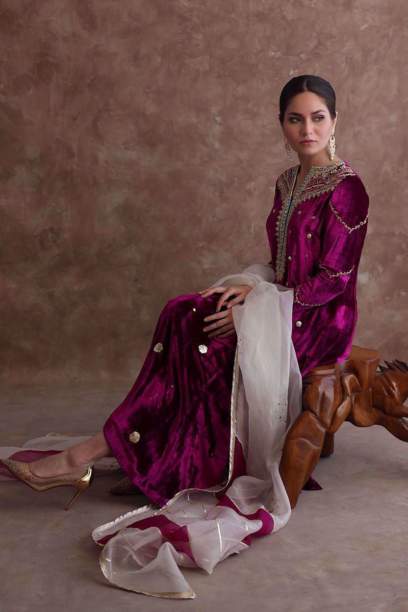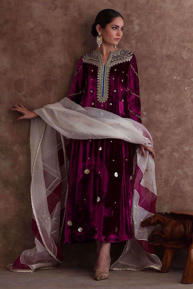 Pure velvet festive fuchsia long shirt beautified with intricate zardozi, naqshi, dabka, crystals and gota on neckline, further enhanced with hexagon shape gota booti all over the shirt. Ivory colored pure organza dupatta with color blocking of festive fuchsia, styled with gota and sequins work all over it and same color pure raw silk pants. *The length of the shirt is 51 inches.