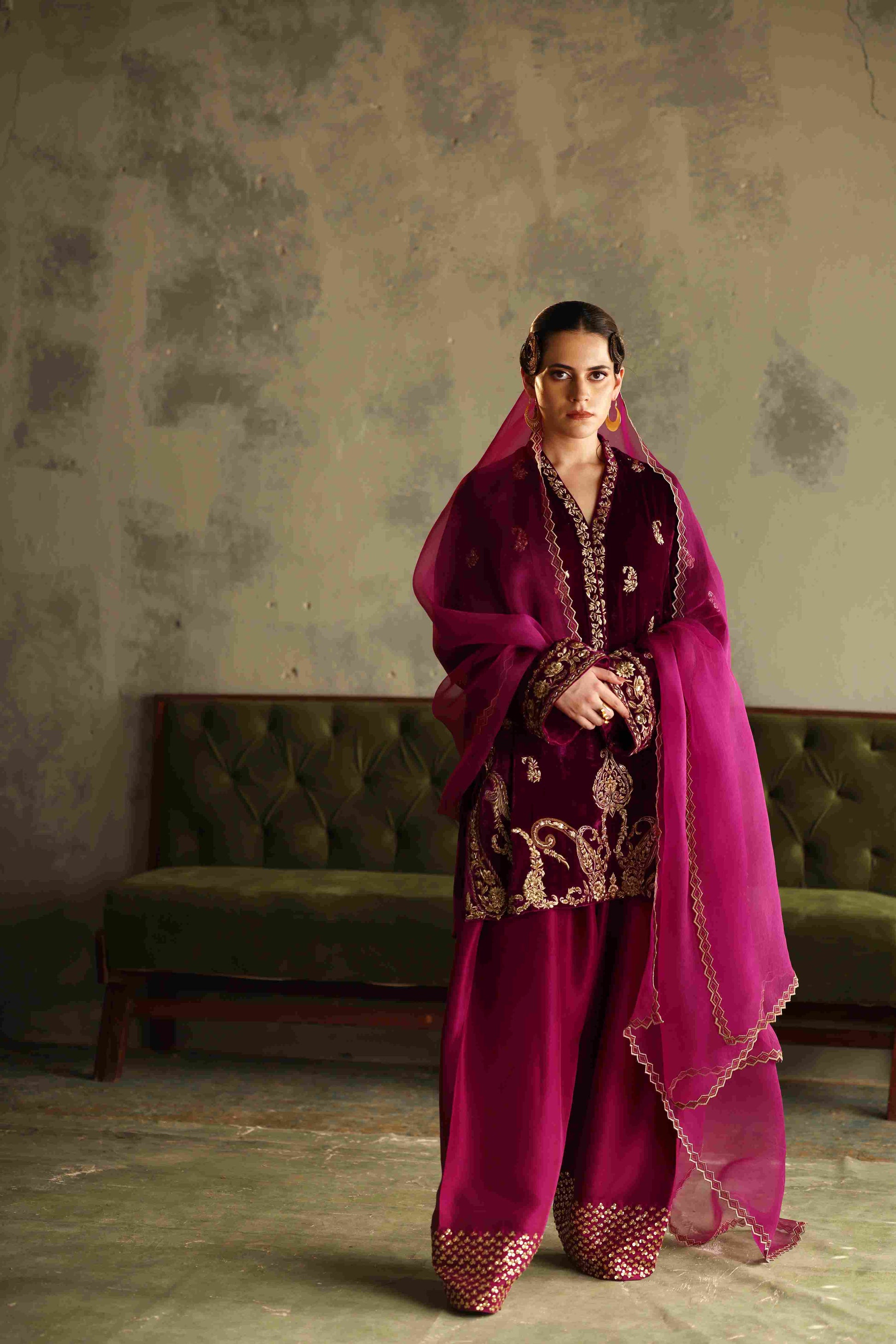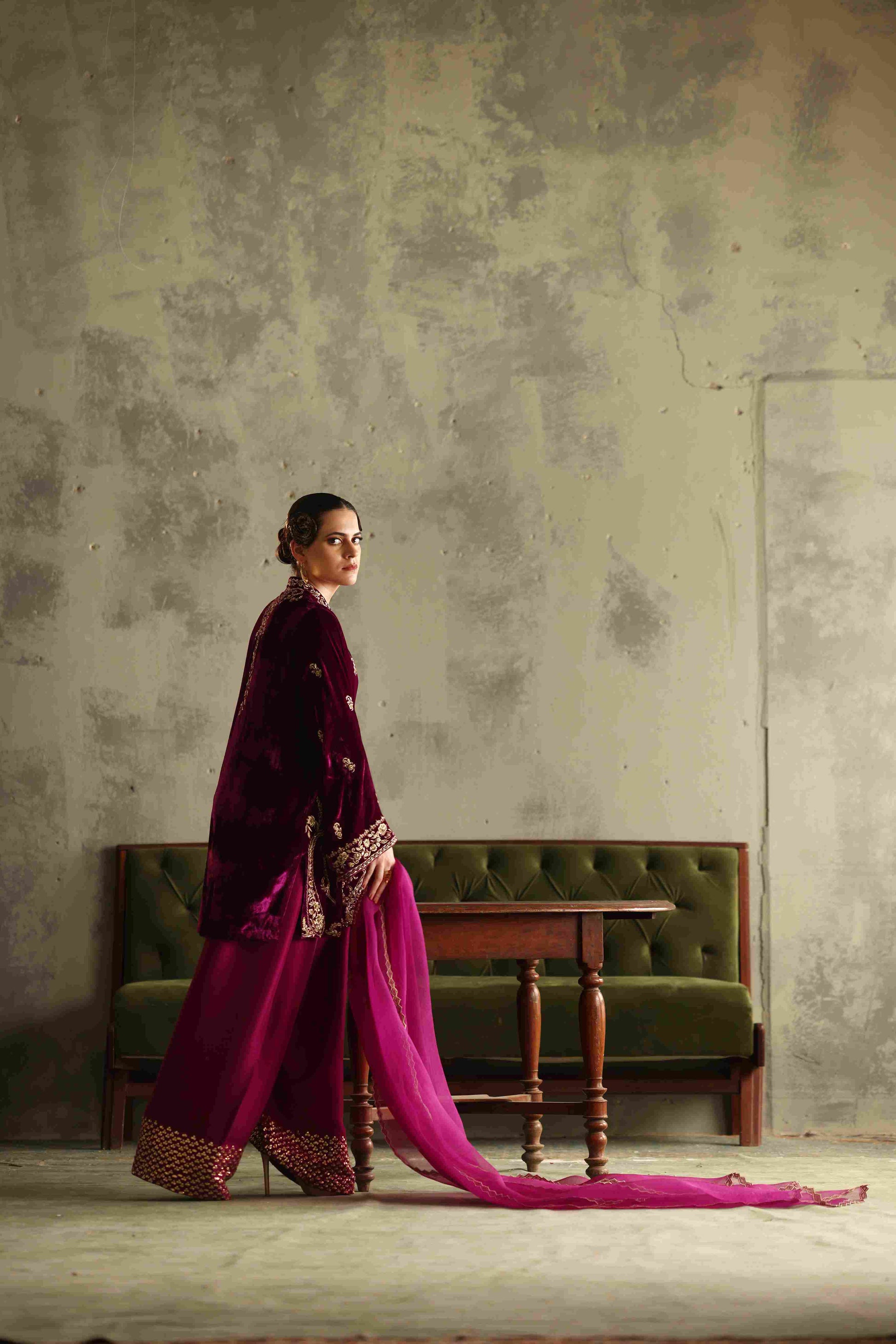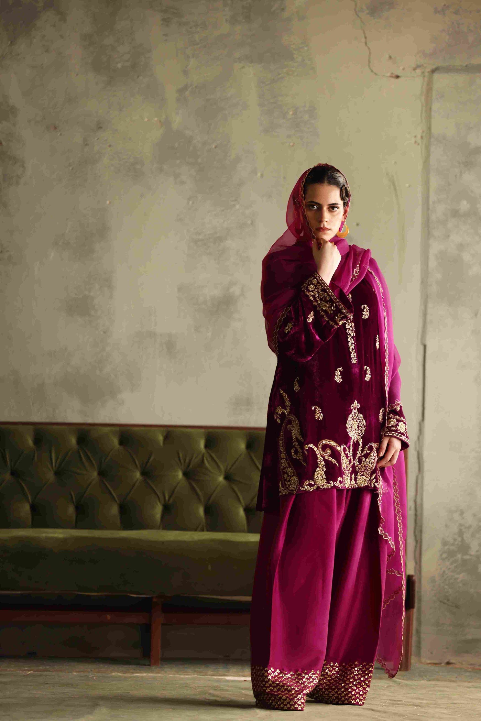 This exquisite magenta haze ensemble radiates elegance and luxury. The short kurta, is made from pure velvet and features gold and antique zari embroidery on the front, back, and sleeves, with intricate handwork of kora, dabka, sequins, tikki stones, and naqshi, creating a rich, textured finish. Paired with 42-inch pure raw silk shalwar, adorned with handwork and sequins at the hem, the set offers a perfect balance of traditional craftsmanship and modern appeal. The look is completed with a pure organza dupatta, embellished with four-sided zari scallop embroidery, and a pure velvet shawl, hand-embellished with sequins and finished with lace and Banarsi detailing, adding a luxurious final touch. The shirt length is 33 Inches. The Shalwar length is 42 Inches. Shawl length is 2.5 yards