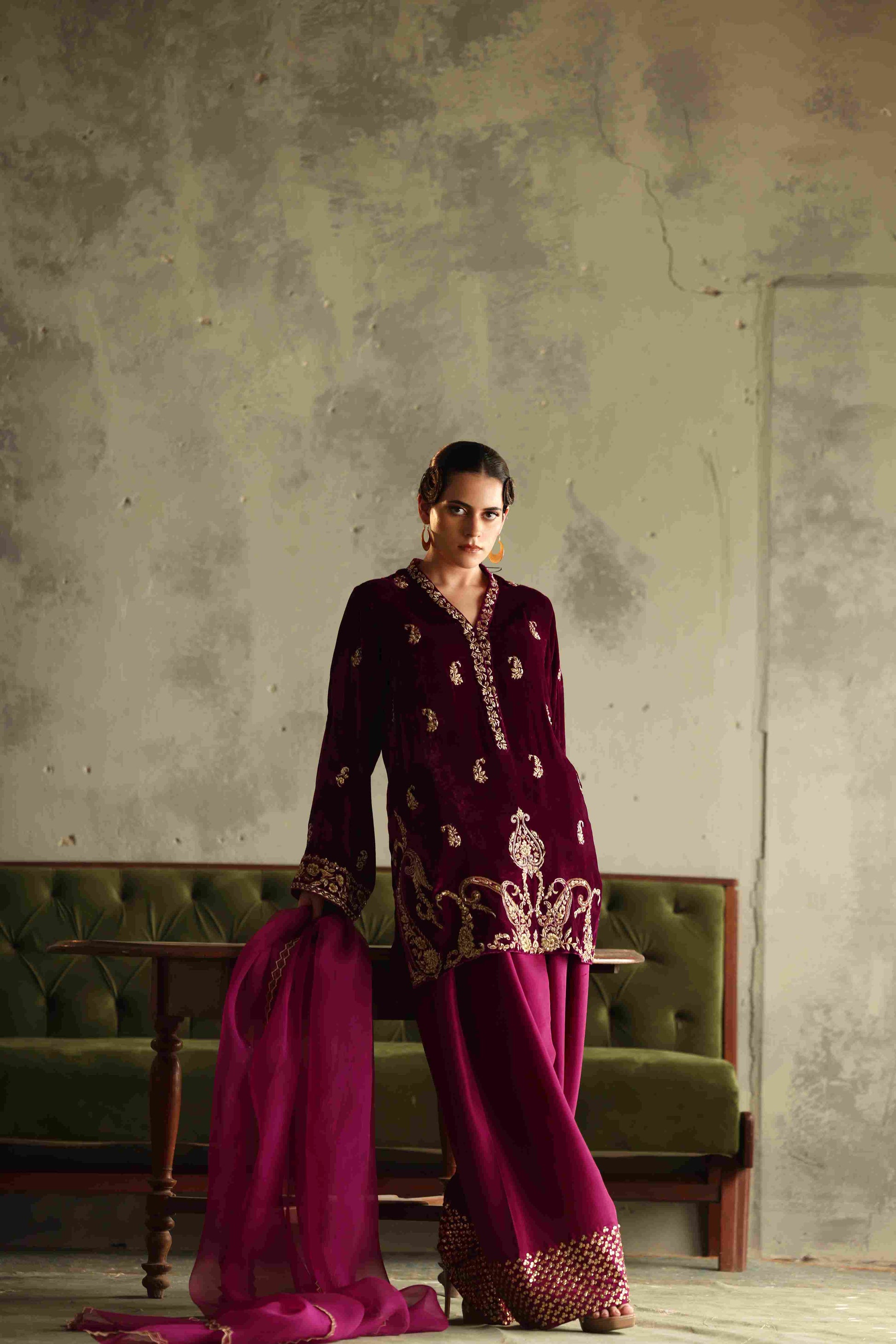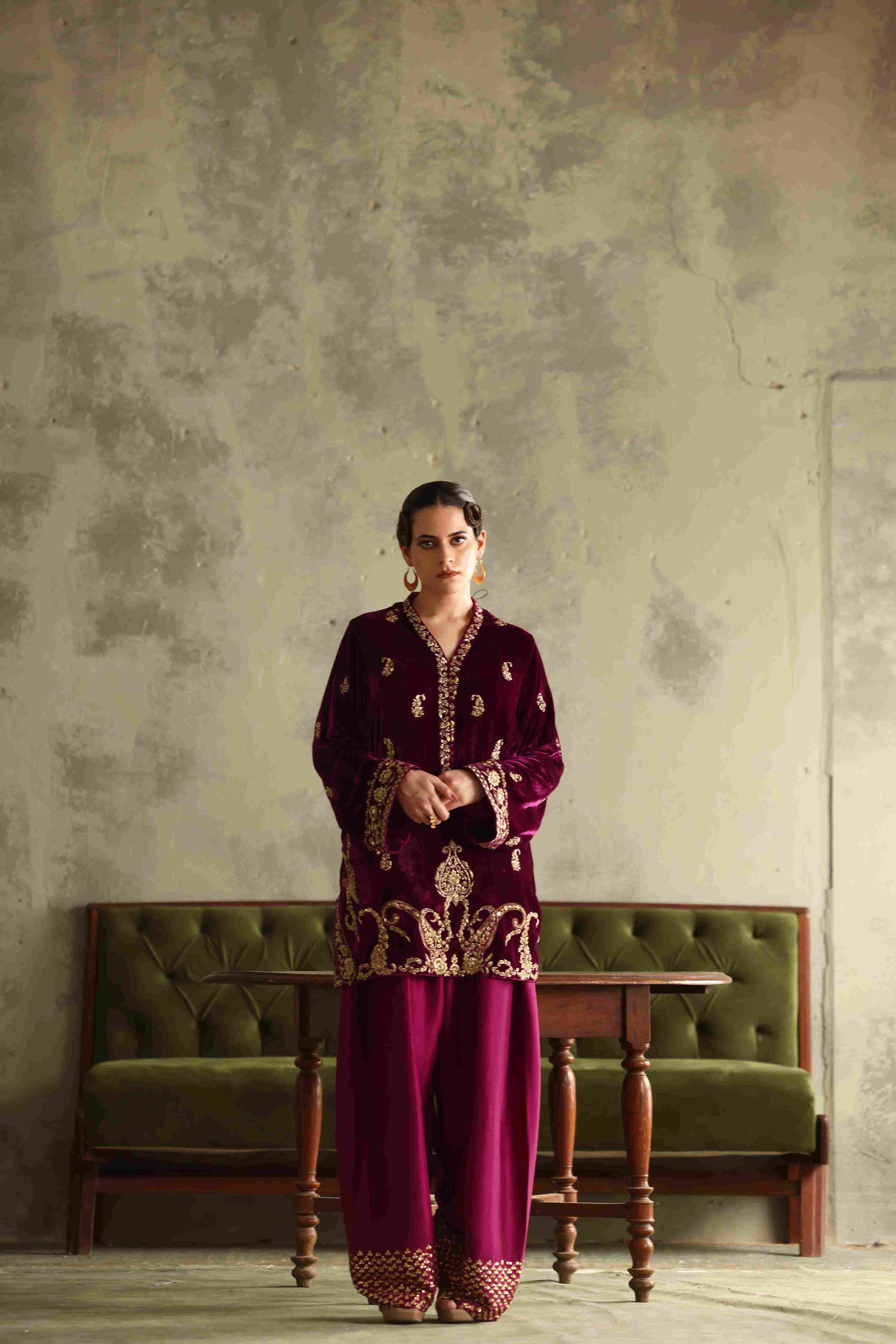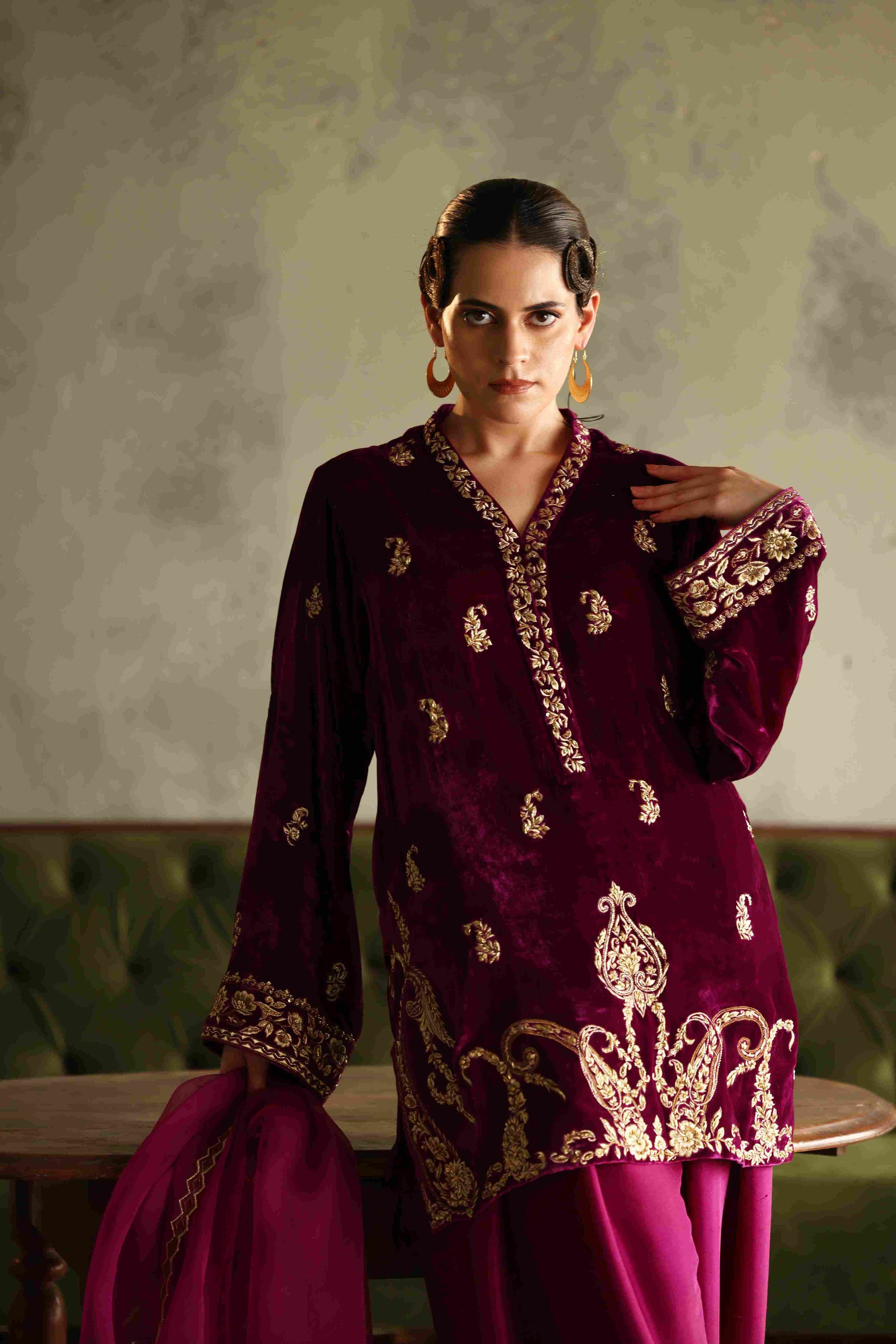 This exquisite magenta haze ensemble radiates elegance and luxury. The short kurta, is made from pure velvet and features gold and antique zari embroidery on the front, back, and sleeves, with intricate handwork of kora, dabka, sequins, tikki stones, and naqshi, creating a rich, textured finish. Paired with 42-inch pure raw silk shalwar, adorned with handwork and sequins at the hem, the set offers a perfect balance of traditional craftsmanship and modern appeal. The look is completed with a pure organza dupatta, embellished with four-sided zari scallop embroidery, and a pure velvet shawl, hand-embellished with sequins and finished with lace and Banarsi detailing, adding a luxurious final touch. The shirt length is 33 Inches. The Shalwar length is 42 Inches. Shawl length is 2.5 yards