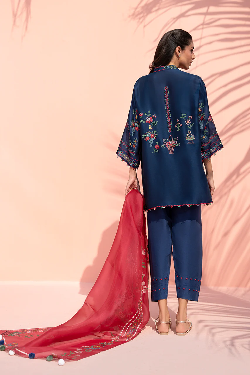 A deep navy ensemble accented with vibrant cross stitch embroidery and playful colour. The short khaddi silk shirt is adorned with delicate garden inspired motifs, framed by fine geometric borders along the neckline, sleeves, and hem. Soft pops of crimson, sage, and yellow enliven the navy canvas without overwhelming the silhouette. Paired with clean, straight pure rawsilk trousers, the look is completed with a sheer crimson organza dupatta, detailed with embroidered borders and pom pom accents for a touch of whimsical charm.